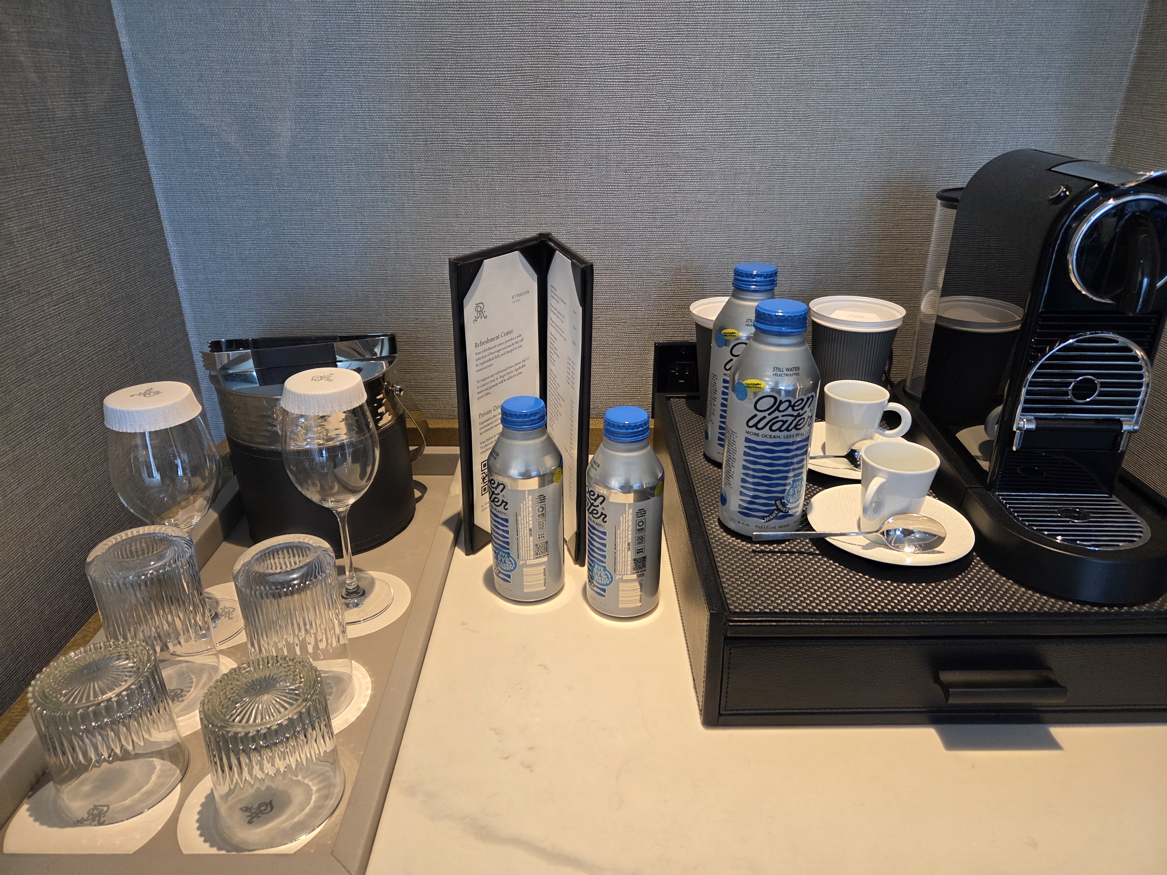 세인트 레지스 시카고 디럭스 리버뷰 객실 룸 어매니티 1 세인트 레지스 시카고의 객실에는 기본 무료 어매니티로 생수 2병, 네스프레소 캡슐 6개, 캐모마일 티와 잉글리시 브렉퍼스트 티 각각 2개가 제공됩니다. 종이컵도 제공되어서 커피를 뽑아서 나갈 수 있어 좋았지만, 함께 제공되는 에스프레소 잔의 경우 네스프레소로 추출할 때 작은 용량으로 추출하더라도 컵의 크기가 약간 작아 커피가 넘칠락 말락 할 정도까지 나온다는 점이 아쉬웠습니다.