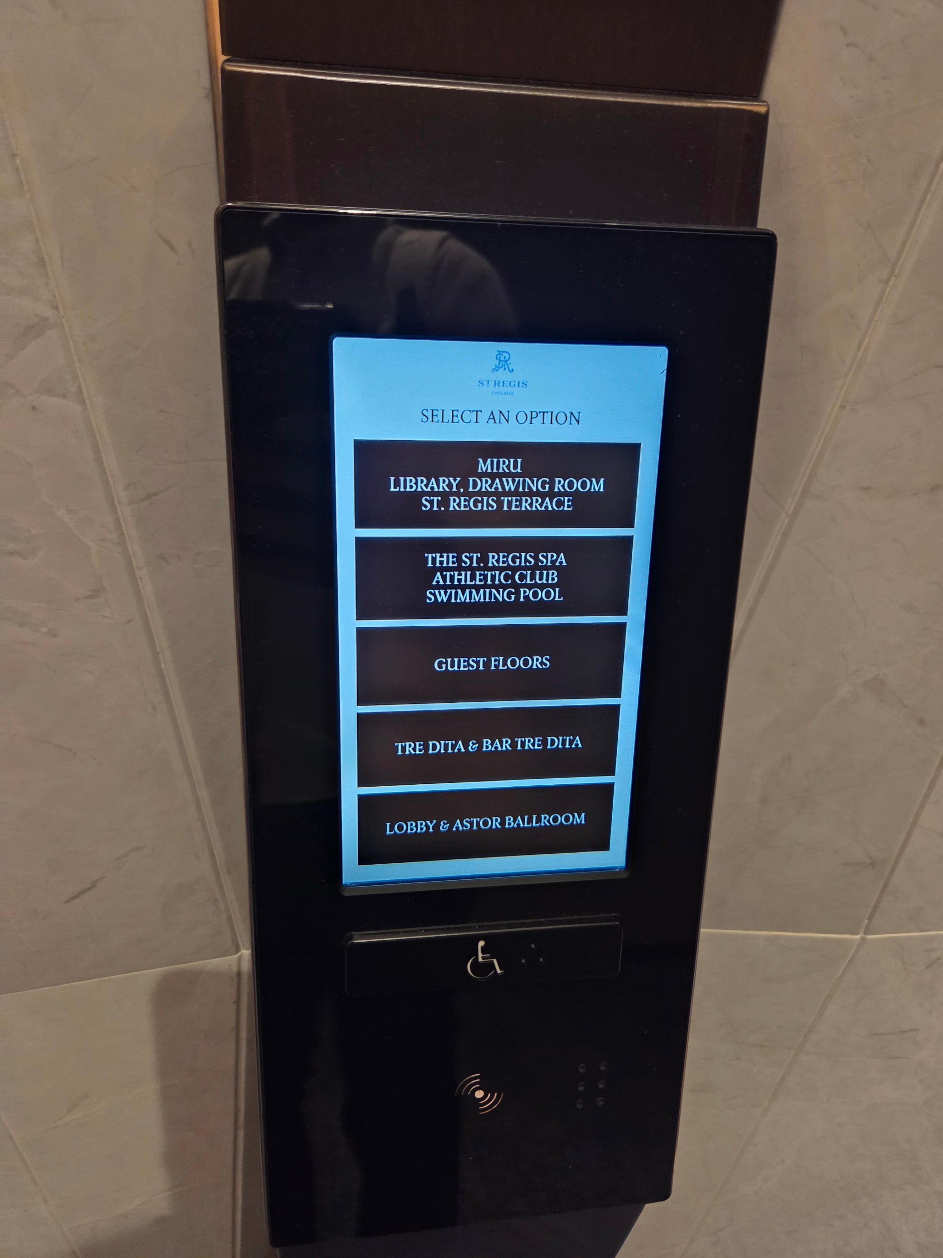 세인트 레지스 시카고 엘리베이터 세인트 레지스 시카고의 경우 엘리베이터 작동 방식이 조금은 특별했는데요, 엘리베이터에 타기 전에 엘리베이터 로비에 있는 키오스크에서 방 층수를 누르고 키패드를 찍은 후에 표시되는 엘리베이터 번호를 기억한 후 그 엘리베이터가 도착하면 타고 이동하는 방식이었습니다. 게스트 룸 출입을 제외하고는 식당이나 부대시설은 따로 표시가 되어 있어서 층수를 따로 누를 필요는 없었습니다. 본인이 탈 엘리베이터 번호가 몇 초간 표시되고 사라지기에, 이를 잘 기억하지 못하면 사람들이 많아 여러 엘리베이터가 도착할 때 헷갈리기 쉽다는 점이 불편했습니다. 엘리베이터 내에도 이동하는 층수가 표시되기는 하는데 눈에 잘 들어오지 않는 위치에 있어서 실제로 많은 분들이 잘못된 엘리베이터를 타는 걸 자주 보기도 했고요.