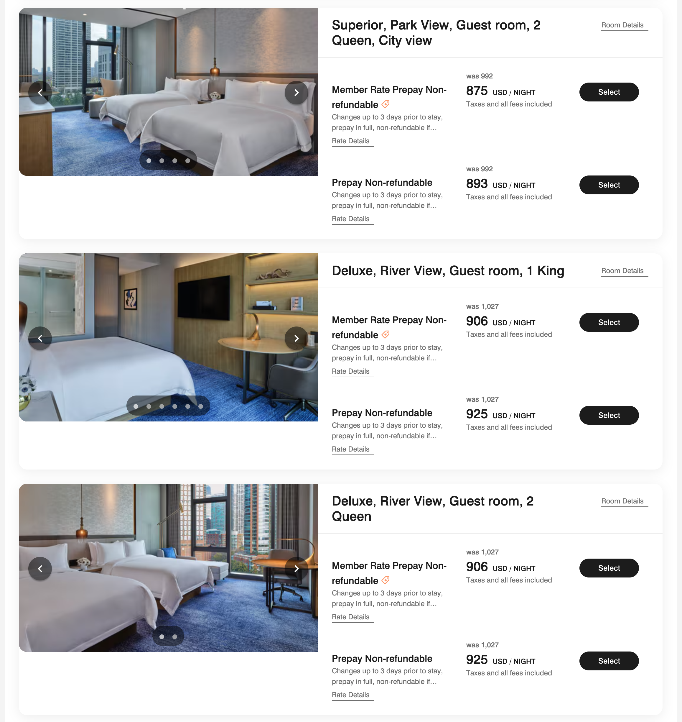 세인트 레지스 시카고 유상 숙박 요금과 포인트 숙박 요금 세인트 레지스 시카고는 약 190여개의 객실을 갖추고 있습니다. 객실들이 전부 저층에 위치하고 있기 때문에 시카고의 스카이라인을 바라볼 수 있는 전망을 갖추고 있지는 않지만, 대신 시카고 강을 볼 수 있는 리버뷰가 세인트 레지스 시카고의 시그니처 전망이라고 할 수 있습니다. 세인트 레지스 시카고의 기본룸인 슈페리어룸은 방의 넓이와 상관없이 기본적으로 뷰가 없거나 시티뷰를 가지고 있습니다. 슈페리어룸 중에서도 가장 기본룸은, 룸 타입에 따로 뷰가 표시되어 있지 않으며 이 객실들은 시카고 강을 보지 않는 반대 방향의 건물들을 마주하고 있습니다. 슈페리어 룸 중에서도 파크뷰의 경우는 세인트 레지스 시카고 뒤편의 Lakeshore East Park와 Maggie Daley Park가 보이는 뷰를 제공하며, 파크뷰와 시티뷰가 동시에 기재되어 있는 방은, 앞 건물과 공원이 동시에 보이는 뷰를 가지고 있습니다. 슈페리어 룸 보다 상위 등급인 디럭스 객실의 경우 전 객실이 시카고 강 뷰를 제공합니다. 다만 디럭스 룸은 슈페리어룸보다 방 크기가 조금 작다는 특징을 가지고 있습니다. 더 세인트 레지스 시카고의 스위트 룸을 제외한 대부분의 게스트 룸은 1 킹 게스트 룸보다 2 퀸 게스트룸이 조금 더 넓은 공간을 가지고 있습니다. 세인트 레지스 시카고는 가장 저렴한 방의 비수기 기준으로 최저가가 세금 포함 $600 달러 부근에 형성되어 있습니다.