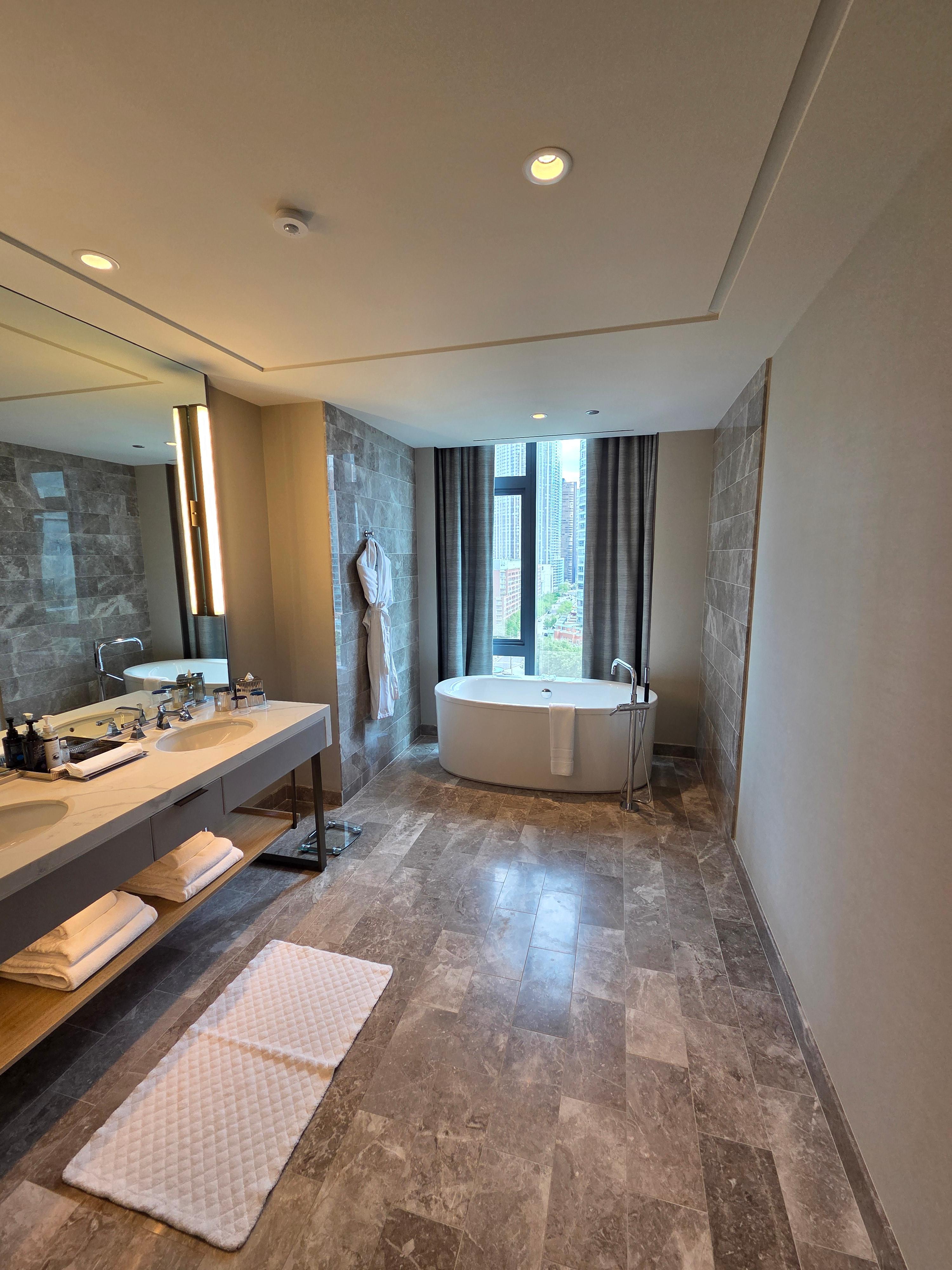 화장실에 들어서면 왼쪽으로는 밀폐된 공간의 변기와 샤워실이 있습니다. 두 공간 모두 문을 닫으면 완전 밀폐되는 형태인데요, 환풍 시스템이 잘 되어있어 화장실 냄새나 샤워 후의 습기도 금방 사라지는 점이 좋았습니다. 화장실에는 큰 거울과 함께 세면대 2개가 마련되어 있었습니다. 세면대 아래로는 충분한 수의 수건이 마련되어 있었고요. 세면대 공간은 충분히 넓었습니다. 다만 아쉬웠던 점은 세면대에 수건을 걸어놓을 수 있는 공간이 없어서 자꾸 수건을 사용하고 세면대 위에 놓다 보니 세면대 공간 활용성이 나빠진다는 점이었습니다. 화장실의 끝에는 리버뷰와 함께 욕조가 마련되어 있었습니다. 화장실이 세로로 길다 보니 리버뷰를 바라보며 욕조를 이용할 수 있다는 점이 장점이었는데요, 다만 강 건너편으로 다른 건물들과 마주 보고 있어 아무리 호텔 건물 외벽에 반사 코팅이 되어있더라도 주로 욕조를 이용하는 저녁시간에는 뷰를 감상하며 이용하기에는 힘들어 보였습니다.