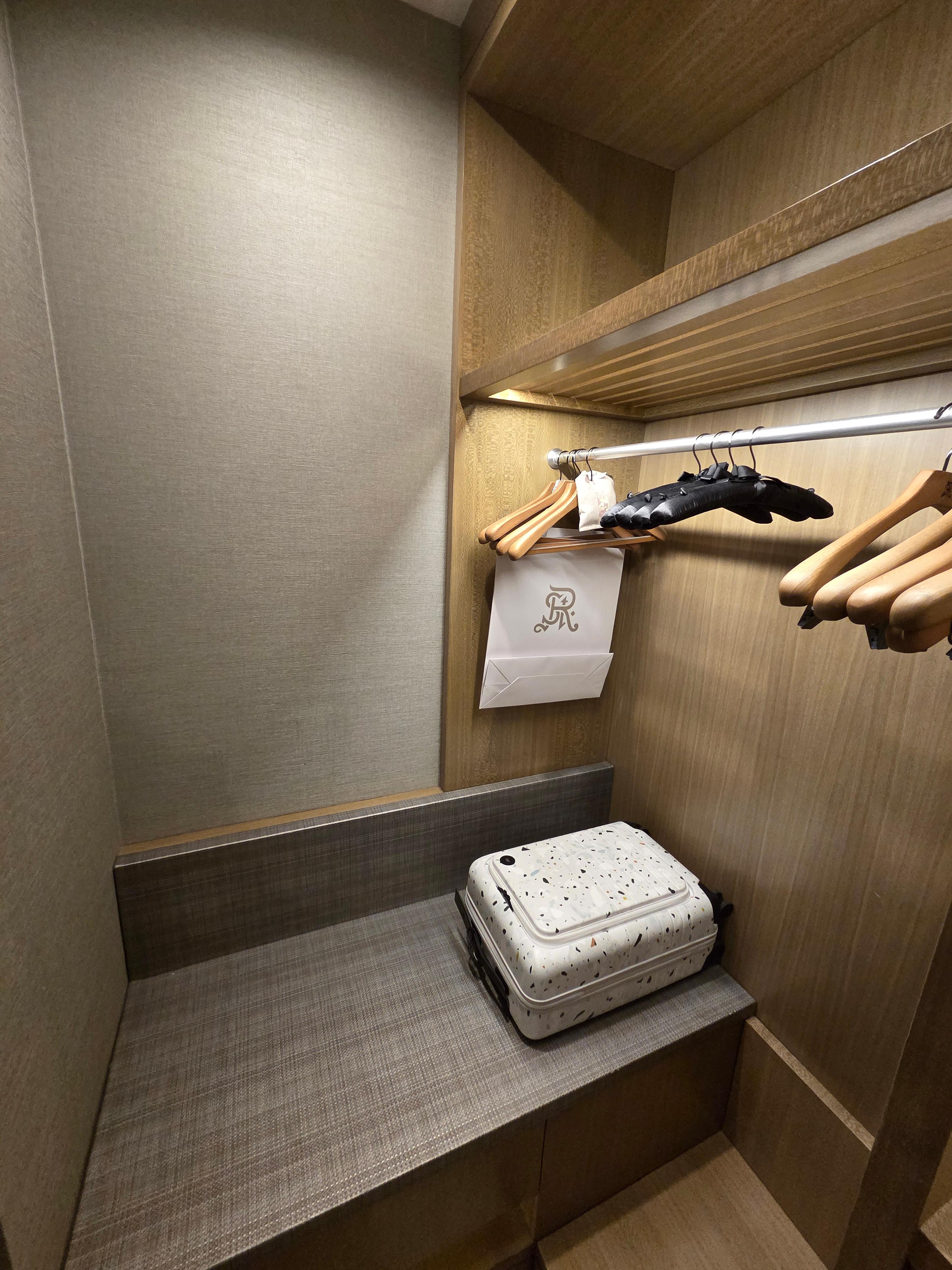 세인트 레지스 시카고 디럭스 리버뷰 객실 옷장(좌), 미니바(중), Floor Plan(우) 객실 입구 바로 오른쪽으로는 작은 옷방이 마련되어 있습니다. 옷방에는 충분한 크기의 옷장과 옷걸이가 마련되어 있었고, 그 아래로는 캐리온 수하물을 2개는 펼쳐놓을 수 있을 정도로 넓은 캐리어 받침대가 있었습니다. 침실 옆으로는 미니바가 마련되어 있었습니다. 미니바의 냉장고는 아이템을 꺼내면 자동으로 인식이 되는 형태였고, 따라서 미니바 이외의 물건을 넣는 용도로 사용하기는 힘들어 보였습니다.