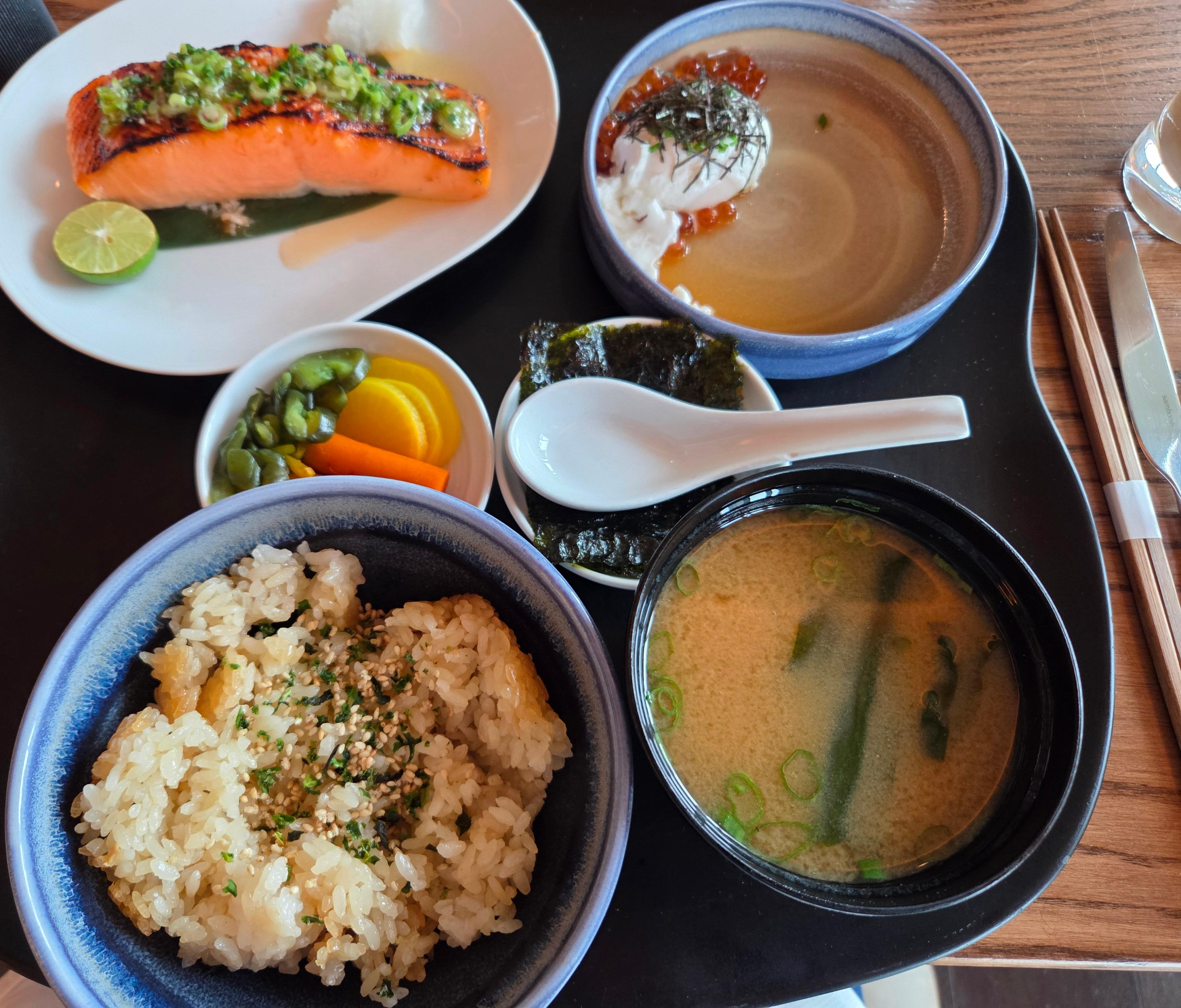 세인트 레지스 시카고 조식당 MIRU 세인트 레지스 시카고의 조식 서비스는 11층에 위치한 일식당 MIRU에서 제공됩니다. 세인트 레지스 시카고에서 투숙하며 좋았던 것 중 하나는 바로 이 일식당 MIRU였습니다. 호텔에 가게 되면 대부분의 경우 미국식 아침식사를 먹게 되는데요, 이 일식당 미루에서는 제가 개인적으로 좋아하는 일본식 아침식사를 먹을 수 있어 투숙 경험이 조금은 특별했던 것 같습니다. 이 일본식 아침식사는 Tokyo Brunch라는 이름으로 제공되는데요, 기본적으로 밥과 미소국, 절임야채, 다시 국물과 연어알이 더해진 타마고(수란), 김이 제공되고 메인 메뉴를 고르는 형태입니다. 메인 메뉴로는 연어구이, 부챗살 구이, 채식 옵션으로 시치미 가지 꼬치가 있습니다. 가격은 연어구이를 선택할 때 46달러, 부챗살 구이를 선택할 때 44달러, 가지꼬치를 선택할 때는 32달러로 아침식사로는 가격대가 있는 편입니다.