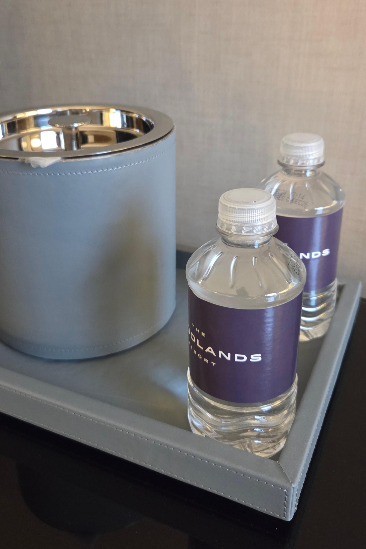 더 우드랜즈 리조트 큐리오 컬렉션 바이 힐튼 객실 침대 맞은편으로는 TV와 책상, 의자가 있었습니다. 책상과 의자는 노트북을 이용하기에 알맞았습니다. 책상 위에는 아이스 버킷과 함께 물 2병이 제공되었습니다. 참고로 이 물 2병은 리조트 피에 포함되어 있는 물이라는데, 원래 힐튼 계열 호텔은 힐튼 아너스 실버 등급 이상이면 물을 무료로 제공하기에 리조트 피에 물 2병이 포함되어 있는 것 자체가 조금은 요식행위인 느낌도 들었습니다.