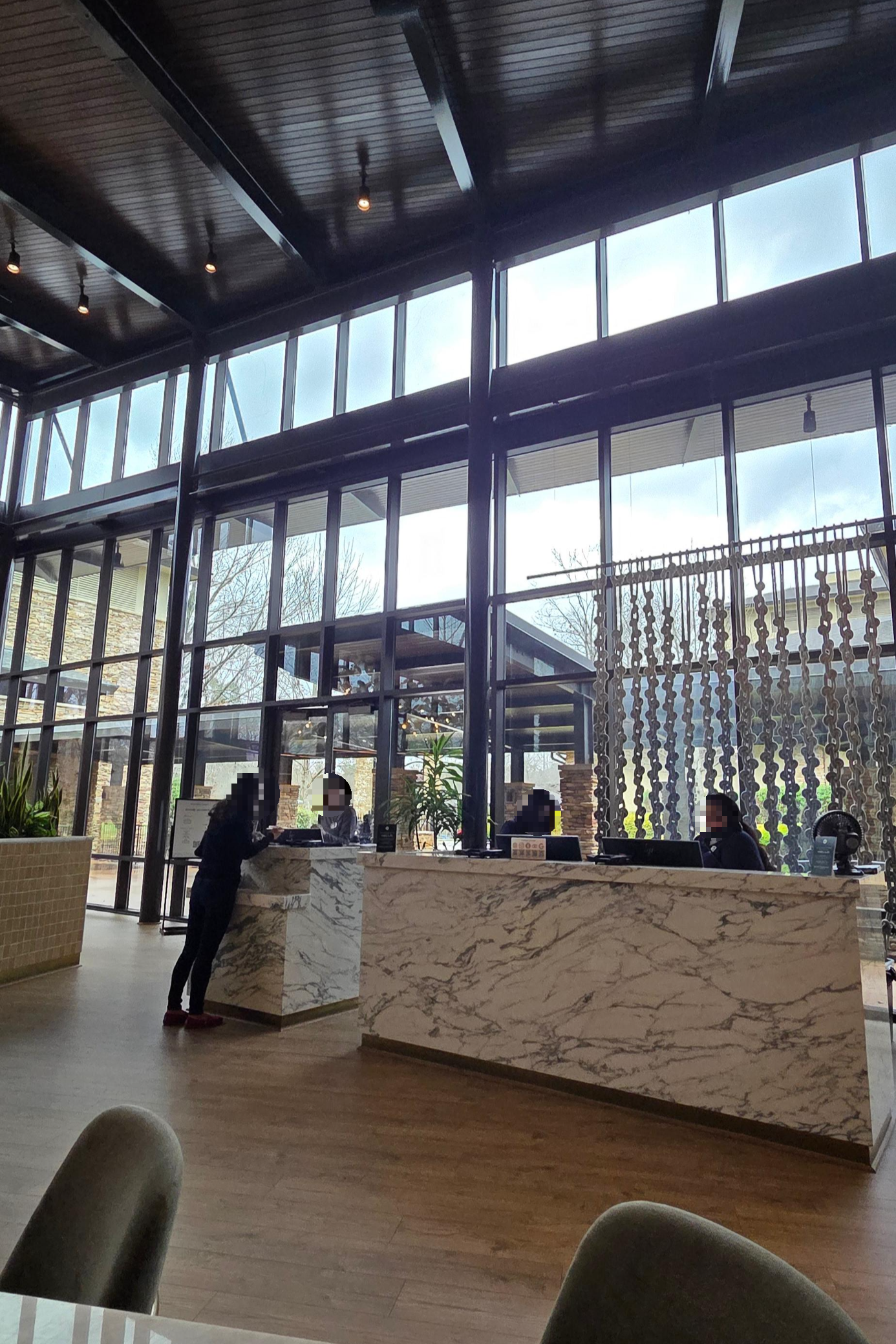 더 우드랜즈 리조트 큐리오 컬렉션 바이 힐튼 로비 호텔 건물에 들어가면 오른쪽에 호텔 로비가 위치해 있습니다. (왼쪽은 객실로 가는 길입니다.) 호텔 로비에는 3개의 체크인 카운터와 더불어 라운지, 라운지 바가 마련되어 있습니다. 호텔 로비는 층고가 높아서 탁 트인 느낌을 주고, 철골구조와 유리창으로 마감되어 있어 모던한 느낌을 주면서도 반대쪽 벽은 돌로 마감되어 있고, 한편에는 벽난로가 있어서 따뜻한 느낌을 주기도 합니다. 원래 호텔의 정규 체크인 시간은 4시이지만, 2시 30분 정도에 호텔에 도착해서 체크인을 할 수 있었습니다.