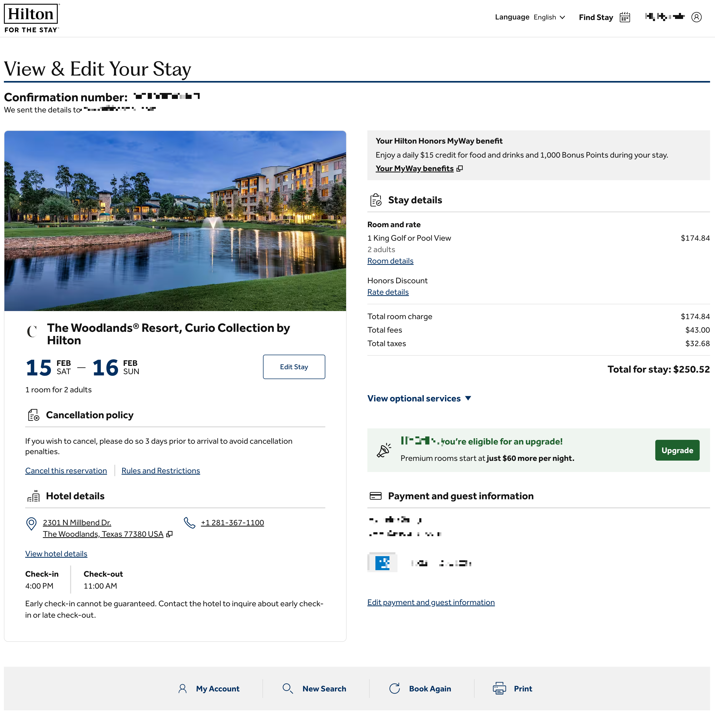 더 우드랜즈 리조트 큐리오 컬렉션 바이 힐튼 가격과 예약내역 저는 숙박 4일 전에 예약을 했고 가장 기본 방 중 하나인 1 킹 베드 골프장 또는 수영장 뷰를 예약했습니다. 숙박을 얼마 남겨놓지 않고 예약했음에도 불구하고 비수기였기에 비싸지는 않았습니다. 텍스와 리조트 피를 포함해 총 $250.52에 예약을 했습니다. 참고로 더 우즈랜드 리조트 큐리오 컬렉션 바이 힐튼은 방 값 중 리조트 피와 세금이 비싼 편으로 $250.52 중에 방값은 $174.84이고 리조트피와 세금이 $75.68로 세금과 리조트 피가 약 30%에 달합니다. 물론, 리조트 피는 $43 고정 가격으로 룸 레이트가 올라간다고 비례해서 올라가지는 않습니다.