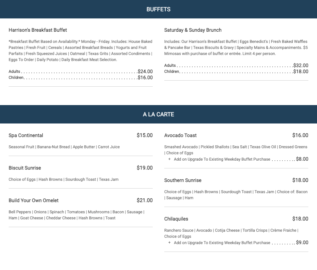 더 우드랜즈 리조트 큐리오 컬렉션 바이 힐튼 조식 메뉴 더 우드랜즈 리조트의 조식은 컨퍼런스 룸들이 위치한 건물에 있는 식당 Harrison’s에서 이루어집니다. 이 식당이 있는 건물은 실내로 이어져있지는 않고 외부로 나가 이동해야 하는 번거로움은 있습니다. 기본적으로는 조식 뷔페 형식으로 제공되며 단품으로 주문할 수 있는 알라카르테 메뉴도 있습니다. 토요일과 일요일에는 브런치 메뉴도 있는데 조식 뷔페와 더불어 다른 단품메뉴도 시킬 수 있습니다. 조식당은 주중에는 오전 7시부터 오전 11시까지, 주말에는 오전 7시부터 오후 1시까지 운영되며 가격은 성인 기준 조식 뷔페는 $24, 주말 브런치는 $32입니다.