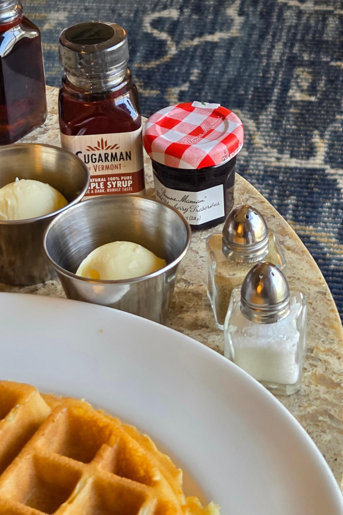 더 우드랜즈 리조트 큐리오 컬렉션 바이 힐튼 조식 룸서비스 메뉴 저는 이번에는 인 룸 다이닝을 이용해 봤습니다. 인 룸 다이닝은 QR코드 또는 전화로 주문할 수 있으며 오전 7시부터 오전 11시까지 운영됩니다. 인 룸 다이닝 조식 메뉴로는 아보카도 토스트, 아메리칸 브렉퍼스트, 와플, 프렌치토스트, 팬케이크, 오믈렛 등이 있으며 가격은 $16~$20 사이입니다. 다만 인 룸 다이닝을 이용하면 배달료와 더불어 서비스 요금도 따로 부과되고 팁도 주어야 하기 때문에 2명이서 메뉴 하나를 시켜도 $40~50 정도는 쉽게 나옵니다. 저는 이번에는 아메리칸 브렉퍼스트(사우선 선라이즈)와 와플, 팬케이크를 주문했습니다.