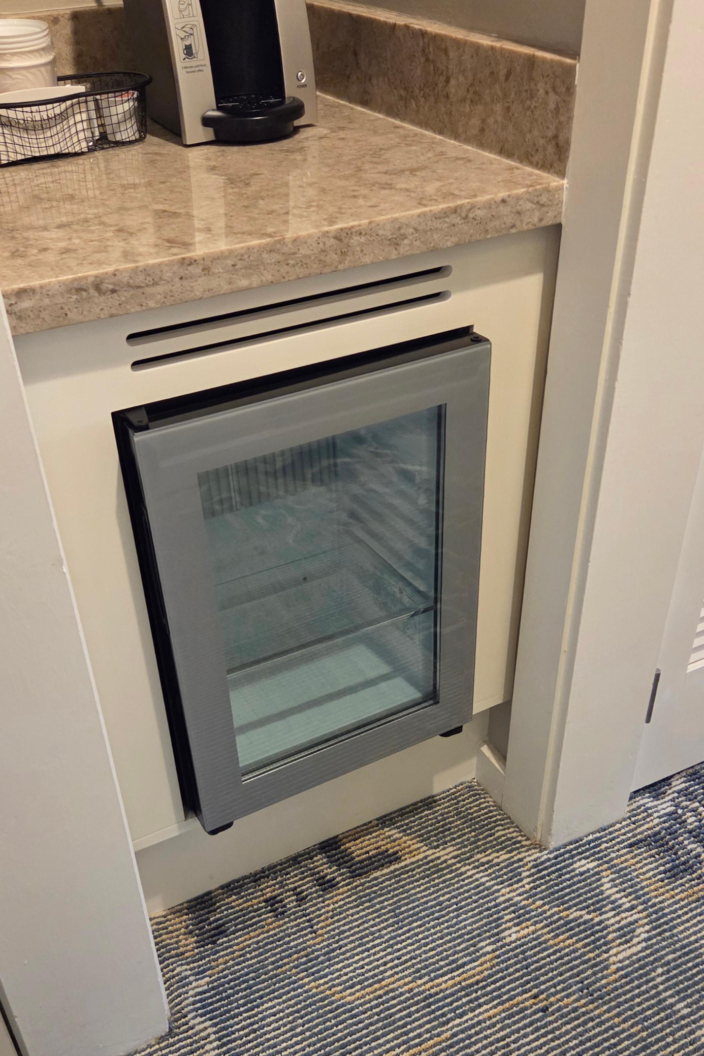 더 우드랜즈 리조트 큐리오 컬렉션 바이 힐튼 커피머신과 옷장 객실 문 근처에는 냉장고와 함께 큐리그 커피 머신이 있었습니다. 미국 호텔들을 다녀보면서 느낀 건데, 네스프레소 머신을 사용하면 최고급 호텔, 큐리그 머신을 사용하면 좋은 호텔, 네스프레소도 아니고 큐리그도 아닌, 다른 이상한 커피머신을 사용하면 동네 호텔 같은 느낌이 있습니다. 냉장고에는 아무것도 없었지만 생각보다 엄청 시원하지는 않아서 아쉬웠습니다. 옷장에는 충분한 양의 옷걸이와 다림판과 다리미, 금고 등이 있었고요.