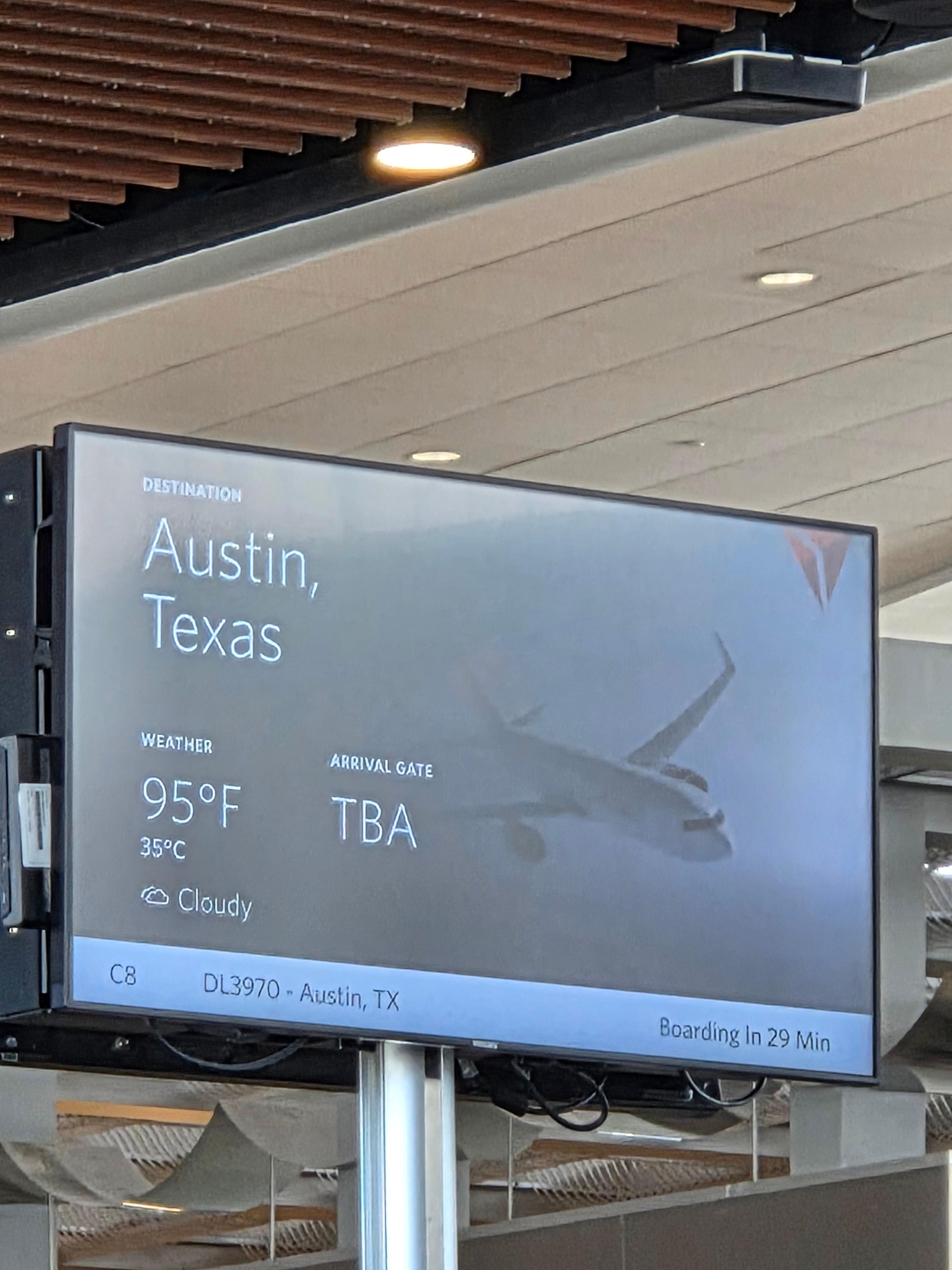 - DL3970, MSY(미국 루이 암스트롱 뉴올리언스 국제공항) → AUS(미국 오스틴 버그스트롬 국제공항), 17:09 → 18:54, Duration 1h 45m