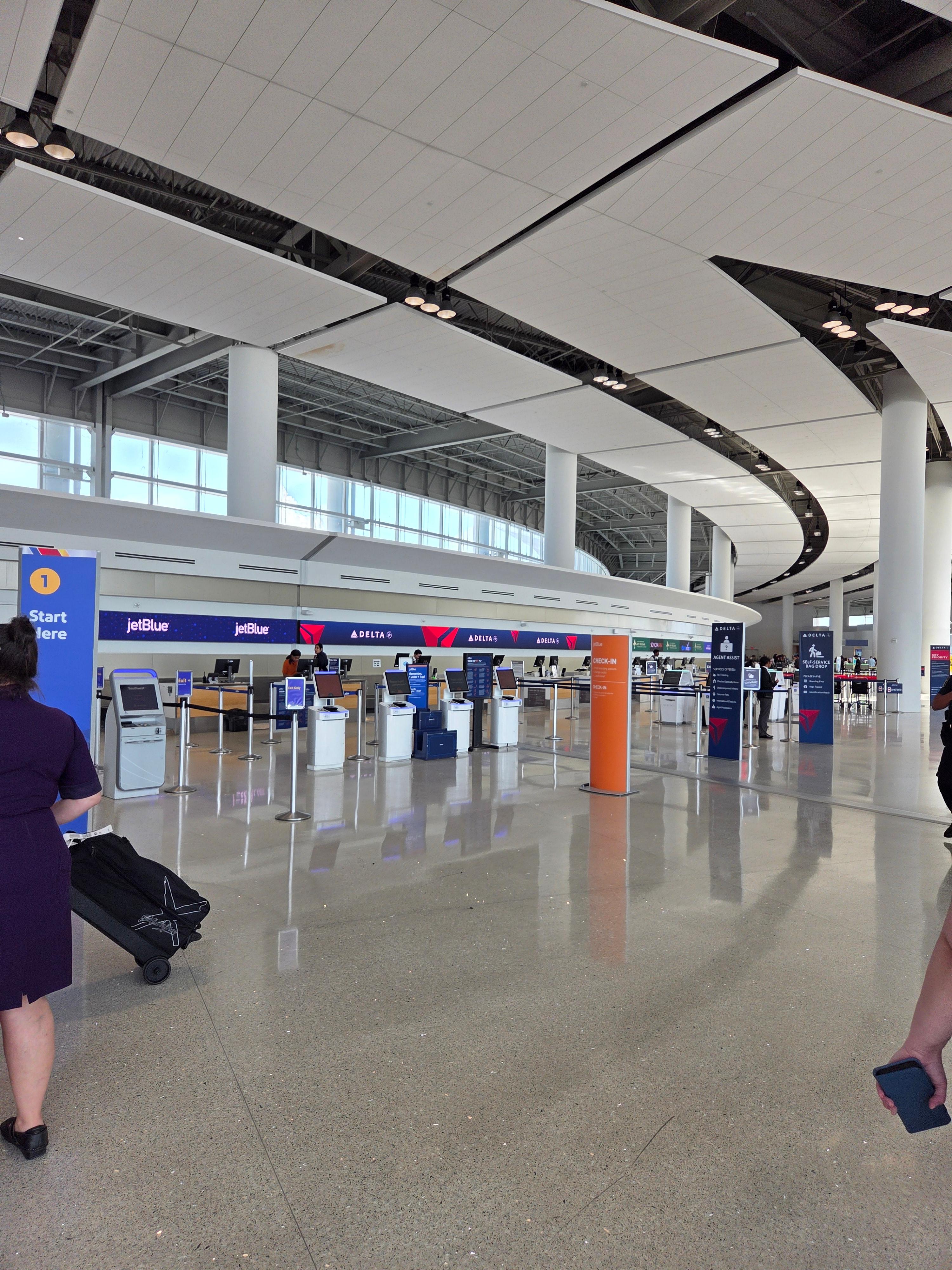 오스틴 공항은 메인 터미널인 바바라 조던 터미널(Barbara Jordan Terminal) 서브 터미널인 사우스 터미널(South Terminal)로 구성되어 있습니다. 델타항공의 체크인 카운터는 바바라 조던 터미널의 동편 2층에 위치해 있습니다. 바바라 조던 터미널과 사우스 터미널은 물리적으로 꽤 멀리 떨어져 있어 두 터미널 사이를 이동하는 데에 최소 30분 정도가 걸리기 때문에 처음부터 정확한 터미널을 찾아가는 게 중요합니다. 델타항공의 경우 오스턴 공항에서 낮은 번호의 게이트를 주로 사용하기 때문에 (주로 1번 ~ 10번 게이트) 체크인을 하고 체크인 카운터 왼쪽에 위치해 있는 1번 시큐리티 체크포인트를 이용하시면 최단거리로 게이트까지 이동하실 수 있습니다. 단, TSA Pre 체크포인트는 건물 중앙의 2W 체크포인트를 통해야 하기 때문에 게이트까지의 동선이 조금 더 길어집니다. (오스틴 공항 인터렉티브 지도 링크)