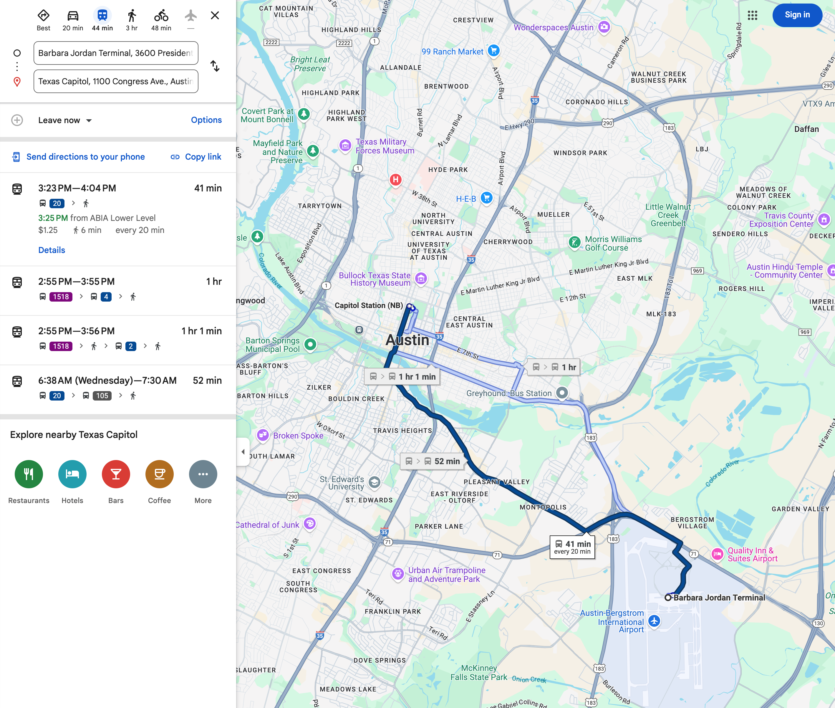 뉴올리언스 공항에서 다운타운으로 가는 경로(좌), 오스틴 공항에서 다운타운으로 가는 경로(우)