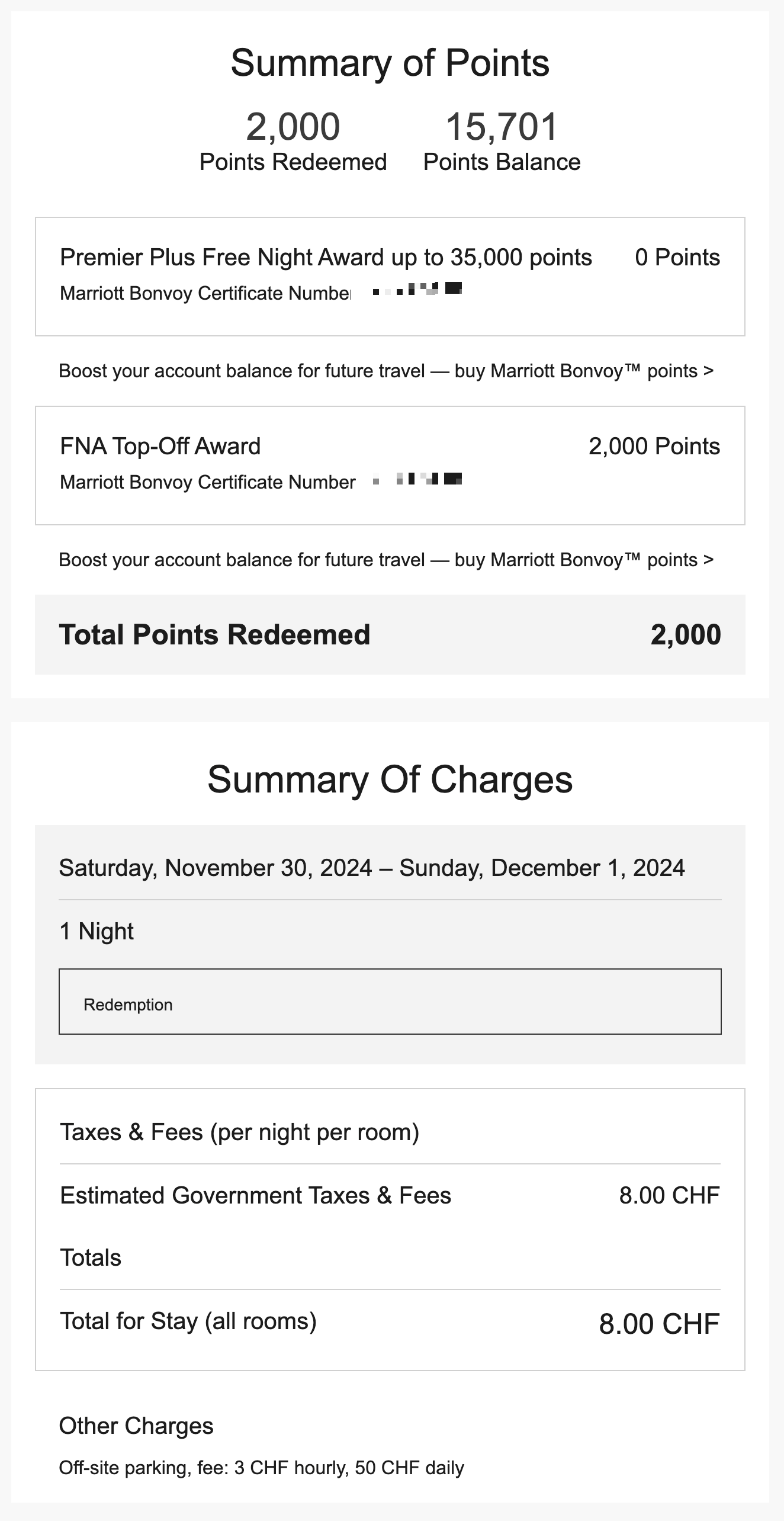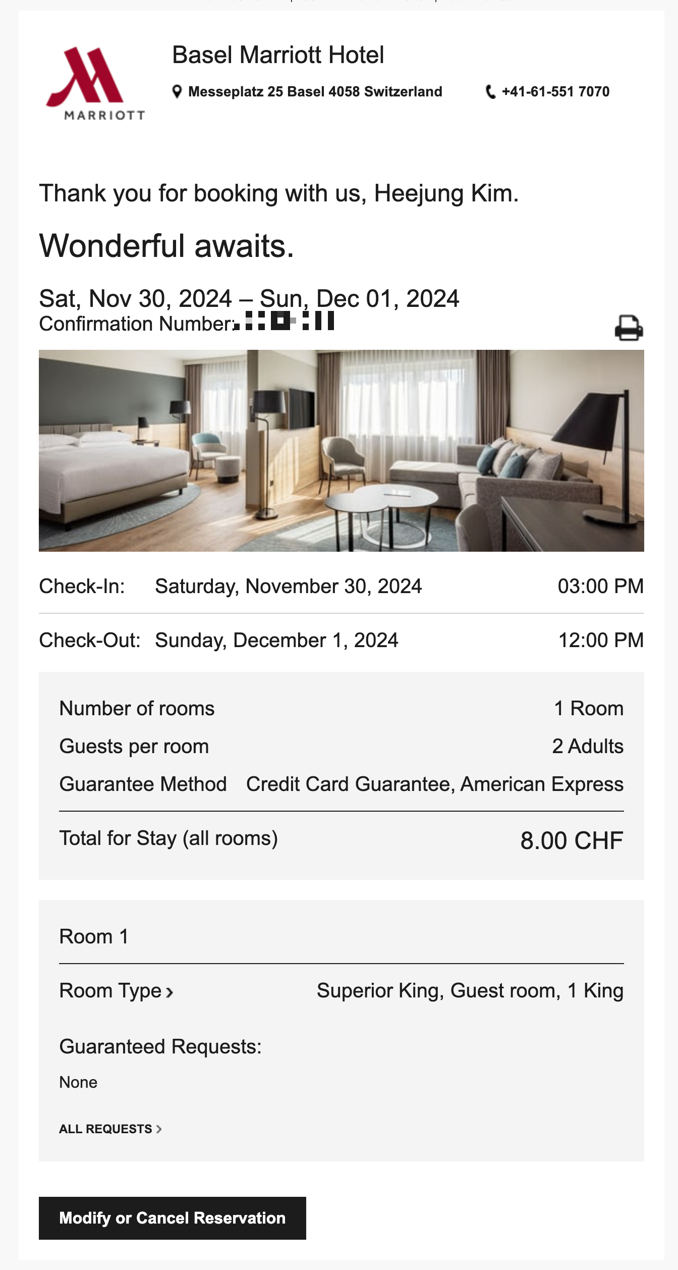 저는 가장 기본 방인 Superior King, Guest room, 1 King을 메리어트 35,000 포인트 숙박권에 2,000 포인트를 더해 총 37,000포인트에 숙박했습니다. 이 숙박권은 메리어트 본보이 더 베스트 신한카드에서 연 100만 원 사용 시 매년 1번씩 주는 숙박권과 같은 숙박권이며 15,000 포인트를 더해 최대 50,000 포인트가 필요한 1박 숙박까지 사용할 수 있습니다. 메리어트 바젤에서 숙박권을 사용할 시 약 8 스위스 프랑이 세금으로 부과됩니다. 제가 숙박할 때는 한화로 약 13,000원 정도였습니다. 참고로 메리어트 본보이 회원이 포인트를 이용해 숙박을 할 때 5박을 연달아 숙박을 하면 5박 중 포인트 가격이 가장 저렴한 하루는 무료로 제공을 해주는 ‘Stay for 5, Pay for 4’ 혜택 저는 4+1 혜택이라고 부릅니다)을 이용할 수 있습니다. 반드시 숙박권이 포함되지 않은 ‘포인트’로만 5박을 연달아 예약을 해야 한다는 점 참고하세요.