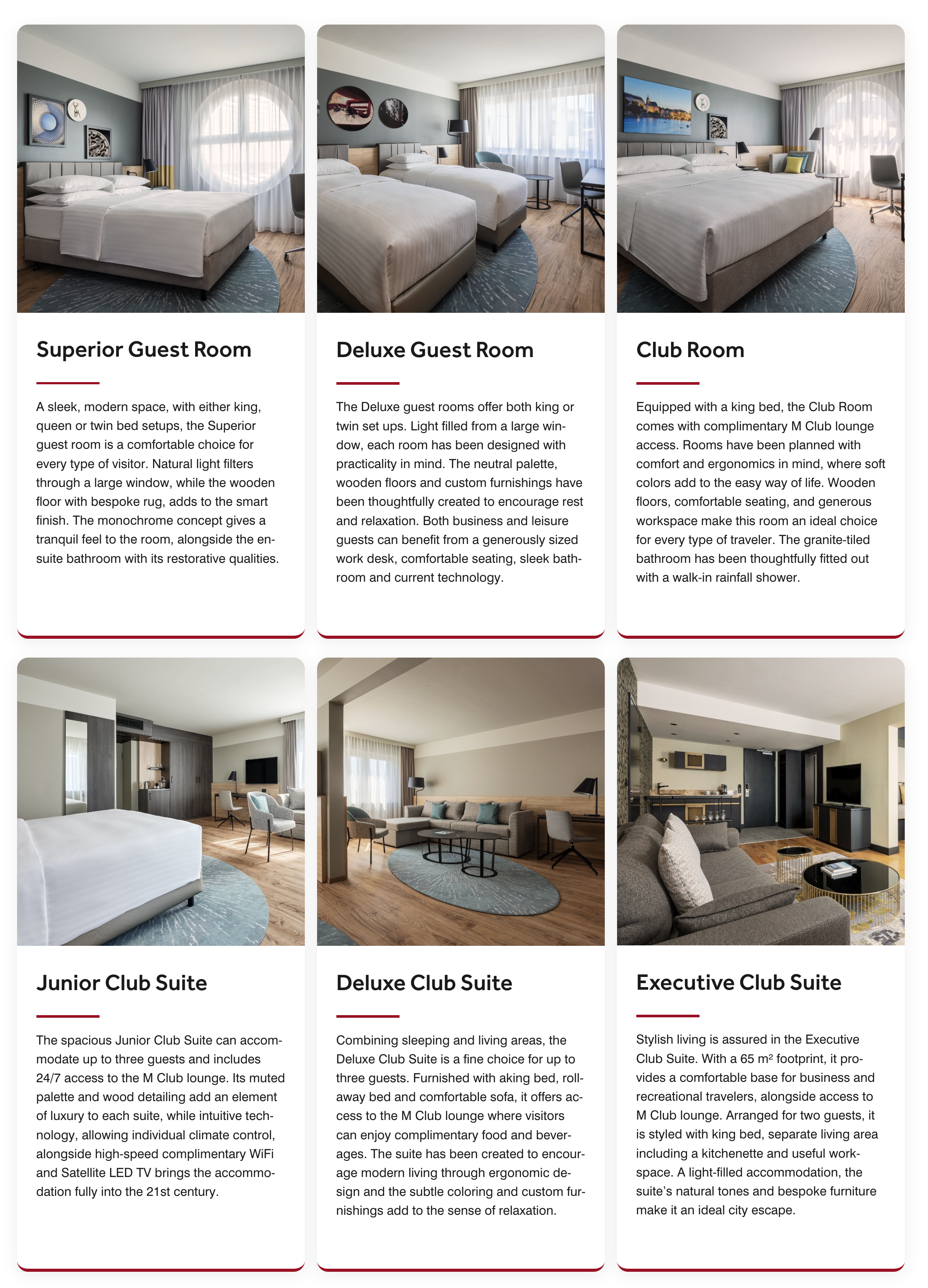 메리어트 바젤의 일반 방은 크게 3가지 종류가 있습니다. 가장 기본방은 수피리어(Superior) 룸으로 넓이는 약 21제곱미터에 Standard Rates 기준 약 32만 원 정도부터 시작합니다. 그다음 등급의 방은 디럭스(Deluxe) 룸으로 넓이는 22 제곱미터에서 36 제곱미터로 다양하며 가격은 약 40만 원 정도부터 시작하고요, 그다음은 디럭스 룸에 클럽 라운지 입장이 포함된 클럽(Club) 룸입니다. 방은 디럭스 룸과 같고 라운지 입장이 포함된다는 점만 다르고요, 가격은 약 52만 원부터 시작합니다. 이 기본방들의 침대는 킹 사이즈 침대 1개 또는 트윈 사이즈 침대 2개에서 고를 수 있으며 이에 따른 가격 차이는 없습니다. 스위트 룸은 총 4가지 종류(주니어, 디럭스, 이그제큐티브, 프레지덴셜)가 있으며 가장 작은 주니어 스위트가 약 100만 원부터, 최상위 스위트인 프레지덴셜 스위트가 약 600만 원부터 시작합니다. 스위트 룸은 모두 클럽 라운지 입장이 포함되어 있습니다.