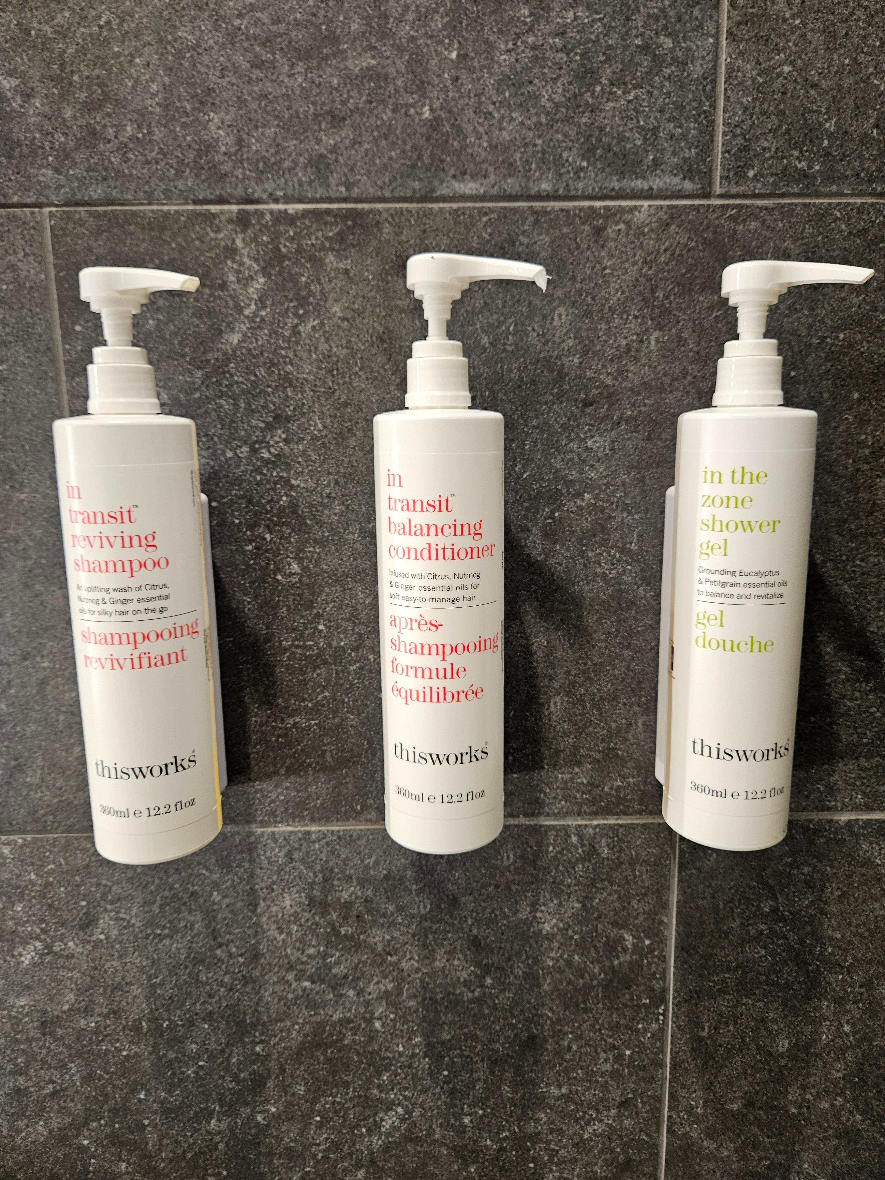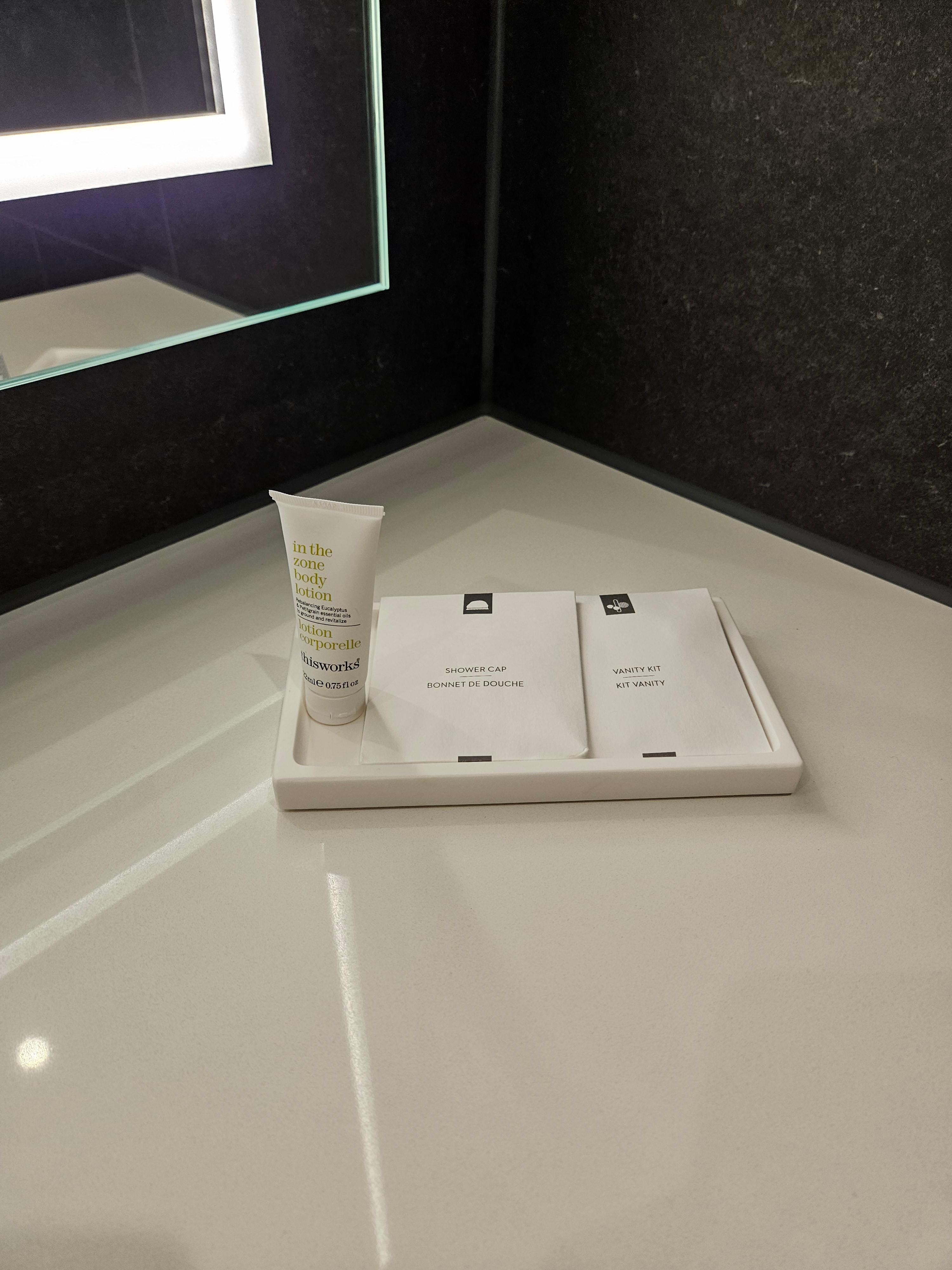 화장실 어매니티로는 메리어트 호텔에서 사용하는 In Transit 제품이 비치되어 있었습니다. 샴푸, 컨디셔너, 샤워 젤은 대용량으로 제공되었고, 비누와 바디 로션을 일회용으로 제공되었습니다. 그 외에는 샤워 캡과 면봉과 화장솜이 든 베니티 킷이 제공되었습니다. 치약이나 칫솔, 면도기는 찾아볼 수 없었고 요청 시 카운터에서 유료로 제공되었습니다.