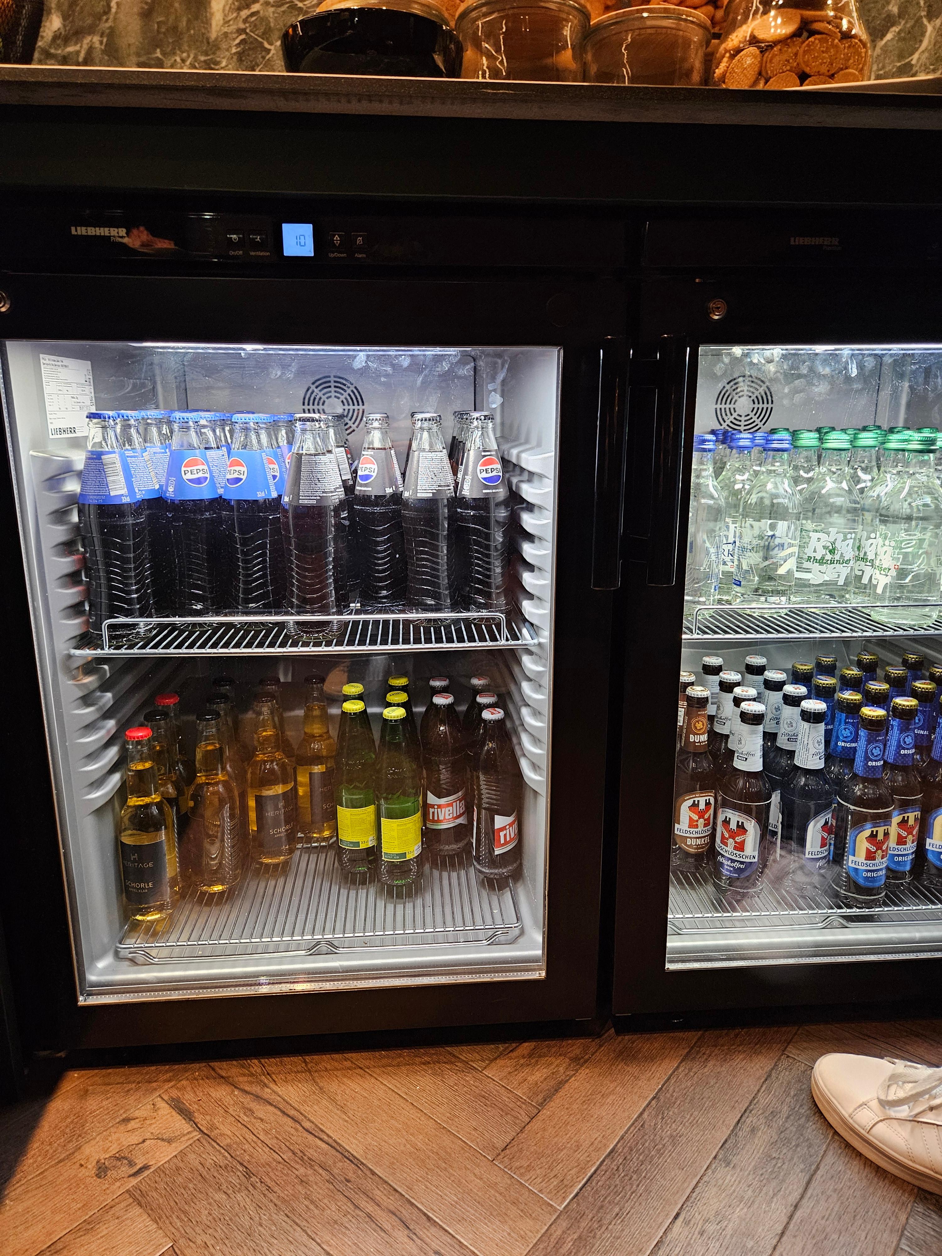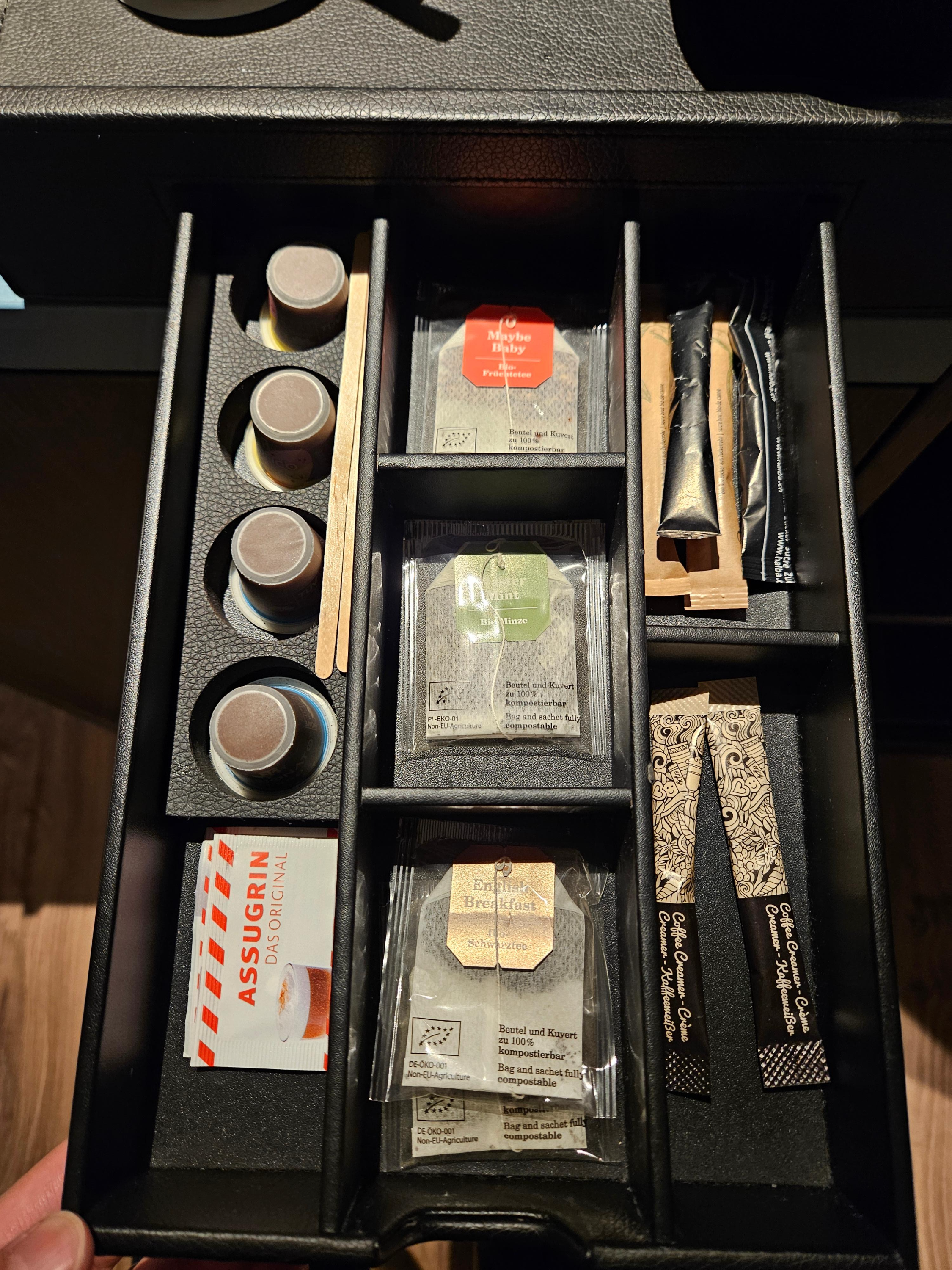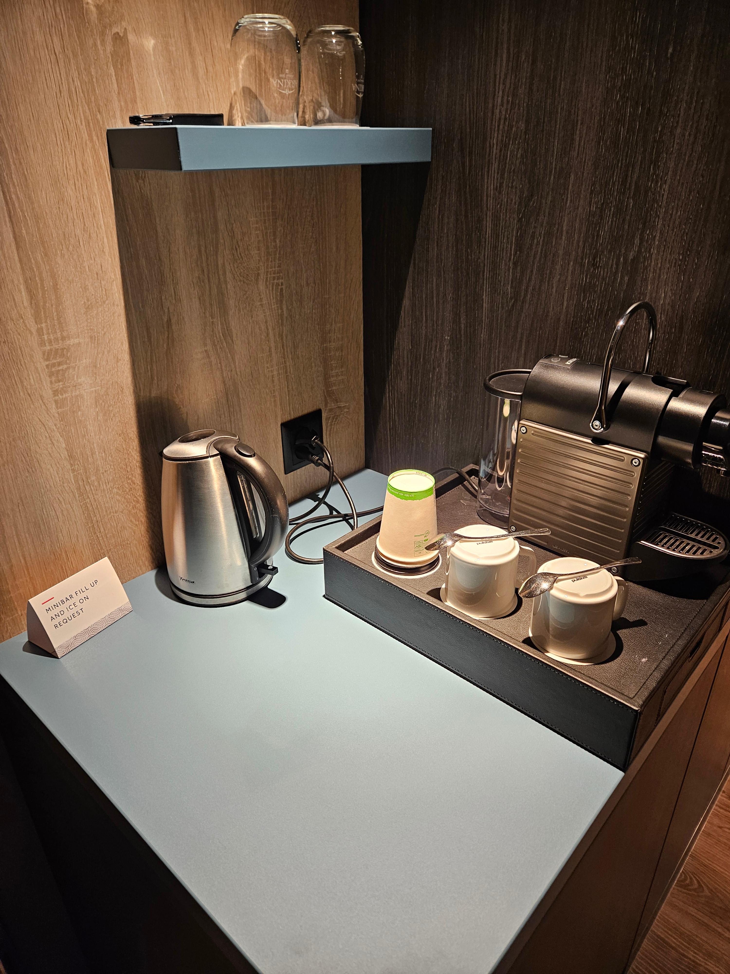 객실 어매니티로는 일단 커피 캡슐 4개와 티백 4개가 제공되었습니다. 커피 머신은 네스프레소 브랜드였고, 전기 주전자도 있었습니다. 밖에 들고 갈 수 있는 종이컵과 뚜껑이 있어서 객실에서 커피를 내려서 들고나갈 수도 있게 되어 있어서 (사용하지는 않았지만) 좋아 보였습니다. 물은 탄산수 한 병과 생수 한 병이 제공되었고 둘 다 유리병에 들어있었습니다.