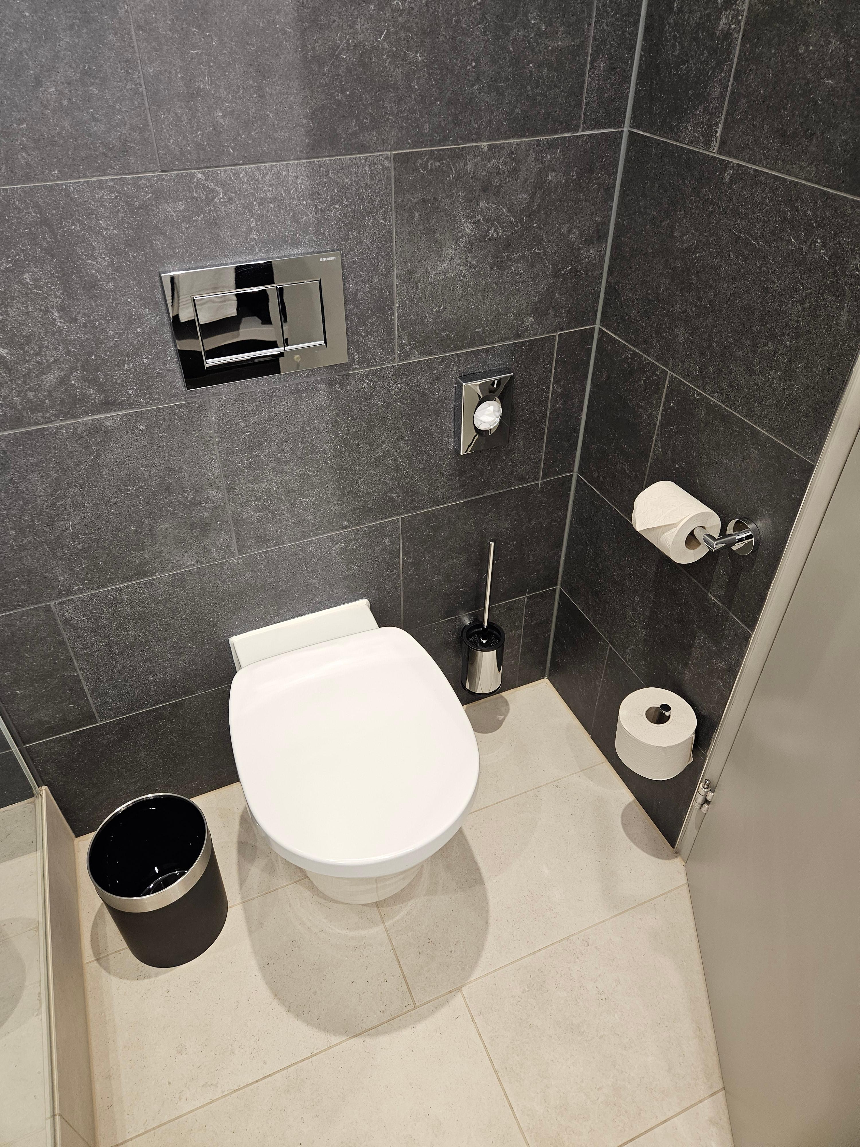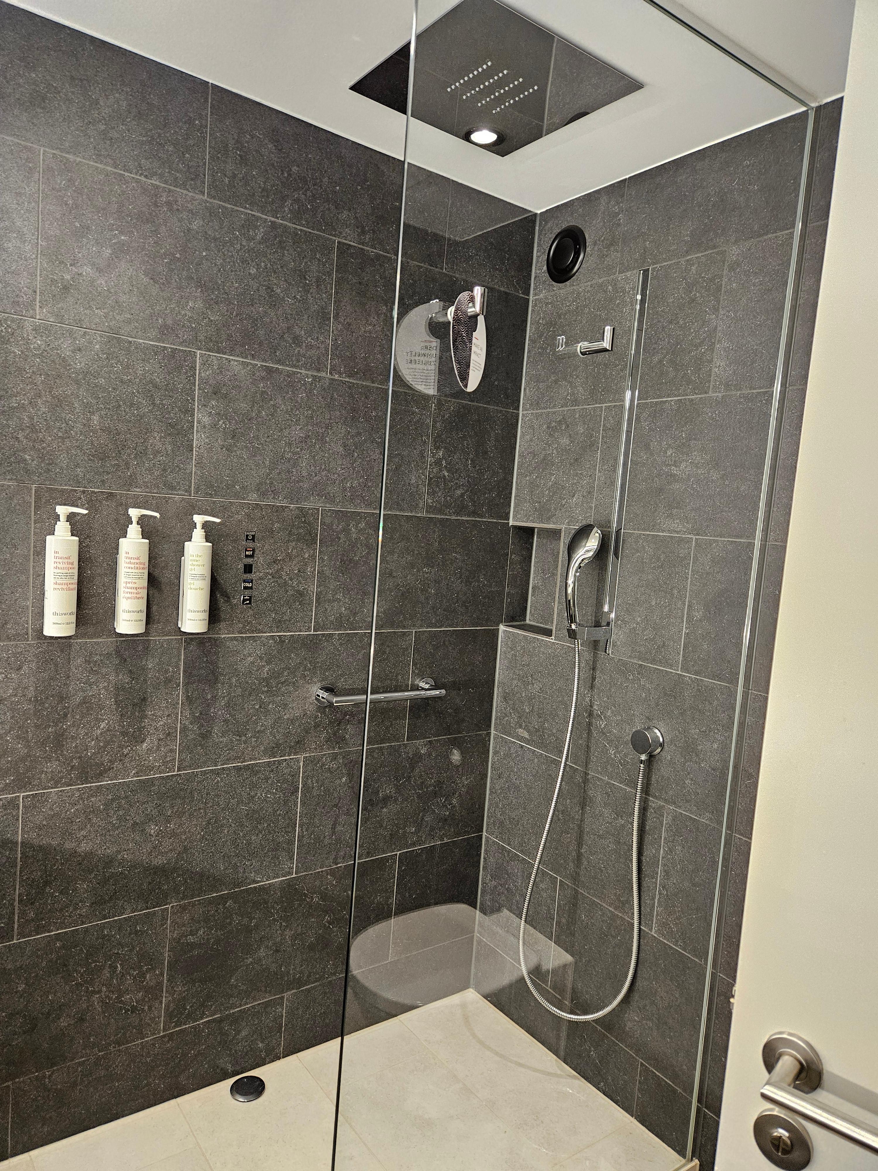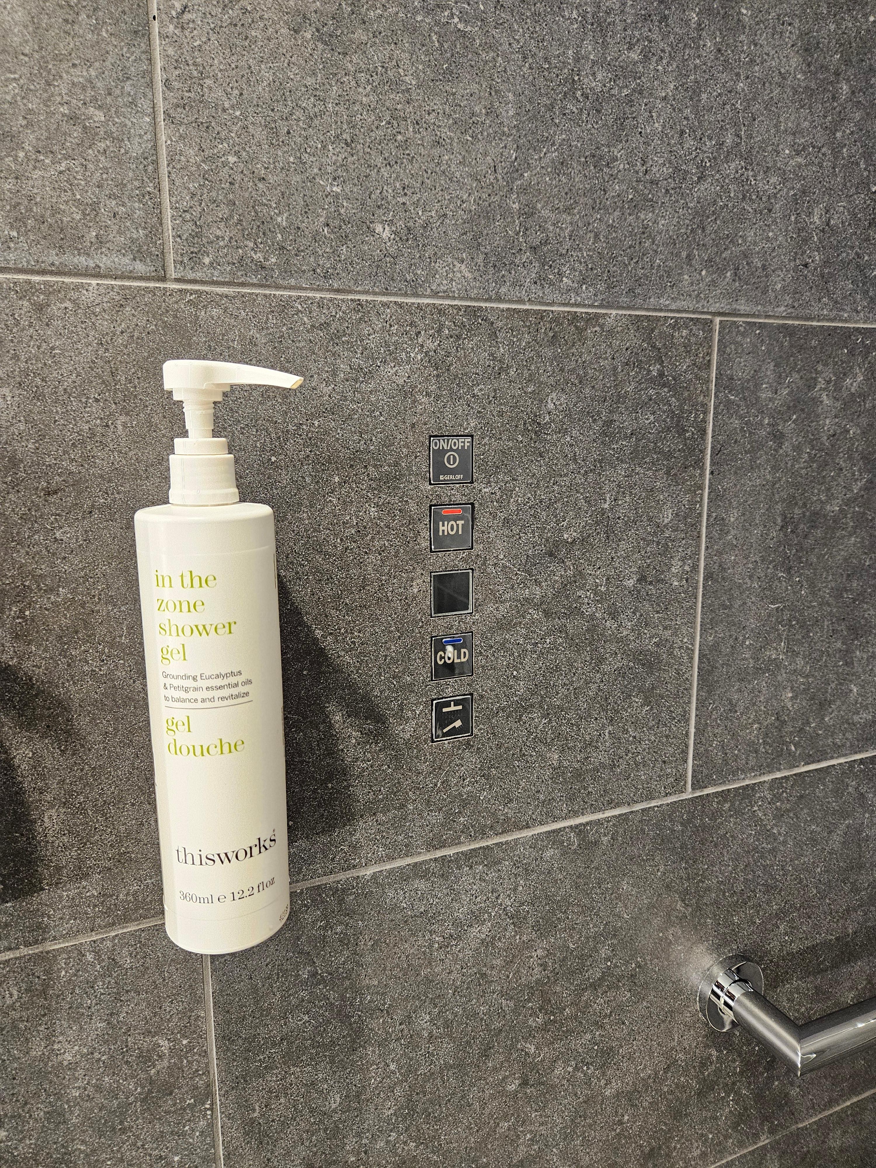 화장실의 경우 구조가 약간 특이했습니다. 화장실은 혼자 사용하기에 넓지도 좁지도 않은 크기에, 변기는 문 뒤에 위치하고 있었고요, 세면대 공간이 넓어 화장품을 올려놓을 수 있는 공간이 많아서 좋았습니다. 다만, 샤워 공간이 약간 특이했는데, 높게 단을 올려 샤워공간을 만들고 절반정도만 유리 칸막이로 나누어 놓았습니다. 처음에는 별 생각이 없었는데 사용하다 보니 샤워기에서 나오는 물이 여기저기 많이 튀더라고요. 개인적으로는 이렇게 열린 공간으로 만들기보다 약간은 닫힌 공간으로 만들었으면 조금 더 편했지 않나 싶습니다. 또한 샤워기의 물을 트는 방법도 신기했는데, 샤워기를 열고 닫는 방식이 아니라 버튼식으로 작동했습니다. 좋은 점이라면 물의 온도를 디지털로 설정할 수 있어서 조금 더 세밀한 조절이 가능했는데, 다만 평소에 물을 몇 도로 사용하는지 알 수 없어서.. 큰 효용성은 없었습니다.