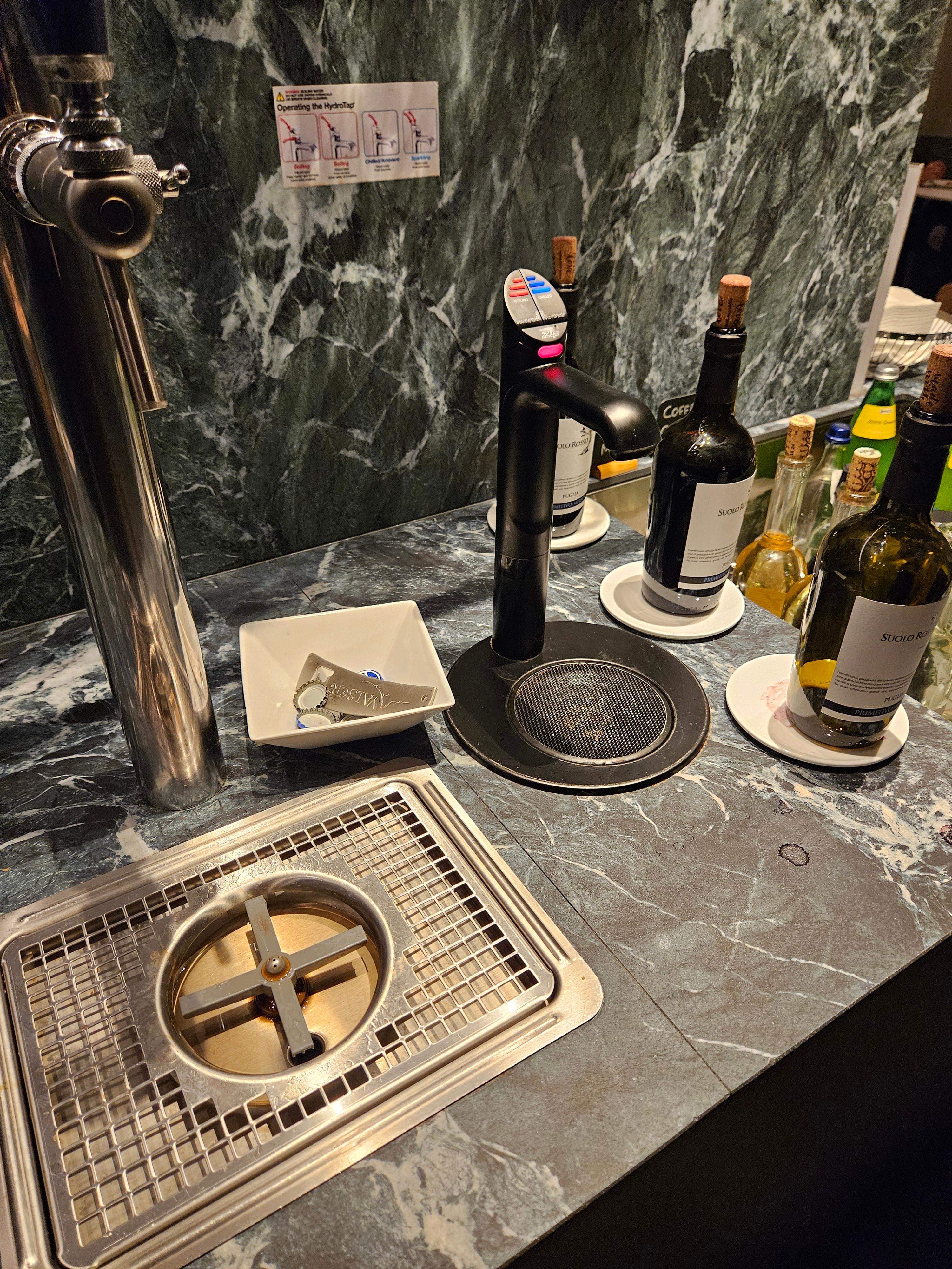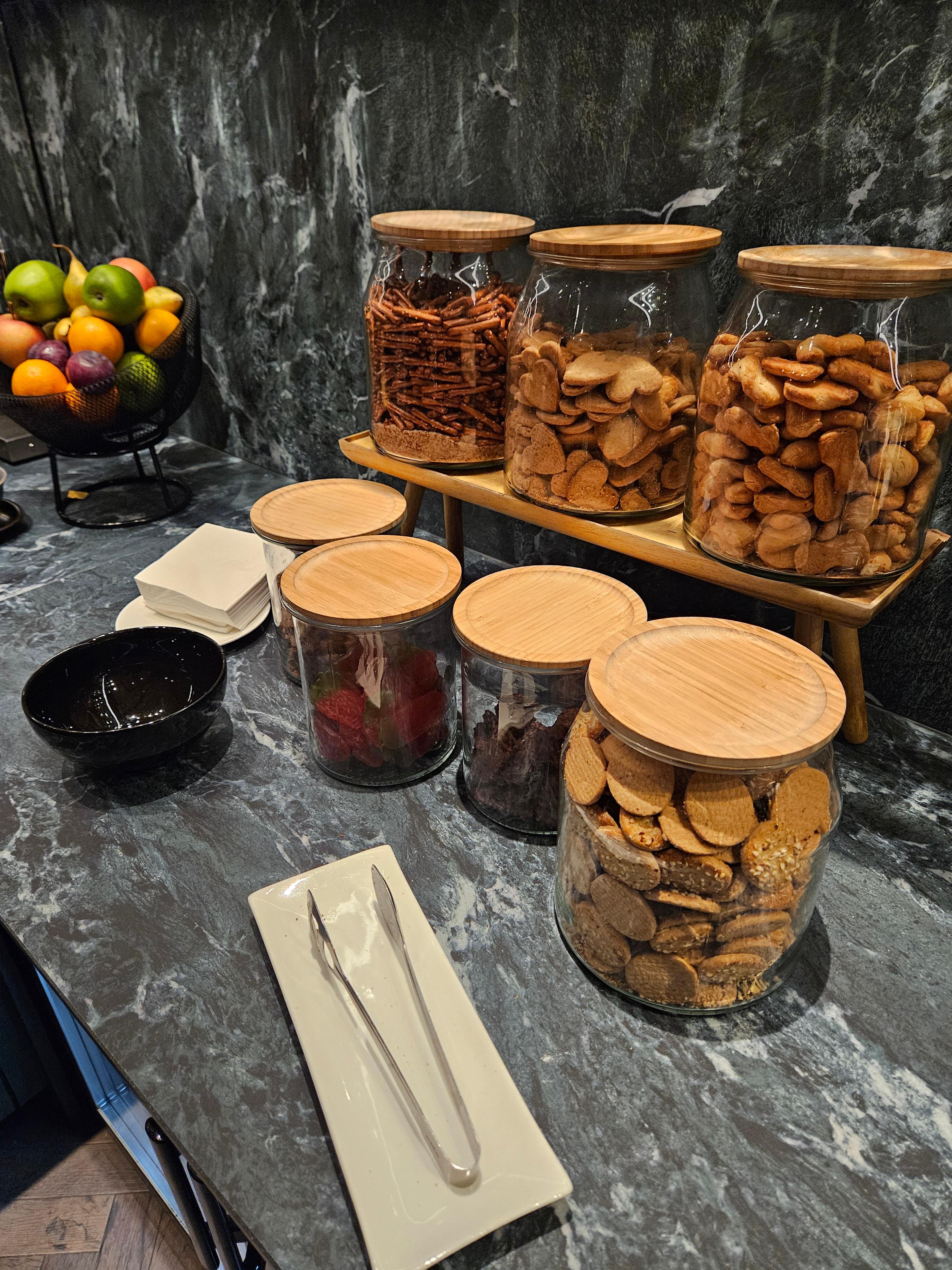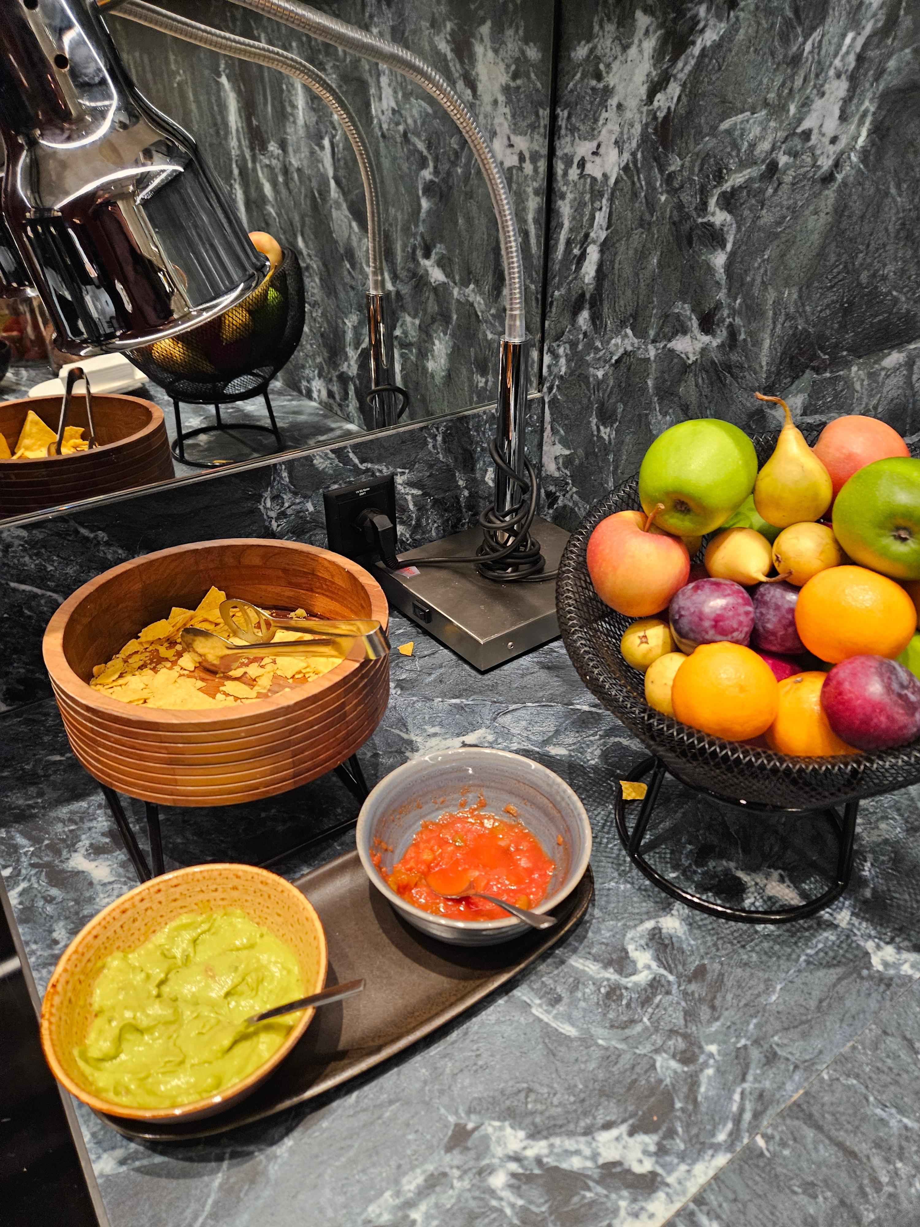 M라운지는 크게 세 시간대로 운영됩니다. 먼저 아침 식사 시간대는 간단한 아침 식사 메뉴가 제공되고요, 아침 식사가 끝나고 저녁 시간 때까지는 차와 커피, 간단한 다과가 제공됩니다. 그리고 저녁 시간대는 해피아워로 주류와 간단한 음식이 제공됩니다. 저는 오후 8시 45분, 해피아워 시간에 M라운지에 방문했습니다. 해피아워는 9시까지 진행되기에 거의 끝물이어서 음식들은 거의 없었습니다. 간단한 쿠키류들과 나초칩과 살사과 과카몰리 정도가 있었습니다. 주류로는 화이트와인과 레드와인, 스파클링 와인, 생맥주와 병맥주, 간단한 위스키와 보드카, 진 등의 주류가 있었습니다. 그 외에는 해피아워뿐만 아니라 24시간 제공되는 커피와, 티, 핫초코 등이 있었습니다.