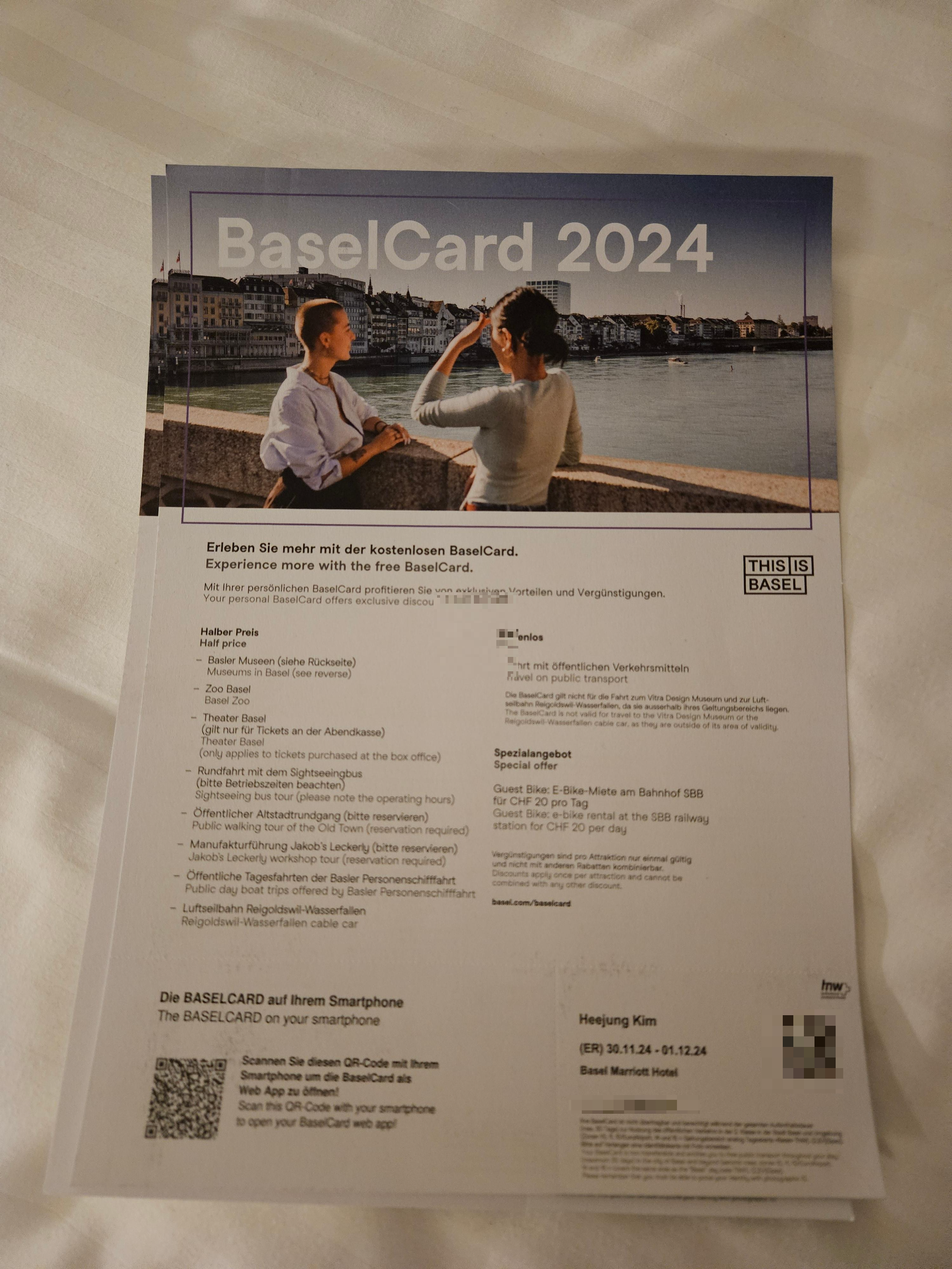 바젤에 있는 호텔에 머무르는 투숙객은 바젤카드라는 걸 받을 수 있습니다. 바젤 카드는 무료 대중교통 이용, 관광지 및 투어 할인 혜택을 받을 수 있는 카드입니다. 가장 큰 혜택은 무료 대중교통이 있습니다. 바젤 시내 및 근교까지 무료로 이용할 수 있는 혜택으로 최대 30일까지 이용이 가능하고요, 호텔 체크인 전에는 호텔 예약 확인서가 있으면 따로 티켓을 보여주지 않아도 호텔까지 무료 대중교통 혜택을 이용할 수 있습니다. 바젤역뿐만 아니라 유로에어포트에서도 무료로 호텔까지 이용할 수 있습니다. 이 외에도 바젤 박물관, 바젤 동물원, 라인강 투어 등의 입장료와 이용료를 50% 할인받을 수 있습니다. 단, 최대 30일까지 이용은 가능하지만, 이는 바젤 내의 호텔에서 숙박기간 동안으로 한정됩니다. 바젤카드에는 본인의 이름과 함께 체크인 및 체크아웃 날짜가 프린트되어 있는데 바젤 카드의 사용기간은 이 기간에 따라 정해집니다. 바젤 카드는 호텔 체크인을 하며 프런트에 요청하면 받을 수 있습니다. 바젤카드에 대한 자세한 정보는 바젤 카드 홈페이지에서 확인하시길 바라니다.