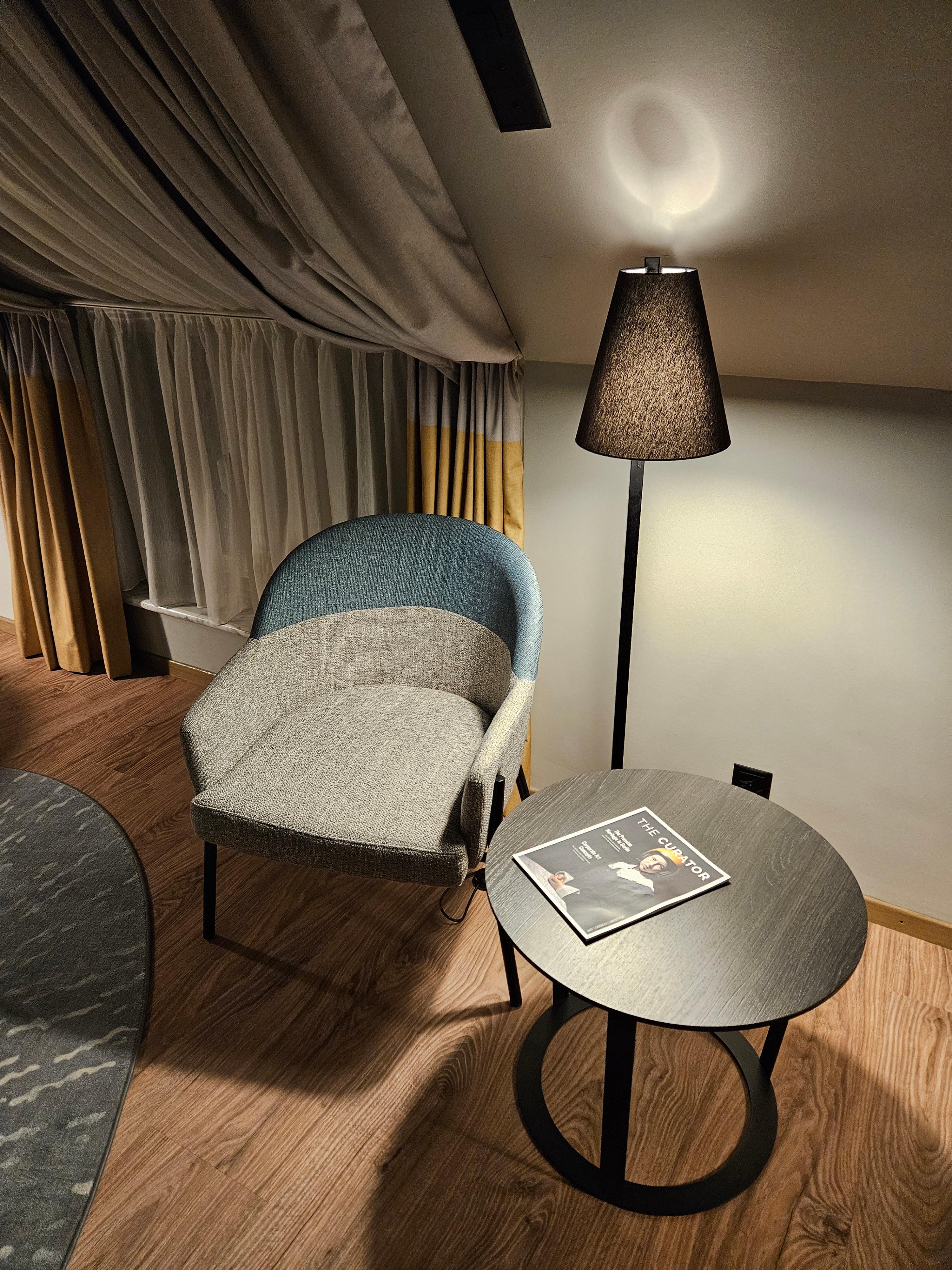 저는 6층에 위치한 607호를 배정받았습니다. 인테리어의 전반적은 톤은 블랙 & 화이트를 기본으로 우드톤과 따듯한 간접조명을 사용한 전형적인 4성급 비즈니스호텔이었습니다. 확실히 가장 기본 방보다는 한 단계 높은 등급의 방이어서 그런지 공간은 넓은 편이어서 캐리어를 두세 개 펼쳐 놔도 움직일 공간은 충분한 편이었습니다. 공간은 넓었지만 위층이었기에 벽이 천장 쪽으로 갈수록 좁아지는 구조로 되어 있었습니다. 킹 사이즈 침대와 더불어 차분한 톤의 액센트 체어와 사이드 테이블, 그리고 비즈니스호텔답게 일을 할 수 있는 데스크와 의자도 준비되어 있었습니다. 한 가지 단점은 데스크 앞에 TV가 설치되어 있었는데 데스크와 침대 사이의 거리가 꽤 길다 보니 침대에서 TV를 보기에는 TV가 조금 작아 보였습니다.