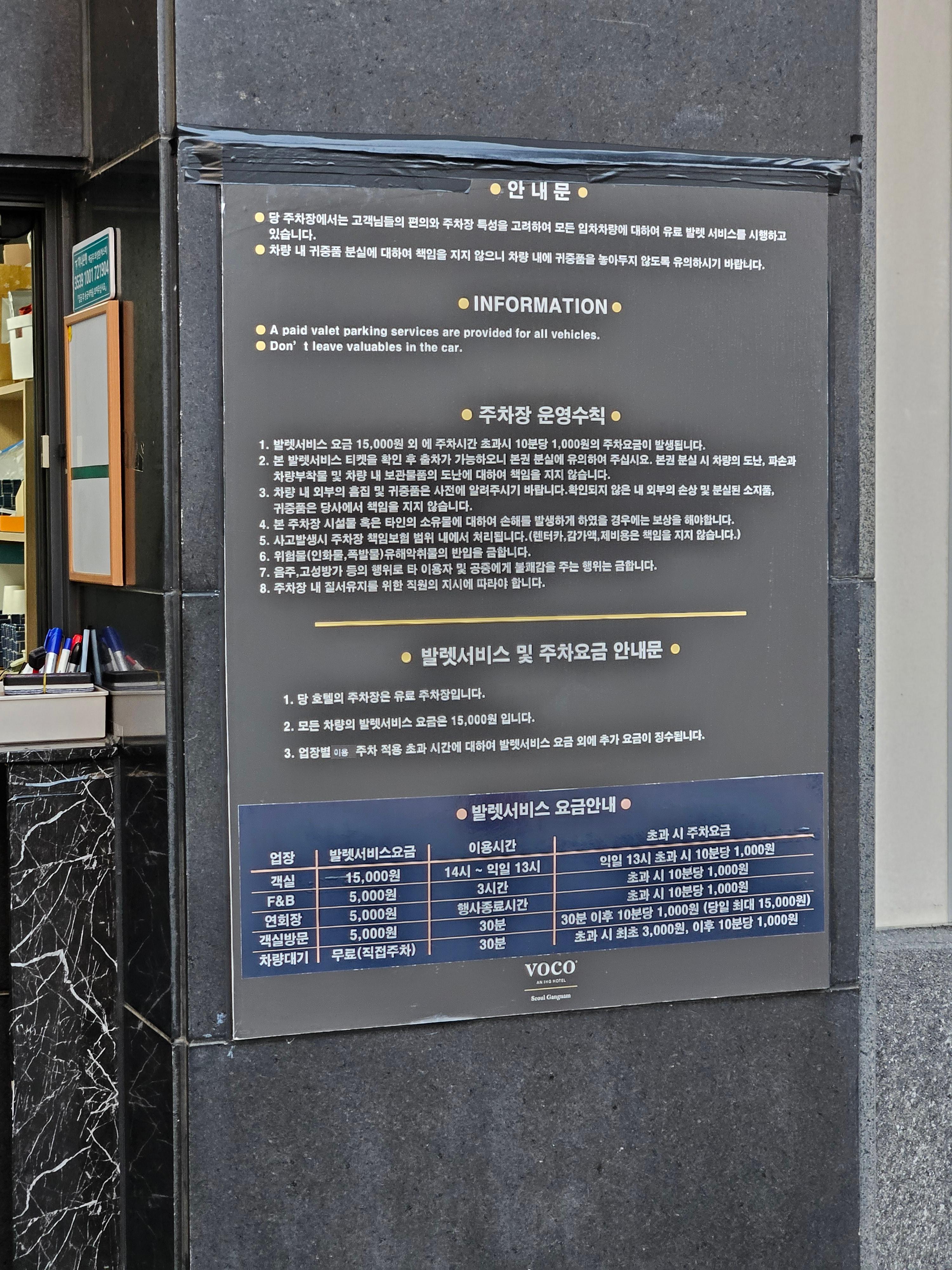 보코 강남 호텔은 도산대로 근처에 위치해 있습니다. 가장 가까운 역은 신사역인데 걸어서 약 5분 정도 걸리는 거리에 있습니다. 신사역에서 압구정 방향으로 가다보면 언덕이 나오는데, 다행히 보코 강남 호텔은 언덕이 본격적으로 시작되기 전에 위치해 있어 오르막 걱정은 크게 안하셔도 됩니다. 주차의 경우 발렛 파킹만 되고 하루에 15,000원 비용이 발생합니다. 비용을 지불하면 언제든지 출차가 가능한 형태입니다. 주차는 건물 뒷편에서 가능하구요, 건물 뒷편 길이 일방통행이라 도산대로에서 보코 강남 옆의 도산대로 16길이 아니라, 한 블록 더 가셔서 우회전 하셔야 합니다. 저는 차를 타고 이동했는데요, 발렛을 도와주시는 분들이 짐을 로비로 옮겨주셨고, 로비에서는 호텔 직원분들이 짐을 방까지 옮겨 주셨습니다.