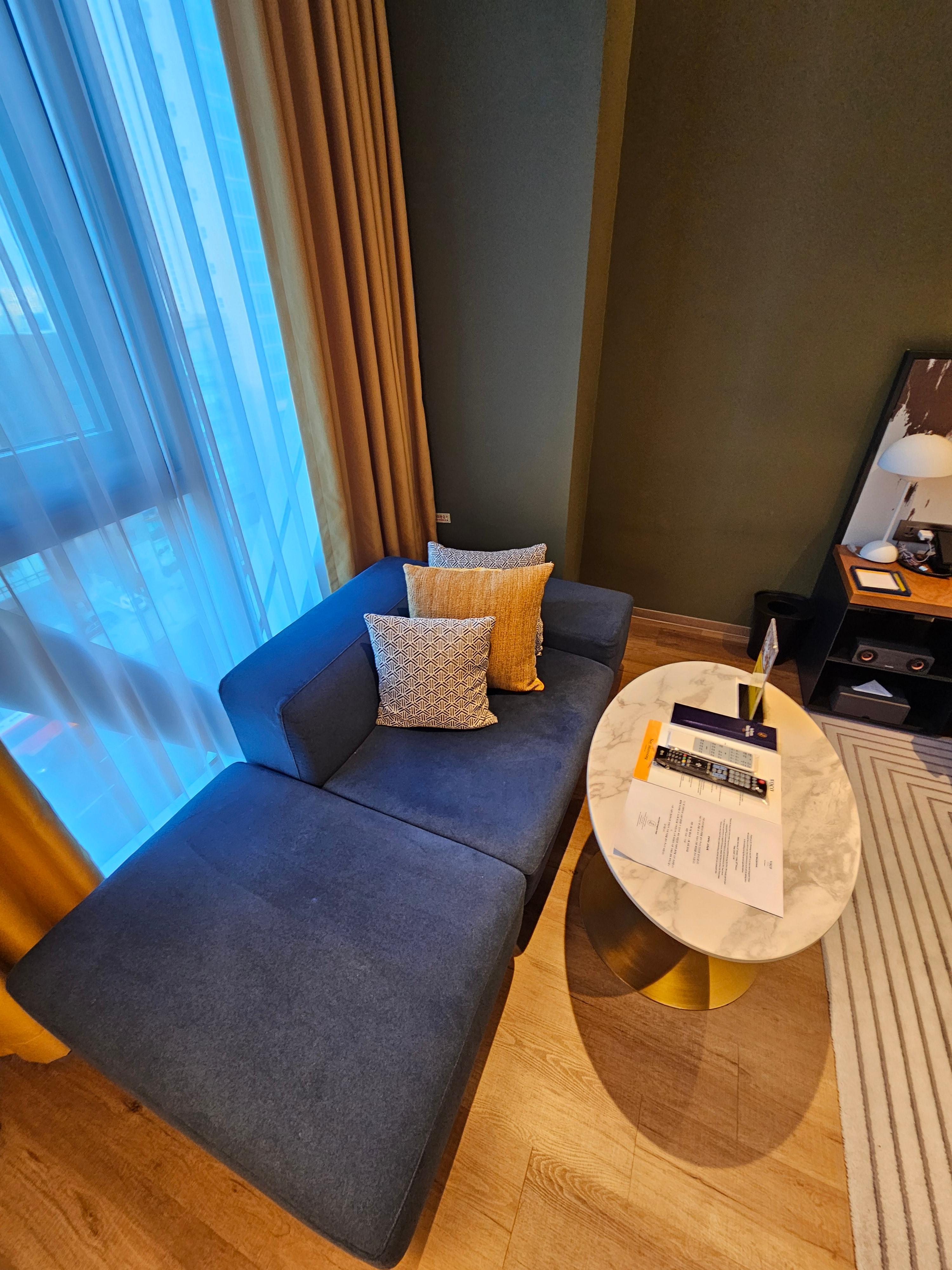 한켠에는 두 명이 앉기 충분한 쇼파와 테이블이 있었고, 침대 앞에는 TV가 벽걸이 형태로 설치되 있었고 따로 미디어 콘솔은 없었습니다. 인테리어는 전반적으로 블랙과 화이트를 기본으로 보코의 컬러인 노란색과 어두운 파란색이 매칭된 형태로 차분하면서도 생기있는 느낌이 특징입니다.