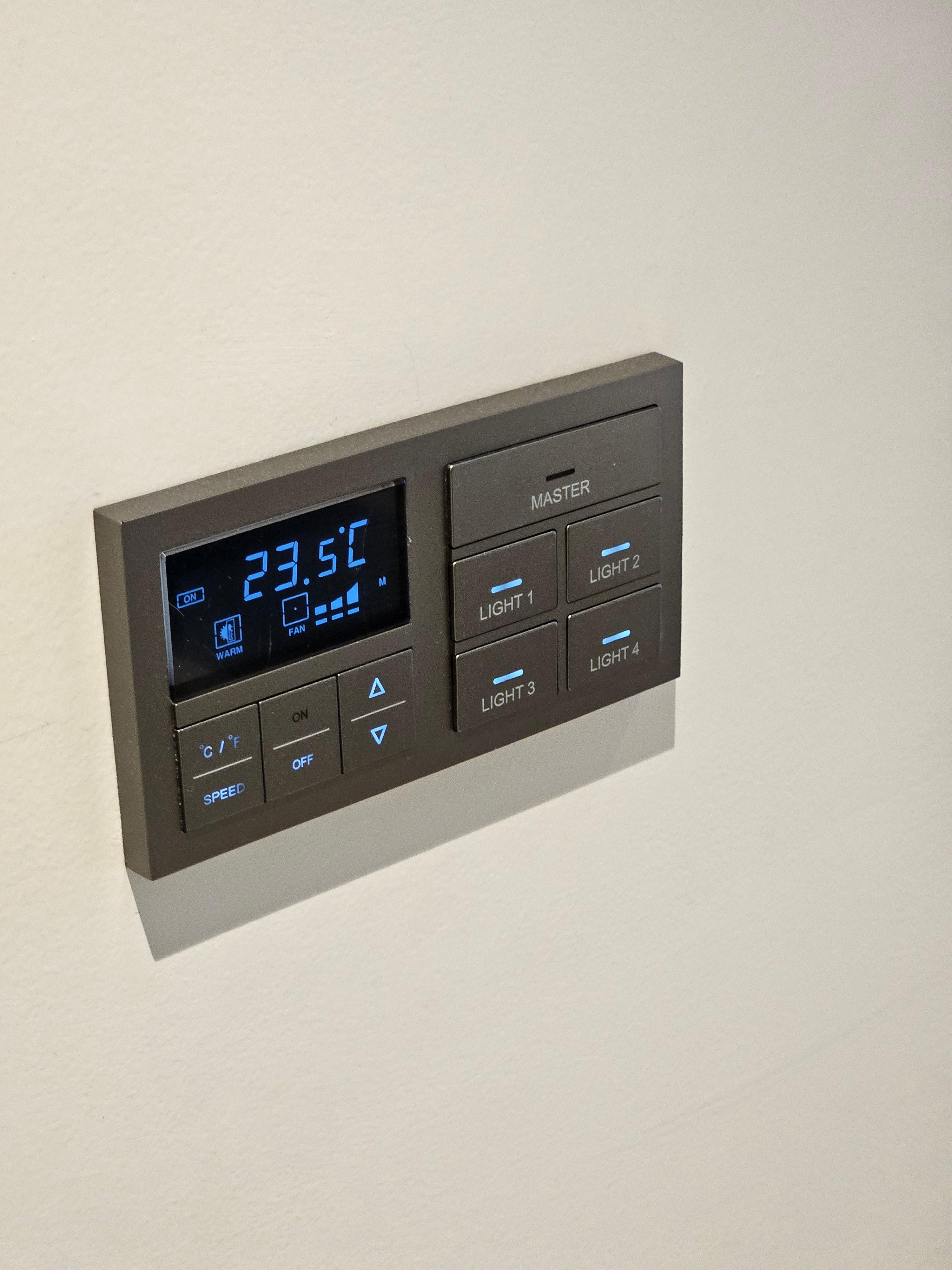 저는 7층에 위치한 701호를 배정받았습니다. 호텔 객실은 2층부터 17층까지 위치해 있기에 고층은 아니고 중층에 위치한 방이었습니다. 문을 열고 들어서면 가장 먼저 우측에 카드 키를 꽂을 수 있는 홀더와 조명 컨트롤이 보이는데, 문 옆에 위치한 조명 컨트롤로 입구 및 화장실의 조명을 조절할 수 있습니다. 화장실 내부에는 따로 스위치가 없기에 여기에서 화장실 조명을 컨트롤 하셔야 하구요, 이 스위치에는 마스터 스위치도 없습니다.