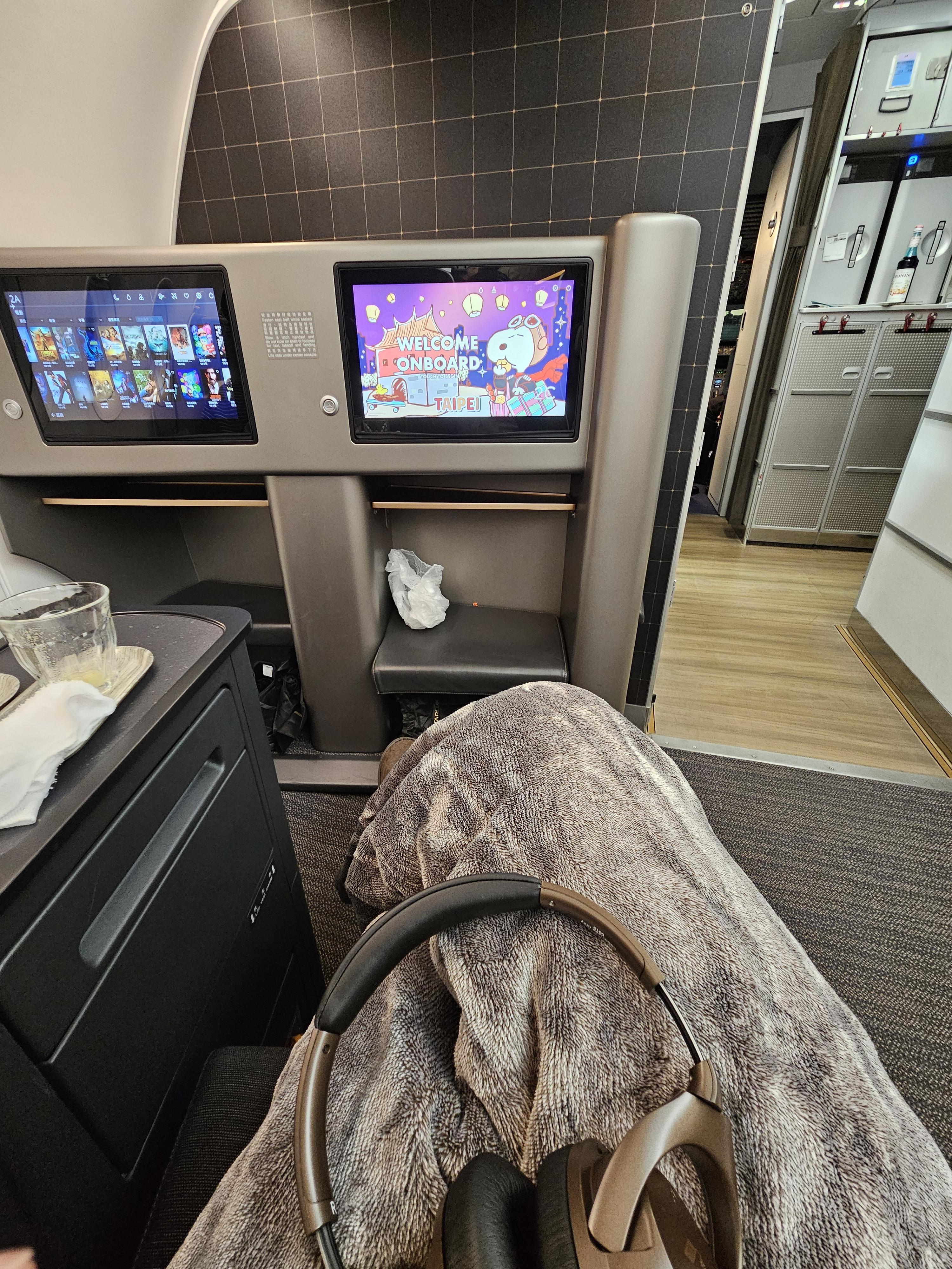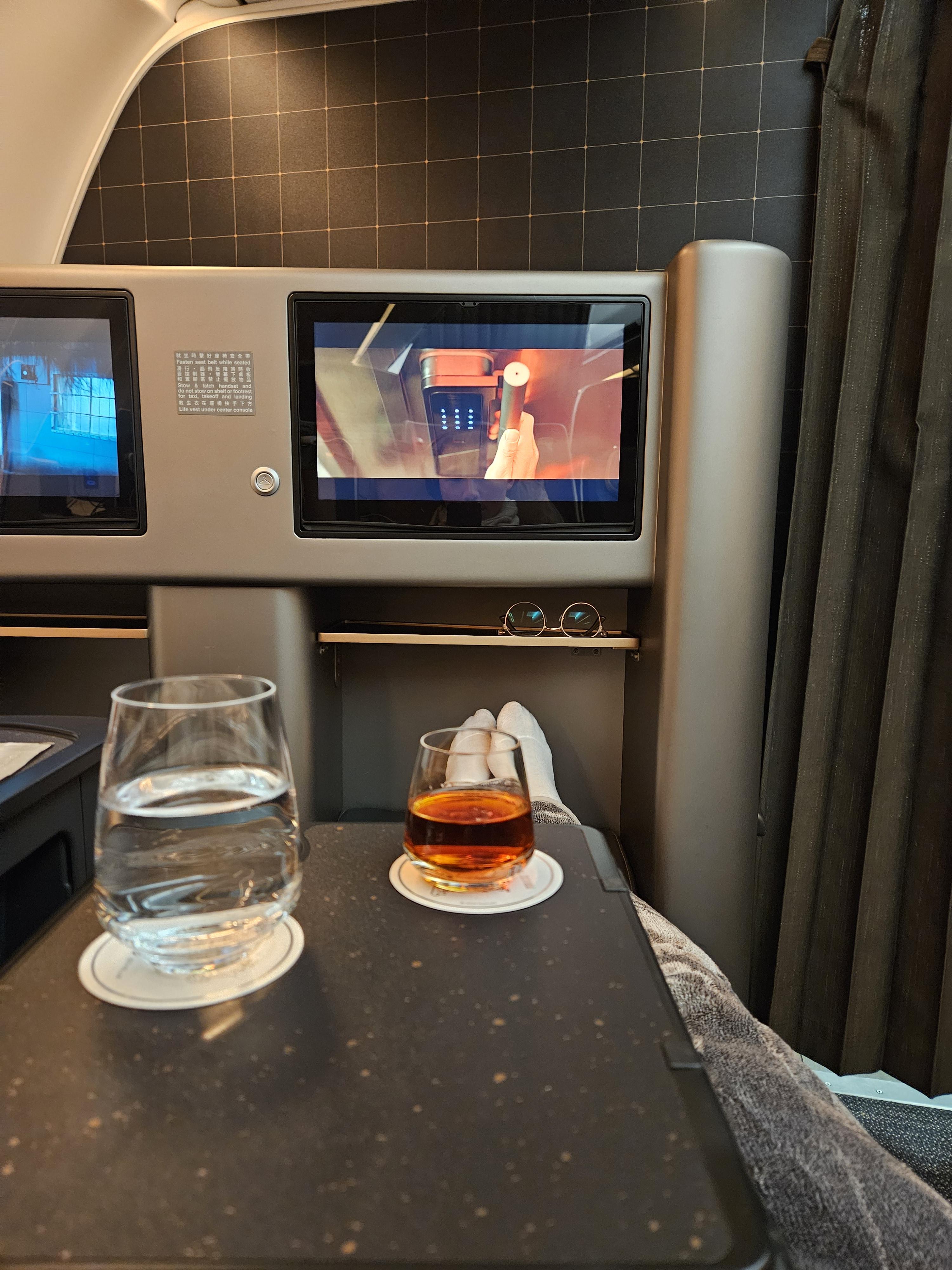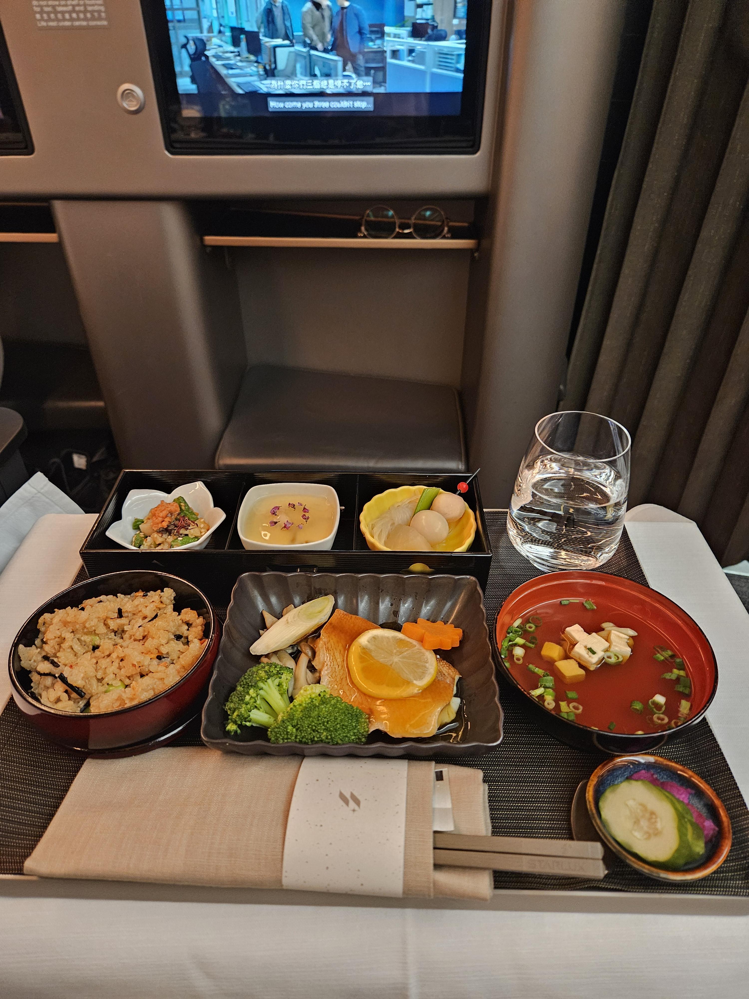 단거리 비즈니스의 기내 서비스는 대부분이 비슷합니다. 보딩 시 웰컴 드링크를 주고요, 이륙한 후 식전주를 줍니다. 그리고 에피타이저와 메인을 한 트레이에 서빙받고, 그 후에 디저트와 마무리 음료를 서빙하는 것으로 식사 서비스가 완료됩니다. 단거리 구간에서는 메인 식사 외에 따로 알라카르테나 스몰 디시는 서빙하지 않습니다. 식사 서비스가 끝난 후에는 기내 판매가 진행되는데 돌아다니면서 사라고 하지는 않고, 그냥 방송으로 안내만 나옵니다. 저의 경우는 사전에 카발란을 주문했기에 이를 기내에서 수령했습니다. 남은 시간은 대부분 주류와 음료를 먹다 졸다 했습니다. 사실 정확하지 않을 수도 있는데, 승무원이 5명이 탄 것 같았습니다. 원래 200석 미만의 항공기에는 파일럿을 제외한 승무원 기준이 4명이기에 비용 절감을 이유로 주로 4명을 탑승시키는 것으로 알고 있는데 이번 비행에는 5명이 탄 것 같더라고요. 비즈니스 클래스 담당 승무원만 2명이었는데 덕분에 서비스가 빠르게 돌아가는 느낌이었습니다. 승무원이 많다고 무조건 좋은 건 아니지만, 그만큼 서비스에 더 신경 쓴다는 인상은 받았습니다.