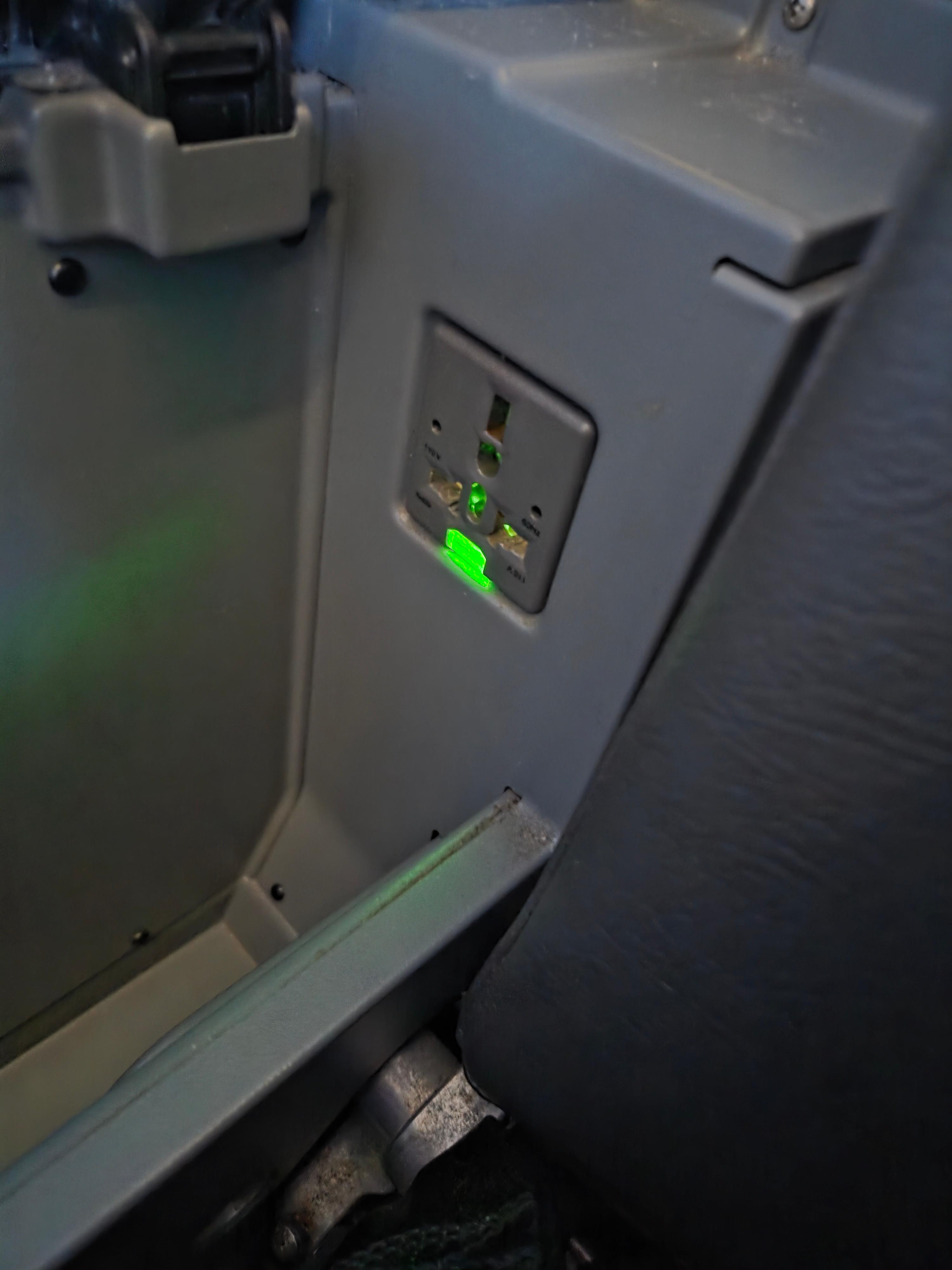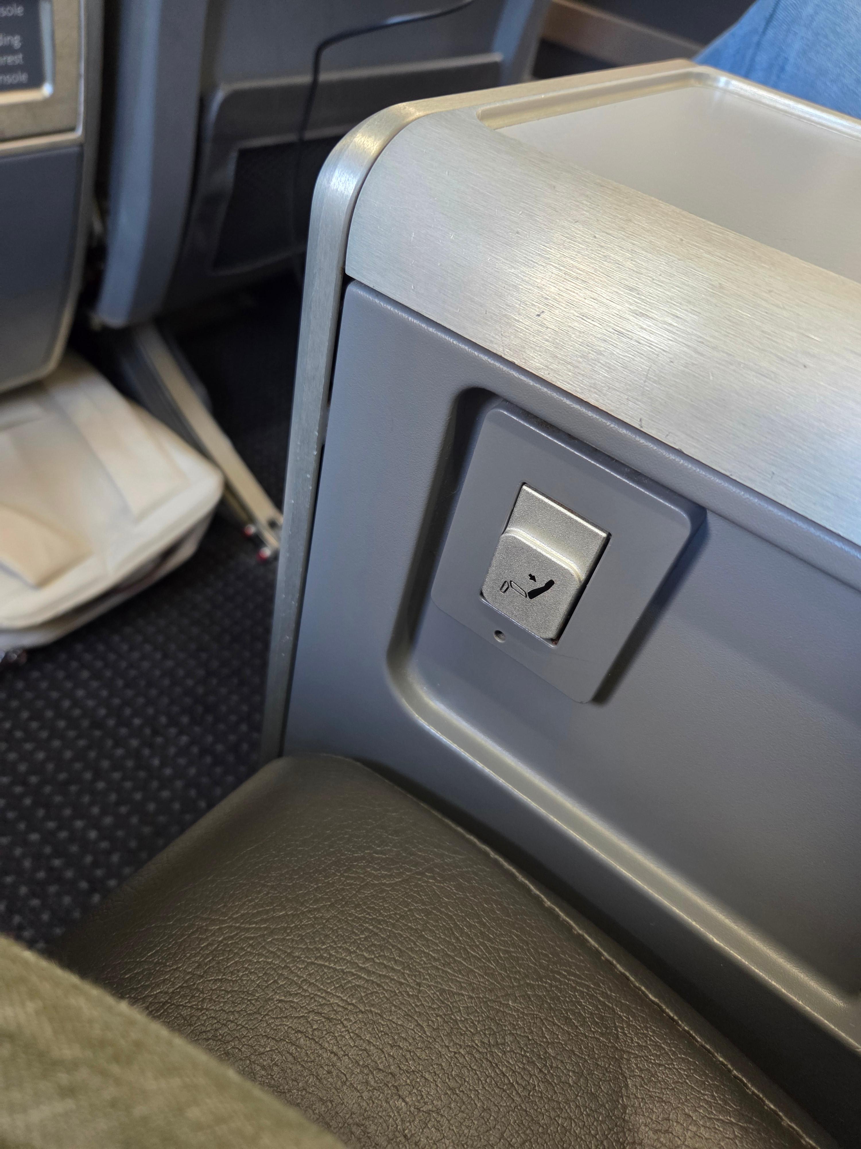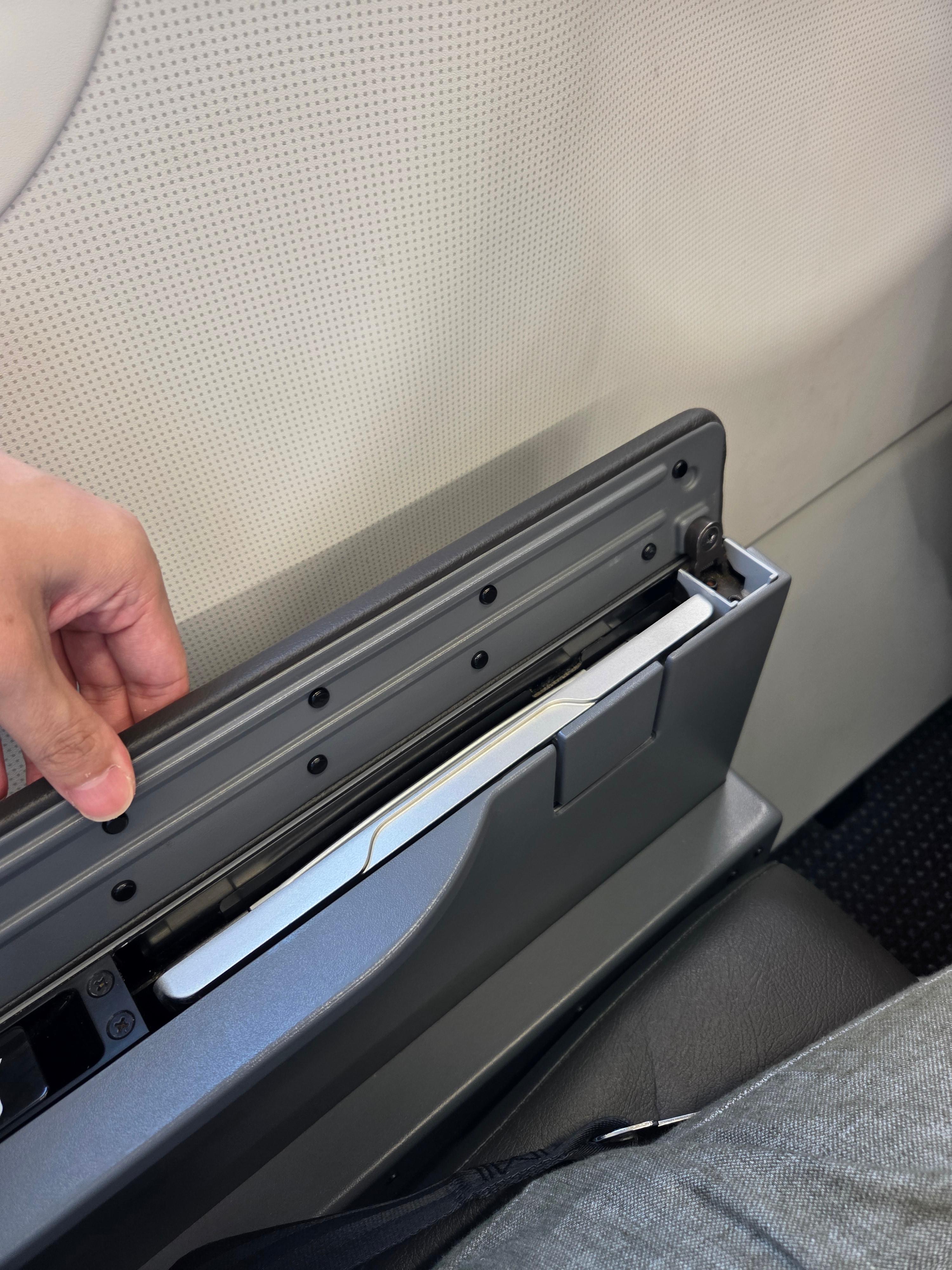 아메리칸 항공 A321-200 항공기의 국내선 일등석에는 기내 엔터테인먼트 모니터 대신, 디바이스 홀더가 장착되어 있습니다. 디바이스 홀더 옆으로는 USB A 충전단자가 위치해 있습니다. 110볼트 전원의 경우 좌석 사이에 있는 팔걸이 안에 위치해 있어 디바이스를 충전하거나 충전하면서 이용하기에는 나쁜 위치는 아니지만, 좌석을 처음 이용해 보는 승객들은 찾기가 어려울 수 있겠다는 생각이 들었습니다. 창가 또는 복도 쪽 팔걸이 아래에는 테이블이 수납되어 있고 버튼을 눌러 식탁을 꺼낼 수 있으며 식탁은 꽤 견고한 편이었습니다. 식탁은 한번 펼쳐서 확장시키는 방식으로 되어 있는데 펼치지 않은 상황에서는 개인 디바이스를 거치해 놓을 수 있는 홀더가 장착되어 있습니다.