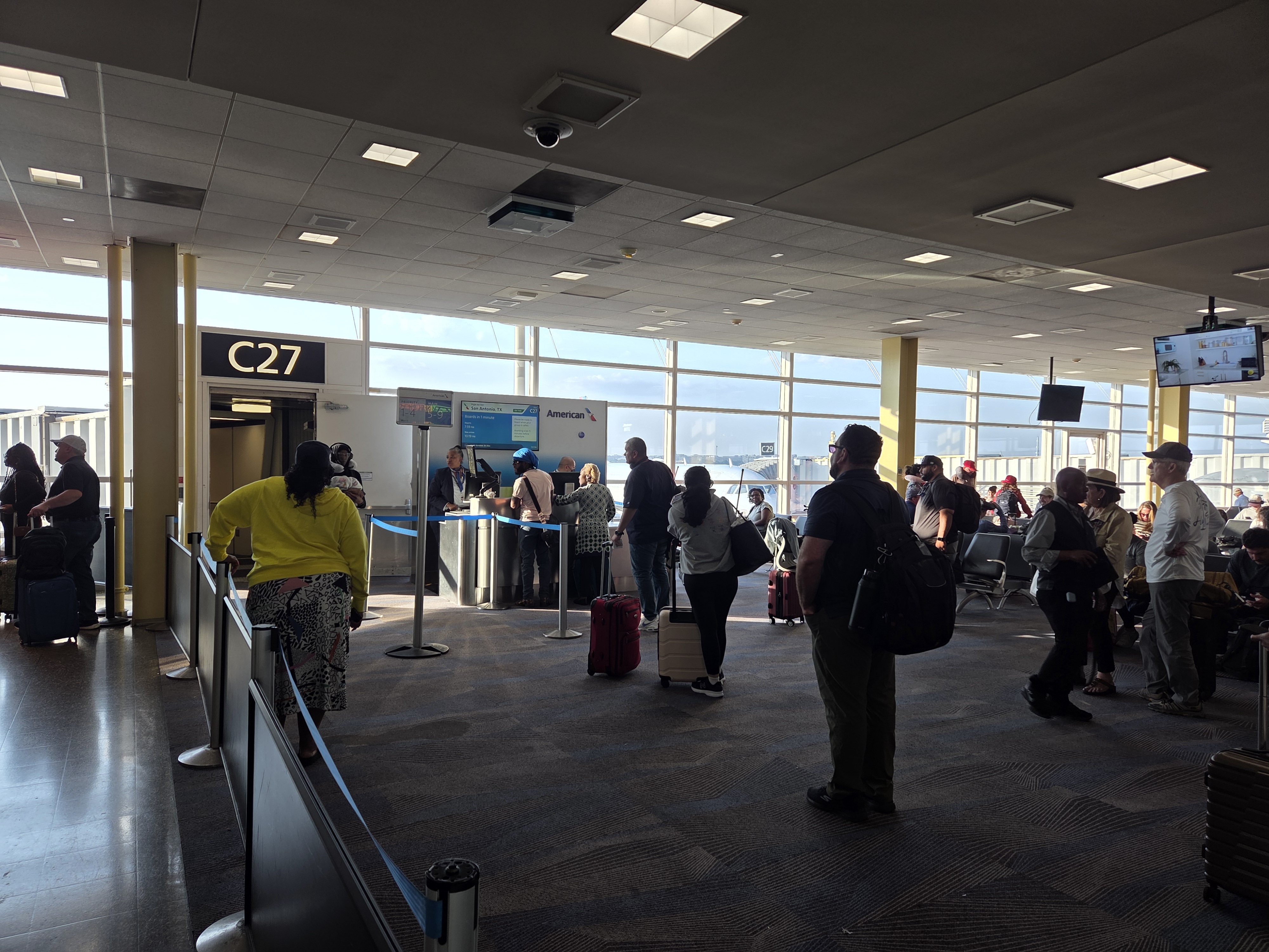 제가 탑승한 아메리칸 항공 1947편은 출발 40분 전인 오후 7시 20분에 보딩이 시작되었습니다. 일등석 승객은 도움이 필요한 승객과 아메리칸 항공 AAdvantage 최상위 회원인 컨시어지 키 회원 다음으로 탑승을 하게 됩니다. 보딩 그룹은 First Class의 약자인 FC로 보딩패스에 표시가 됩니다. 만약 게이트에 도착했을 때 탑승이 이미 시작한 상황이고 후순위 그룹의 보딩이 시작되었다면 우선탑승 줄을 통해 바로 탑승할 수 있습니다.