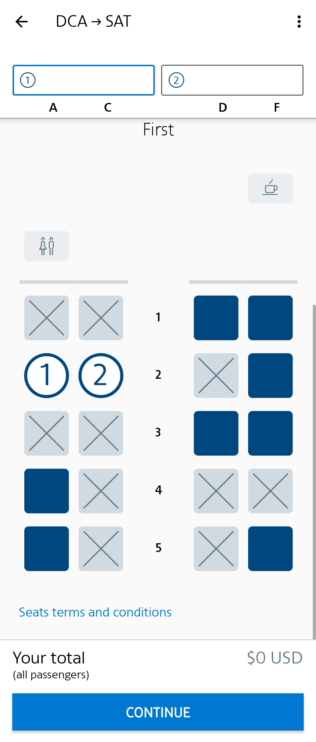 아메리칸 항공 A321 일등석 좌석배치도(좌), 모바일 보딩패스(우), courtesy of American Airlines 체크인은 다른 항공사들과 마찬가지로 출발 24시간 전부터 가능합니다. 웹사이트 또는 앱으로도 가능하며 발권받은 보딩패스는 종이에 출력해 갈수도 있고 핸드폰에 담아서 갈 수도 있습니다. 공항에서 체크인도 가능합니다. 아메리칸 항공은 공항에서 체크인을 한다고 해서 따로 추가 요금을 받지는 않습니다. 체크인은 출발 45분 전까지 완료해야 합니다. 참고로 업그레이드를 받았을 때 배정받은 좌석이 맘에 들지 않는다면 업그레이드 이후에 좌석 변경을 할 수 있습니다. 저도 원래 배정받은 좌석은 5A와 5F인데 이를 2A와 2C로 바꿨습니다.