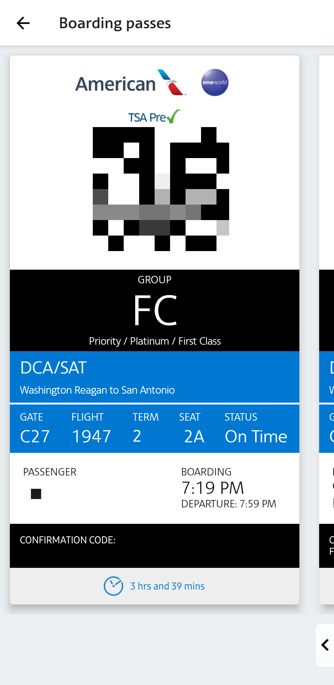 - 노선: DCA (로널드 레이건 워싱턴 내셔널 공항) → SAT(샌 안토니오 국제공항), AA1947, 19:59 → 22:38, Duration 3h 39m