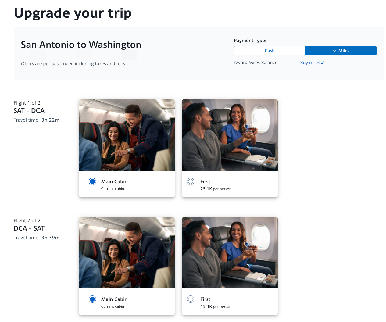 아메리칸 항공 유상 업그레이드 마일리지 가격(좌), 업그레이드 확인 이메일(우), courtesy of American Airlines 저는 이 항공권을 일등석이 아닌 메인 캐빈으로 왕복 약 260달러 정도에 발권을 했습니다. 그리고 업그레이드를 받아 일등석에 탑승할 수 있었습니다. 아메리칸 항공 상용 고객 우대 프로그램인 AAdvantage의 엘리트 회원 혜택 중 하나는 바로 국내선 업그레이드 혜택입니다. 이 혜택은 가장 낮은 골드 등급 회원부터 가장 높은 컨시어지 키 회원에게 모두 제공이 됩니다. 단, 업그레이드 순서에 차이가 있는데요, 당일 탑승 승객 중 업그레이드를 받을 수 있는 회원을 가장 높은 등급부터 가장 낮은 등급까지 일렬로 줄을 세운 후 우선순위에 따라서 업그레이드가 제공됩니다. 따라서 업그레이드를 받기 위해서는 탑승할 항공편에 엘리트 회원이 얼마나 있는지와 일등석 좌석이 얼마나 남았는지가 중요합니다. 저는 AAdvantage 플래티넘 회원인데 사실 높은 등급은 아니기에 일등석 업그레이드를 크게 기대하지는 않았습니다만, 제가 탑승하는 날에 위의 두 가지 조건이 잘 맞아떨어져서 출발 26시간 전에 업그레이드를 확약받을 수 있었습니다.