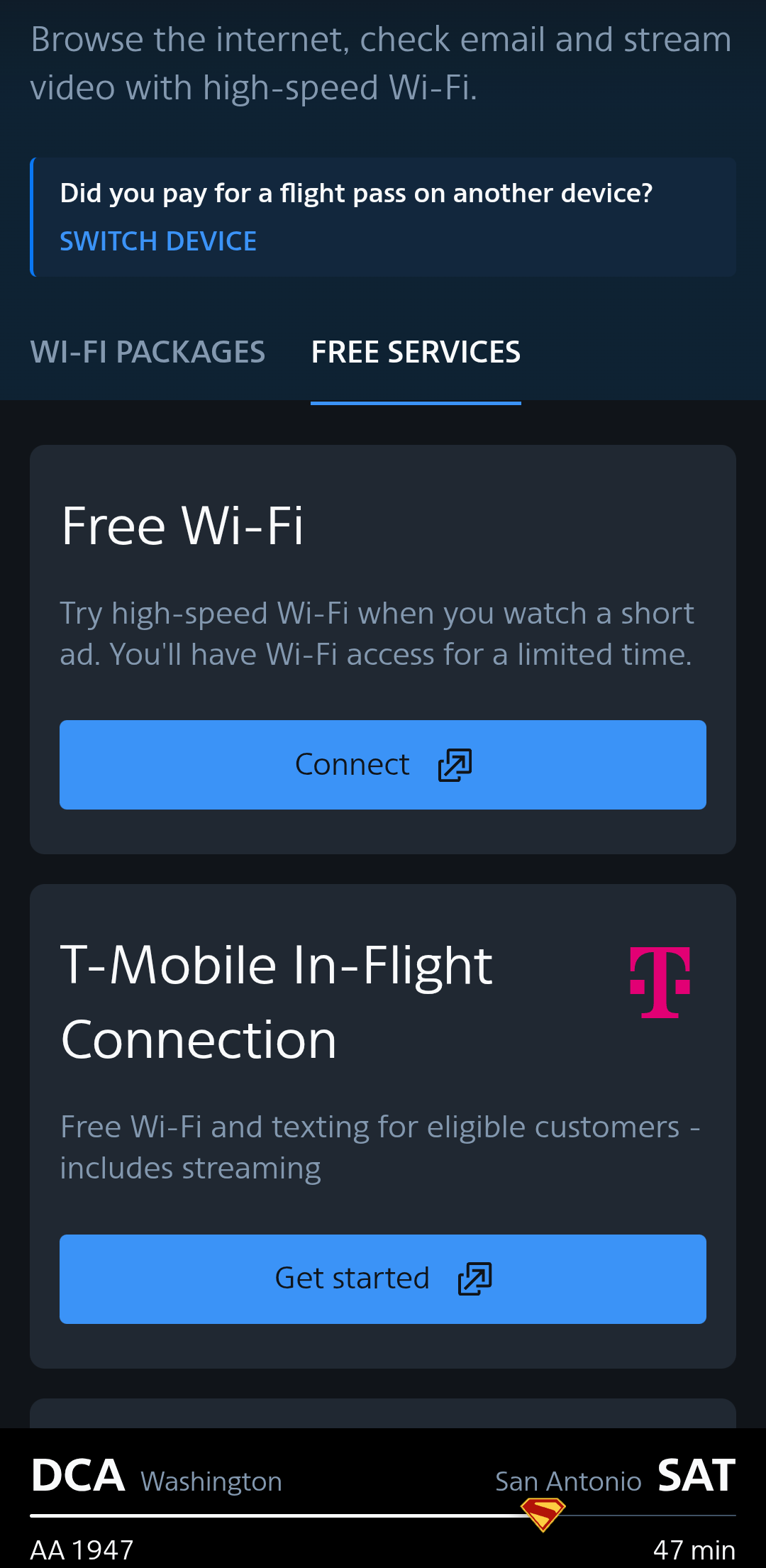 - 노선: DCA (로널드 레이건 워싱턴 내셔널 공항) → SAT(샌 안토니오 국제공항), AA1947, 19:59 → 22:38, Duration 3h 39m