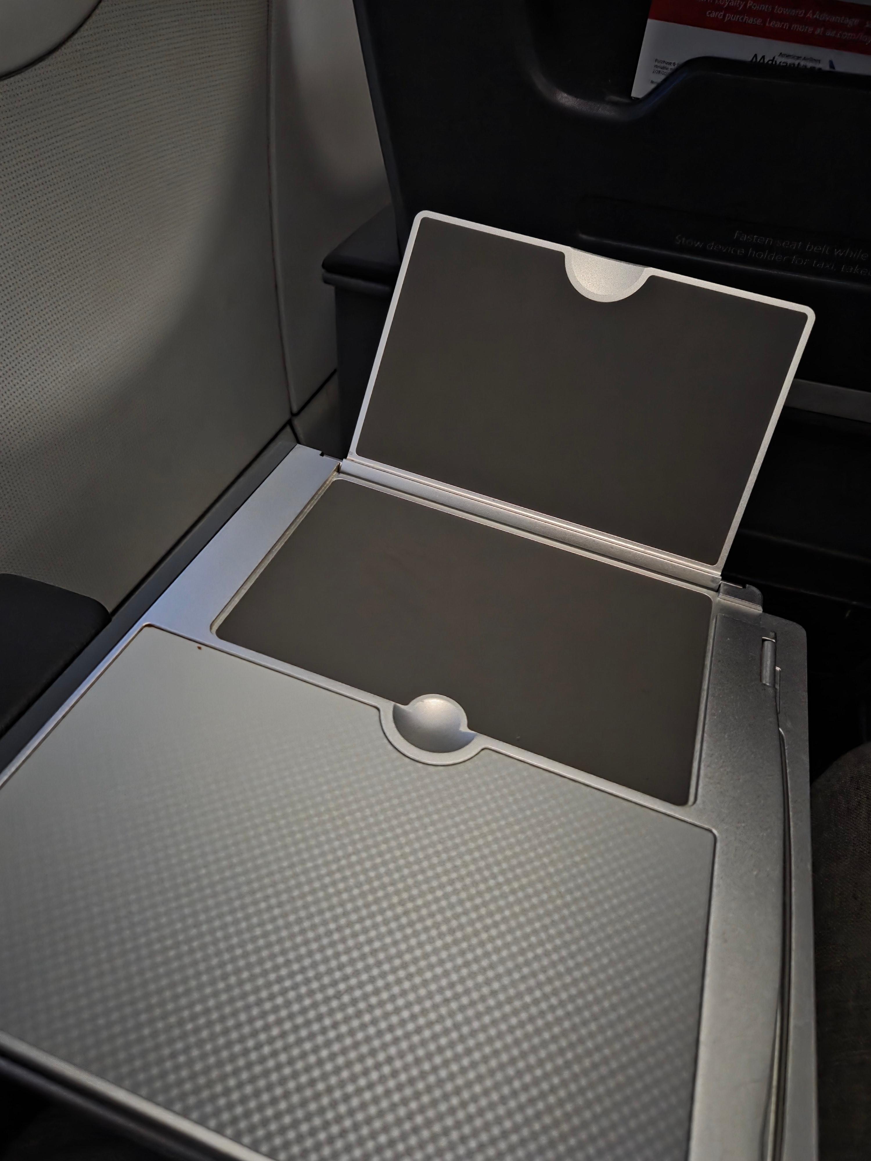 아메리칸 항공 A321-200 항공기의 국내선 일등석에는 기내 엔터테인먼트 모니터 대신, 디바이스 홀더가 장착되어 있습니다. 디바이스 홀더 옆으로는 USB A 충전단자가 위치해 있습니다. 110볼트 전원의 경우 좌석 사이에 있는 팔걸이 안에 위치해 있어 디바이스를 충전하거나 충전하면서 이용하기에는 나쁜 위치는 아니지만, 좌석을 처음 이용해 보는 승객들은 찾기가 어려울 수 있겠다는 생각이 들었습니다. 창가 또는 복도 쪽 팔걸이 아래에는 테이블이 수납되어 있고 버튼을 눌러 식탁을 꺼낼 수 있으며 식탁은 꽤 견고한 편이었습니다. 식탁은 한번 펼쳐서 확장시키는 방식으로 되어 있는데 펼치지 않은 상황에서는 개인 디바이스를 거치해 놓을 수 있는 홀더가 장착되어 있습니다.