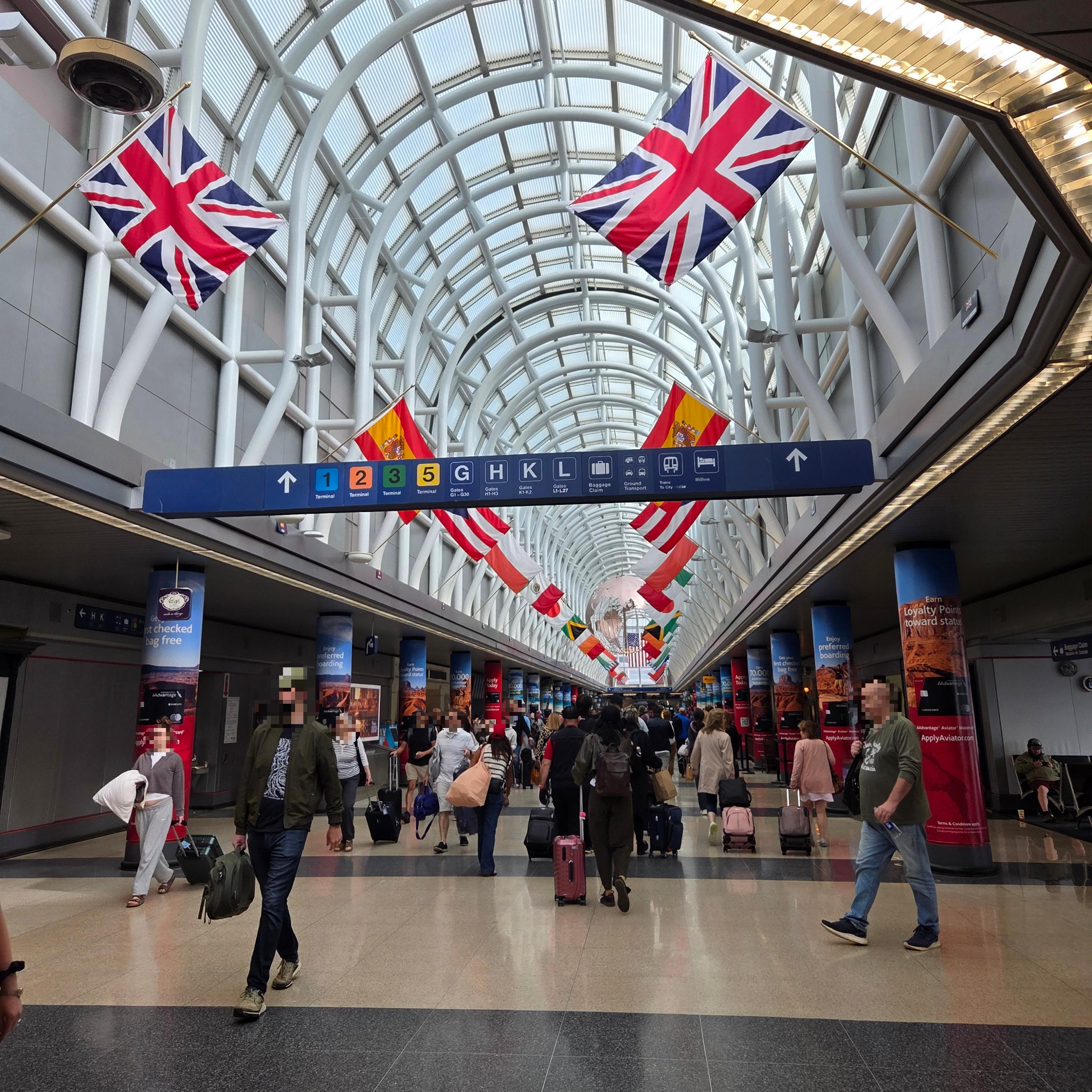 AA1064편은 예정된 시간보다 조금 이른 8시 30분에 게이트에 도착했습니다. 미국 국내선은 도착승객들의 공간을 따로 분리하지는 않기에 국내선 에어사이드로 나오게 되고요, Baggage Claim 사인을 따라 나가면 랜드사이드로 나오게 됩니다. 아메리칸항공은 시카고 오헤어 국제공항 제3터미널을 이용하고 있기에 시카고 시내로 바로 연결되는 블루 라인 공항역까지 걸어서 이동할 수 있습니다. 단, 시카고 오헤어 국제공항의 모든 국제선 도착은 5 터미널에서 처리하기 때문에 국제선으로 입국하신다면 블루라인을 이용하기 위해서 공항 순환 열차를 타고 이동하셔야 합니다.