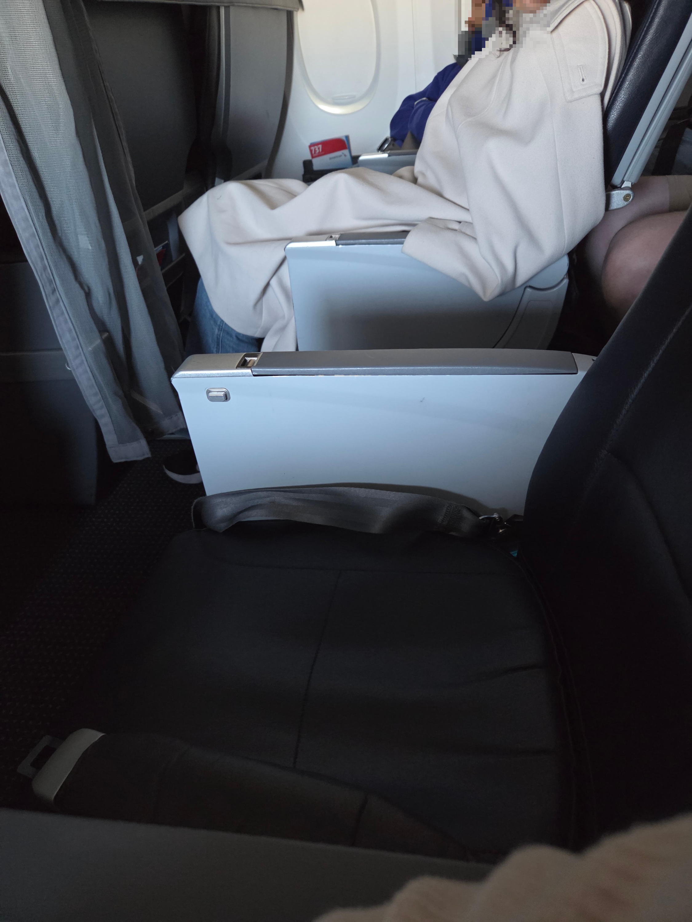저는 8B좌석에 탑승했는데요, 아메리칸 항공의 일등석 캐빈과 이코노미석 캐빈은 두 캐빈을 물리적으로 나누는 벽 대신 상부만 파티션으로 나뉘어 있습니다. 따라서 일등석 바로 뒤쪽에 있는 8열의 경우 일등석 좌석 아래로 다리를 넣을 수 있습니다. 따라서 완전히 캐빈이 분리되어 있는 경우보다 발쪽 공간을 더 넓게 쓸 수 있기에 개인적으로 아주 선호하는 좌석 중 하나입니다. 대신 테이블이 앞 좌석이 아닌 팔걸이 부분에서 꺼내는 방식이라 좌석 폭이 약간 작고, 팔걸이를 들어 올릴 수 없다는 단점이 있습니다. 또 다른 단점은, 앞 좌석이 일등석 좌석이기에 휴대폰을 거치하고 동영상을 볼 수 있는 디바이스 홀더가 없다는 점입니다. 때문에 손에 들고 보거나 테이블 위에 올려놓고 봐야 한다는 점이 불편하고, 특히 8열의 중앙 좌석의 경우 앞 좌석 바스켓을 사용하기 어렵다는 점도 불편한 점 중 하나입니다.