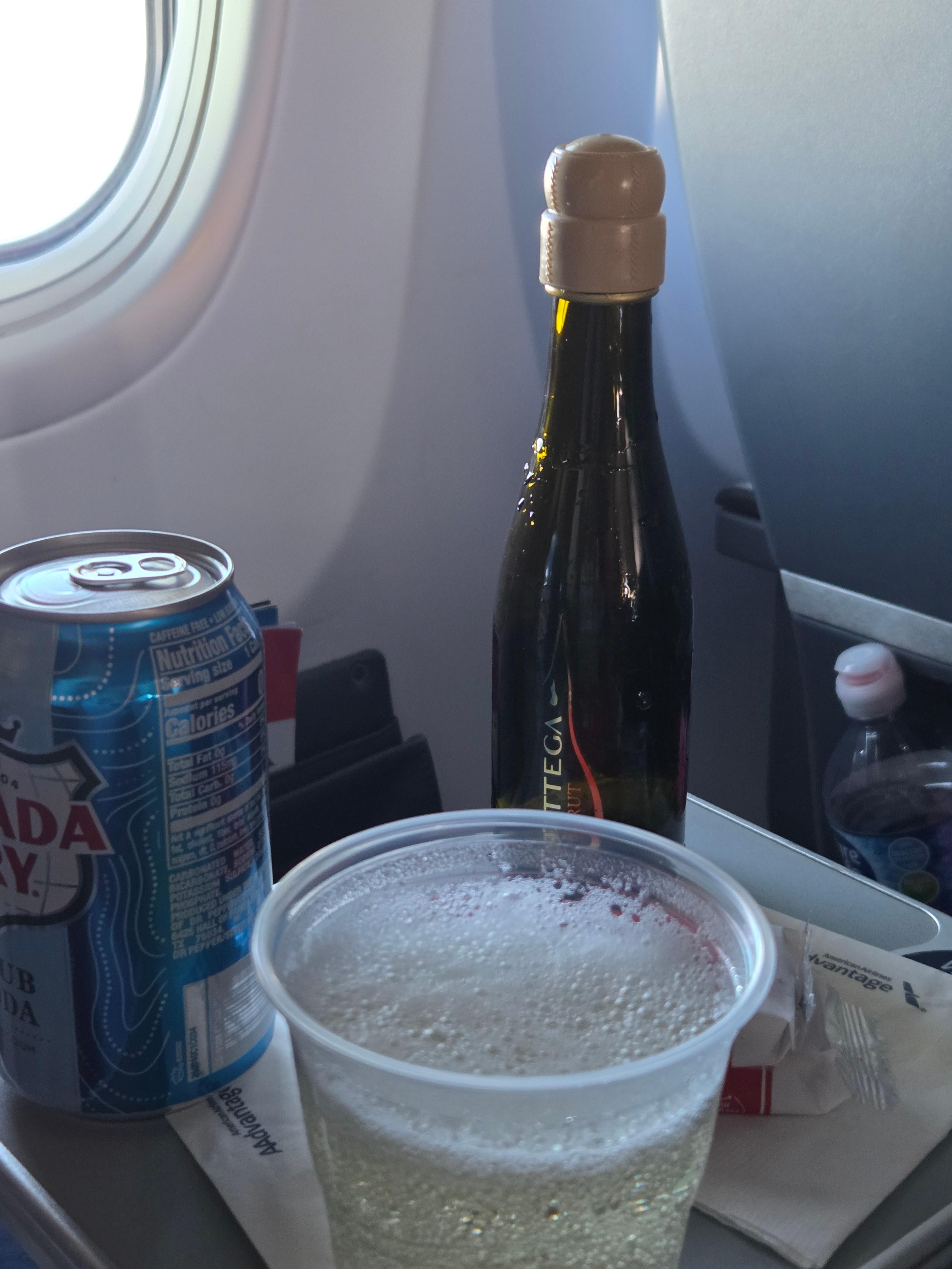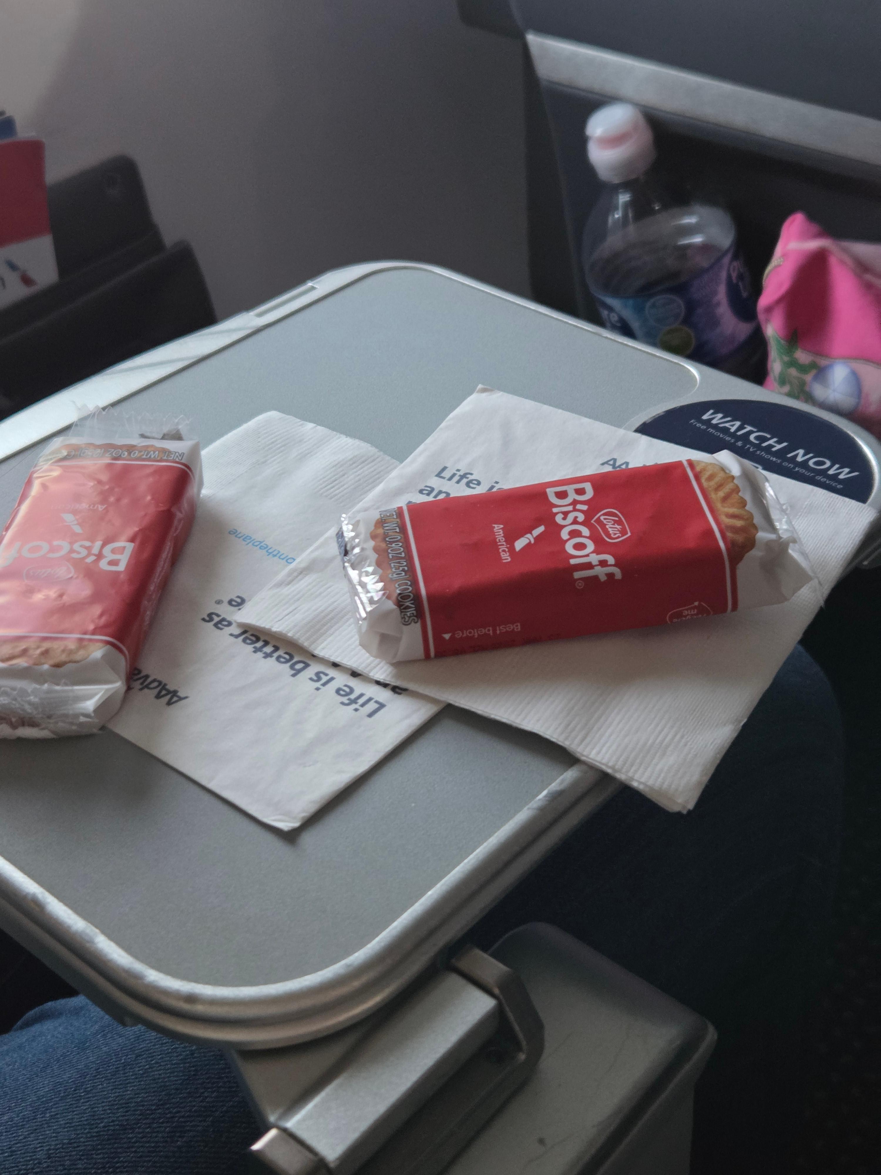 아메리칸 항공은 250마일 이상 노선의 국내선 이코노미 클래스에서는 음료 서비스를 1회 진행합니다. 출발 후 순항고도에 들어서면 음료 서비스가 시작됩니다. 기본적으로는 콜라, 다이어트 콜라, 제로 콜라, 닥터 페퍼, 아이어트 닥터 페퍼, 스프라이트, 다이어트 스프라이트, 클럽 소다, 토닉 워터, 진저에일 등의 소프트드링크와 커피, 디카페인 커피 블랙티, 사과 주스, 오렌지 주스, 크렌베리 주스, 토마토 주스, 물 등을 무료로 제공합니다. 메인 캐빈 엑스트라 좌석의 경우 여기에 더해 주류도 무료로 주문할 수 있습니다. 주문할 수 있는 주류는 레드와인, 화이트 와인, 스파클링 와인과 맥주, 진, 럼, 위스키, 보드카 등의 고도주가 포함되어 있습니다. 스낵으로는 비스코프 쿠키와 프레젤을 제공합니다. 저는 스파클링 와인과 클럽소다 비스코프 쿠키를 받았습니다. 참고로 소프트드링크나 커피 같은 것들은 두 개를 달라고 해도 잘 주시는 편입니다. 또한 기내에서 판매하는 스낵도 있지만, 국내선에서 따로 배를 채울만한 핫푸드는 판매하고 있지 않기 때문에 미리 끼니를 해결하시고 탑승하시는 걸 추천드립니다. 사전 주문으로 핫푸드를 선택할 수 있는 알래스카 항공과 같은 항공사에 비하면 아쉬운 부분입니다.