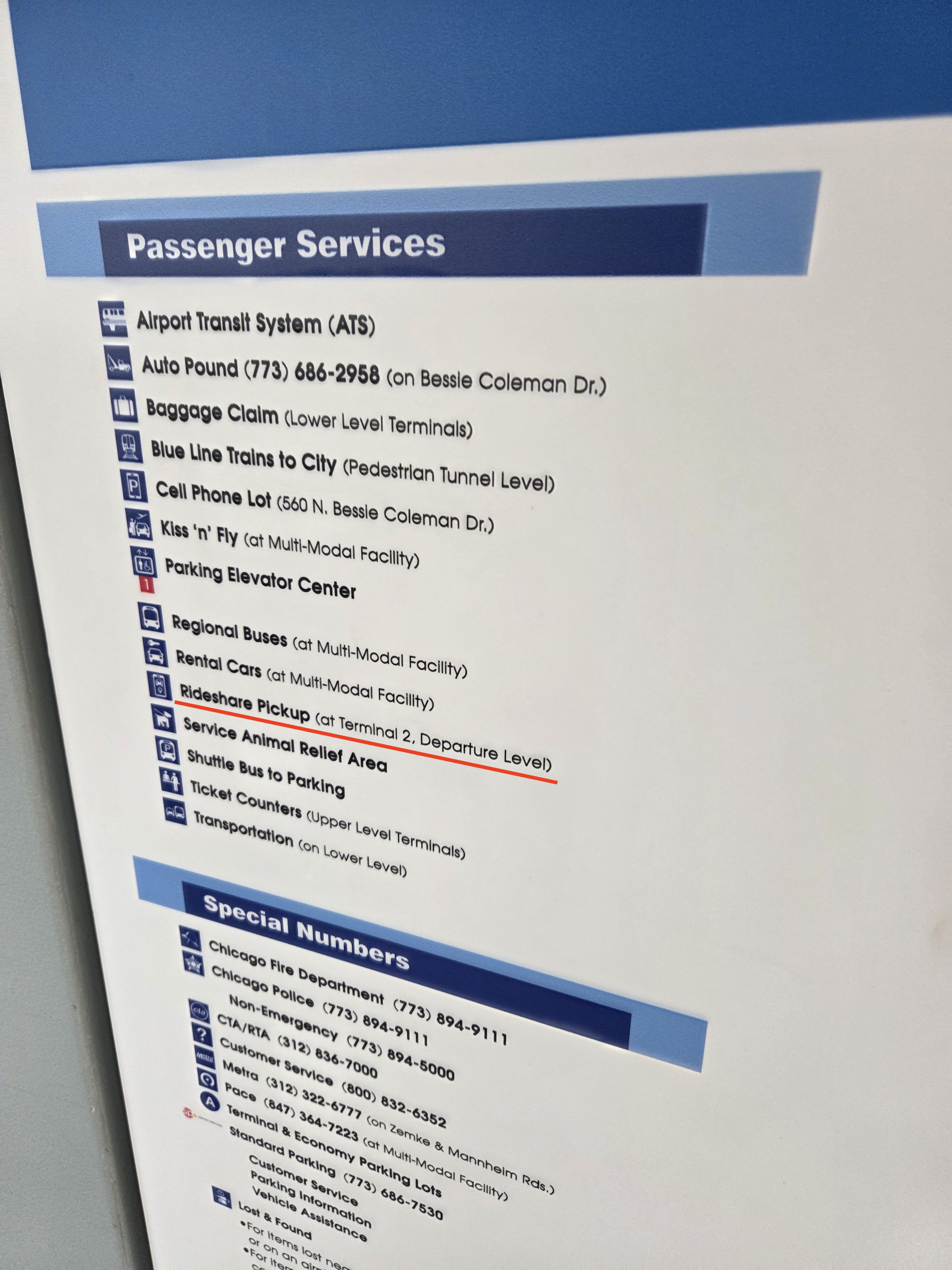 저는 이번에는 우버를 타고 시카고 시내로 이동했습니다. 시카고 오헤어 국제공항의 라이드 셰어 픽업존은 2터미널 출발층에 마련되어 있습니다. 시카고 오헤어 국제공항 3 터미널에서 2 터미널로 이동하는 방법은 두 가지가 있습니다. 하나는 걸어서 이동하는 방법입니다. 3 터미널의 출발층 건물 밖으로 나오면 외부로 바로 2 터미널로 연결이 되기에 어렵지 않게 이동할 수 있습니다. 다른 하나는 공항 순환 열차를 타는 방법입니다. 3 터미널 출발층에서 한층 더 올라가면 공항 순환 열차 승강장으로 이동할 수 있습니다.  3 터미널에서 2 터미널 사이의 이동거리는 1분 남짓이지만 에스컬레이터를 타고 승강장으로 이동하여 열차에 탑승하고, 다시 열차에서 내려 터미널 건물로 이동하는 시간이나, 걸어서 2 터미널로 이동하는 시간이나 별로 차이가 나지 않기에 짐이 많지 않다면 걸어서 이동하는 걸 추천드립니다.