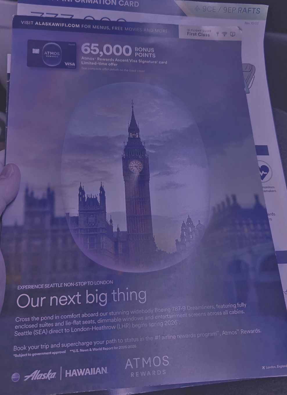 앞 좌석에는 별도의 기내 엔터테인먼트 스크린이 설치되어 있지 않았으며, 앞 좌석 하단 수납 공간에는 알래스카 항공의 엘리트 프로그램인 Atmos Rewards 소개 책자와 세이프티 카드가 비치되어 있었습니다. Atmos Rewards 안내 책자에는 기내에서 주문할 수 있는 주류 및 음료 목록과 기내 와이파이 이용 안내가 함께 포함되어 있었습니다.