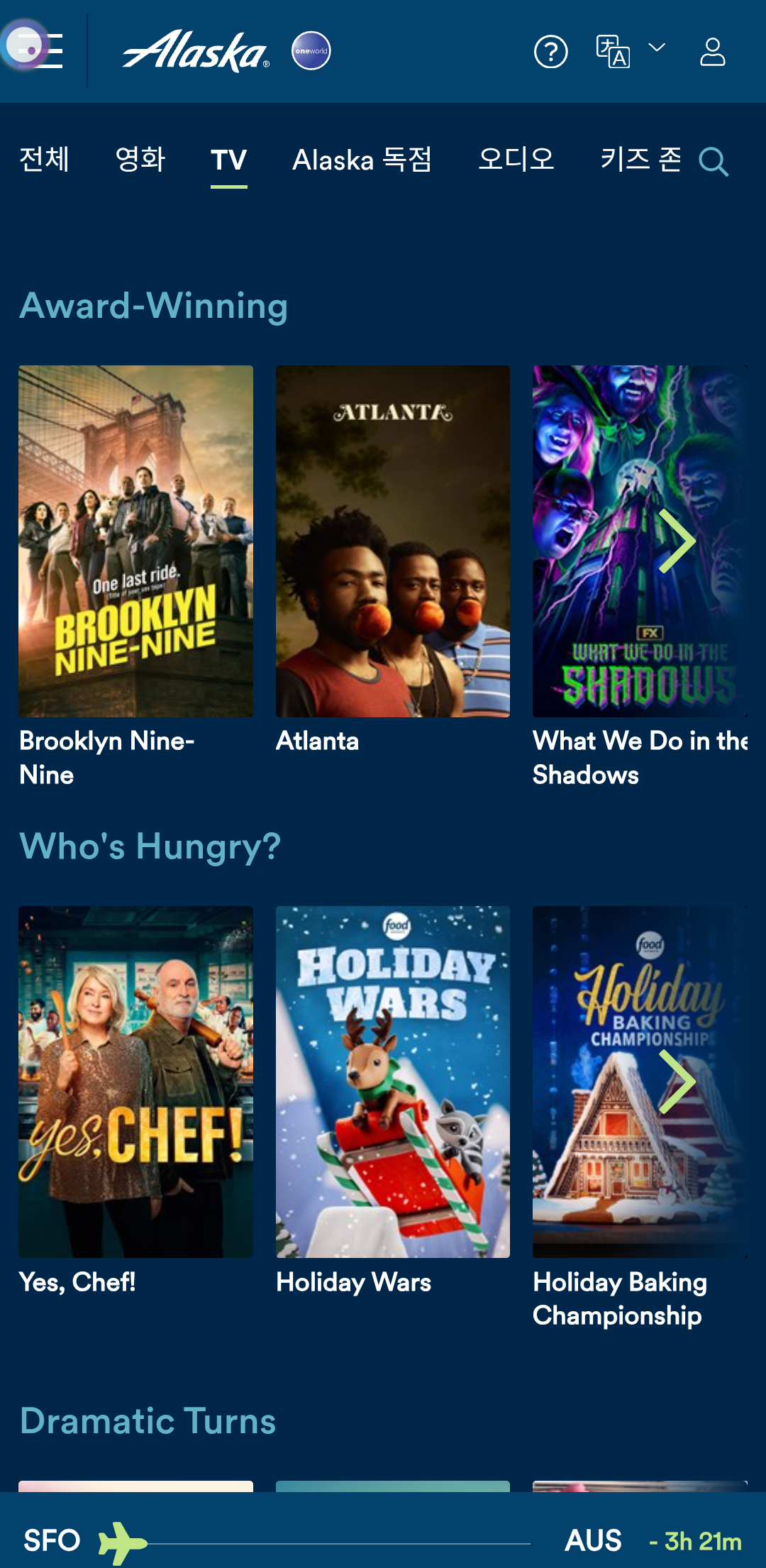 알래스카 항공 기내 엔터테인먼트 시스템 알래스카 항공의 협동체 항공기에는 별도의 기내 엔터테인먼트 스크린이 설치되어 있지 않습니다. 대신 기내 와이파이에 연결해 개인 디바이스로 콘텐츠를 이용하는 BYOD(Bring Your Own Device) 방식의 엔터테인먼트를 제공합니다. 알래스카 항공의 안내에 따르면 1,000개 이상의 영화와 TV 시리즈가 탑재되어 있다고 하는데, 체감상 선택지가 아주 풍부한 느낌은 아니었지만 3~4시간 정도의 비행 동안 이용하기에는 충분한 수준이었습니다. 제한적이지만 비행지도도 제공된다는 점은 괜찮았고요. 최근 알래스카 항공이 인천-시애틀 노선을 통해 한국에도 취항하면서, 기내 엔터테인먼트 시스템에 한글이 지원된다는 점도 인상적이었습니다.