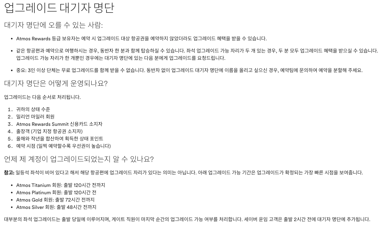 알래스카 항공 업그레이드 대기자 명단 정책 (c) alaskaair.com 알래스카 항공은 미국 국내선 노선에서 알래스카 Atmos 엘리트 회원과 아메리칸항공 AAdvantage 엘리트 회원을 대상으로 일등석 업그레이드 정책을 운영하고 있습니다. 알래스카 항공의 자사 엘리트 프로그램인 Atmos 엘리트 회원이 특정 운임 클래스 이상의 운임을 구매하는 경우 구매와 동시에 업그레이드가 이루어지며, 그 외 운임의 경우 업그레이드 대기 목록에 올라가 회원 등급에 따라 순차적으로 업그레이드가 확정되는 구조입니다. 회원 등급에 따라 최대 출발 120시간 전에 업그레이드가 확정되기도 하며, 경우에 따라 게이트 앞에서 업그레이드가 확정되기도 합니다. 아메리칸항공의 엘리트 프로그램인 AAdvantage 회원 역시 알래스카 항공편 탑승 시 동일한 혜택을 받을 수 있습니다. 저는 AAdvantage 회원 혜택으로 출발 하루 전에 업그레이드가 확정되었고, 함께 여행한 동반인 1명도 함께 업그레이드를 받았습니다. 참고로 업그레이드가 확정된 이후에는 좌석이 자동으로 배정되며, 이후에도 빈 일등석 좌석이 있다면 좌석 지정을 변경할 수 있습니다.