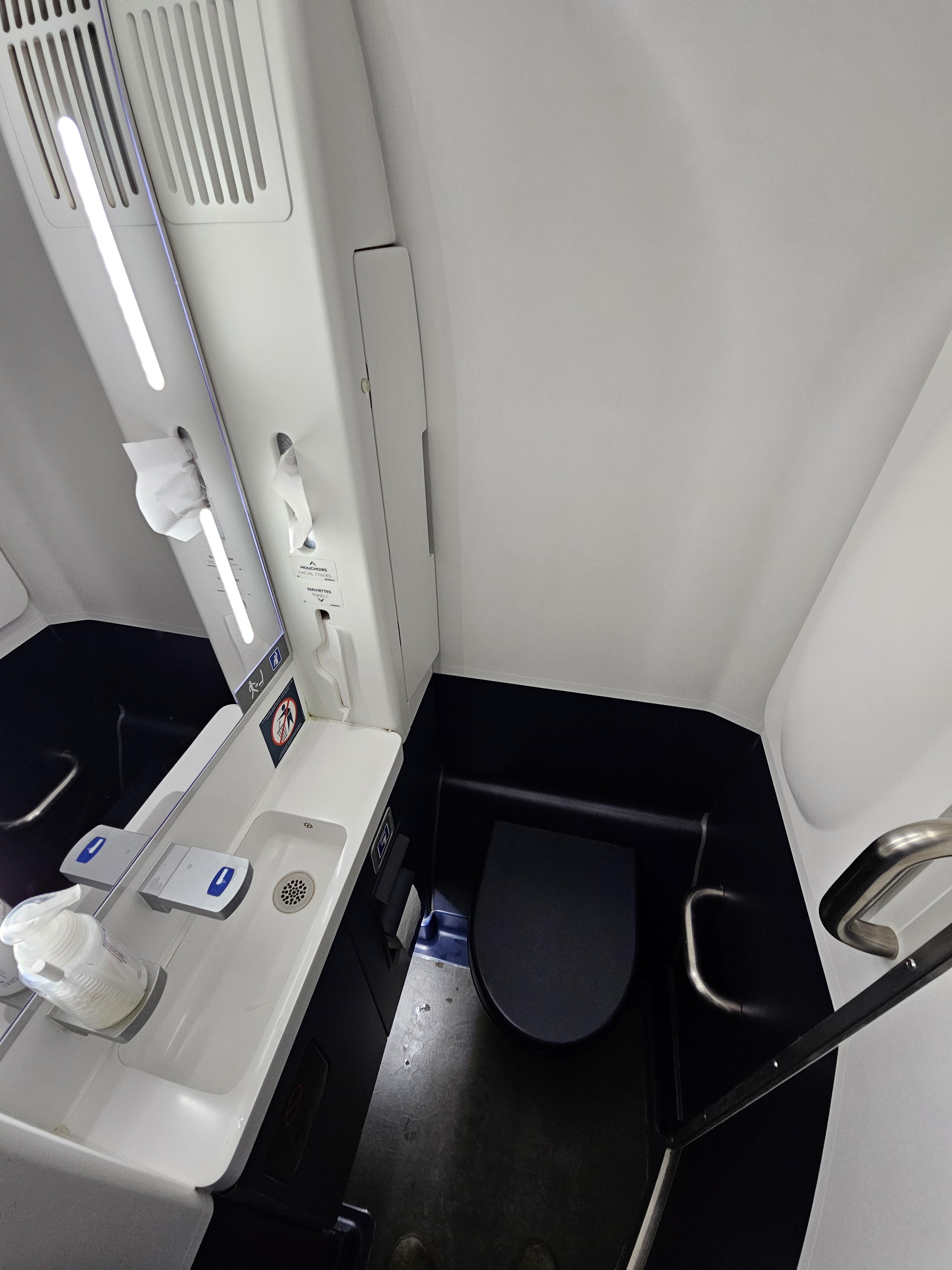 에어프랑스 A220-300 화장실 위치 image courtesy of aeroLOPA (좌), 에어프랑스 A220-300 화장실(중, 우) 화장실은 비즈니스 승객용이 캐빈 앞에 하나, 이코노미 승객용이 캐빈 뒤에 두개가 있습니다. 참고로 두 개의 화장실 중 벽쪽에 가까운 화장실이 조금 더 큰 화장실입니다. 특별할 것 없는 무난한 화장실이었습니다.
