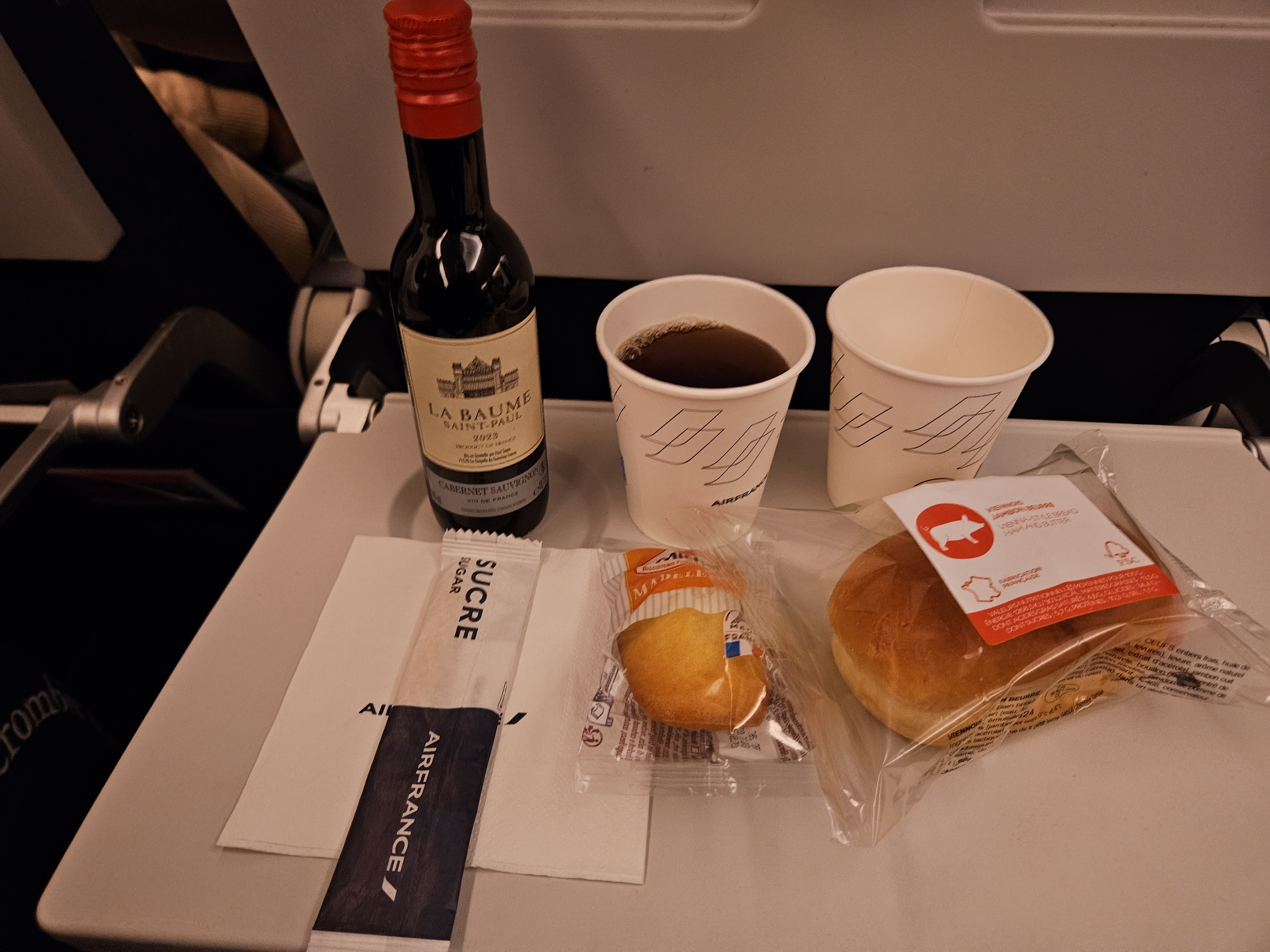 기내식으로는 간단한 잠봉뵈르 샌드위치와 마들렌이 제공되었습니다. 사실 이것부터가 굉장히 프랑스스럽긴 합니다. 프랑스 국민 샌드위치인 잠봉뵈르, 그리고 프랑스의 대표적인 디저트인 마들렌이라니. 맛과 퀄리티를 떠나서 메뉴 선정부터 굉장히 프렌치스러운 느낌입니다. 당연히 음료 서비스 때는 레드 와인을 골랐습니다. 프랑스 하면 바로 와인이니까요. 승무원은 제게 종이컵과 더불어 187ml짜리 작은 와인병을 통째로 건넸습니다. 아마 술을 좋아하시고 와인을 좋아하시는 분이라면 제가 어떤 감정을 느꼈는지 짐작하실 겁니다. 솔직히 얼마 안되는 작은 병이지만 병을 통채로 준다는 건 아주 감동이니까요. 저는 와알못이긴 하지만, 제가 이 날, 에어프랑스 항공기에서 마신 와인은 그동안 비행을 하면서 마셨던 와인 중에 가장 맛있는 와인이었습니다. 어쩌면, 이 프렌치스러운 분위기와 메뉴 때문에 그랬을 수도 있지만 그날 느꼈던 느낌은 ‘에어프랑스는 이코노미 클래스에 들어가는 와인 하나도 허투루 고르지 않구나’였습니다. 어쩌면 이게 프랑스 사람들의 생활양식일 수도 있고요.