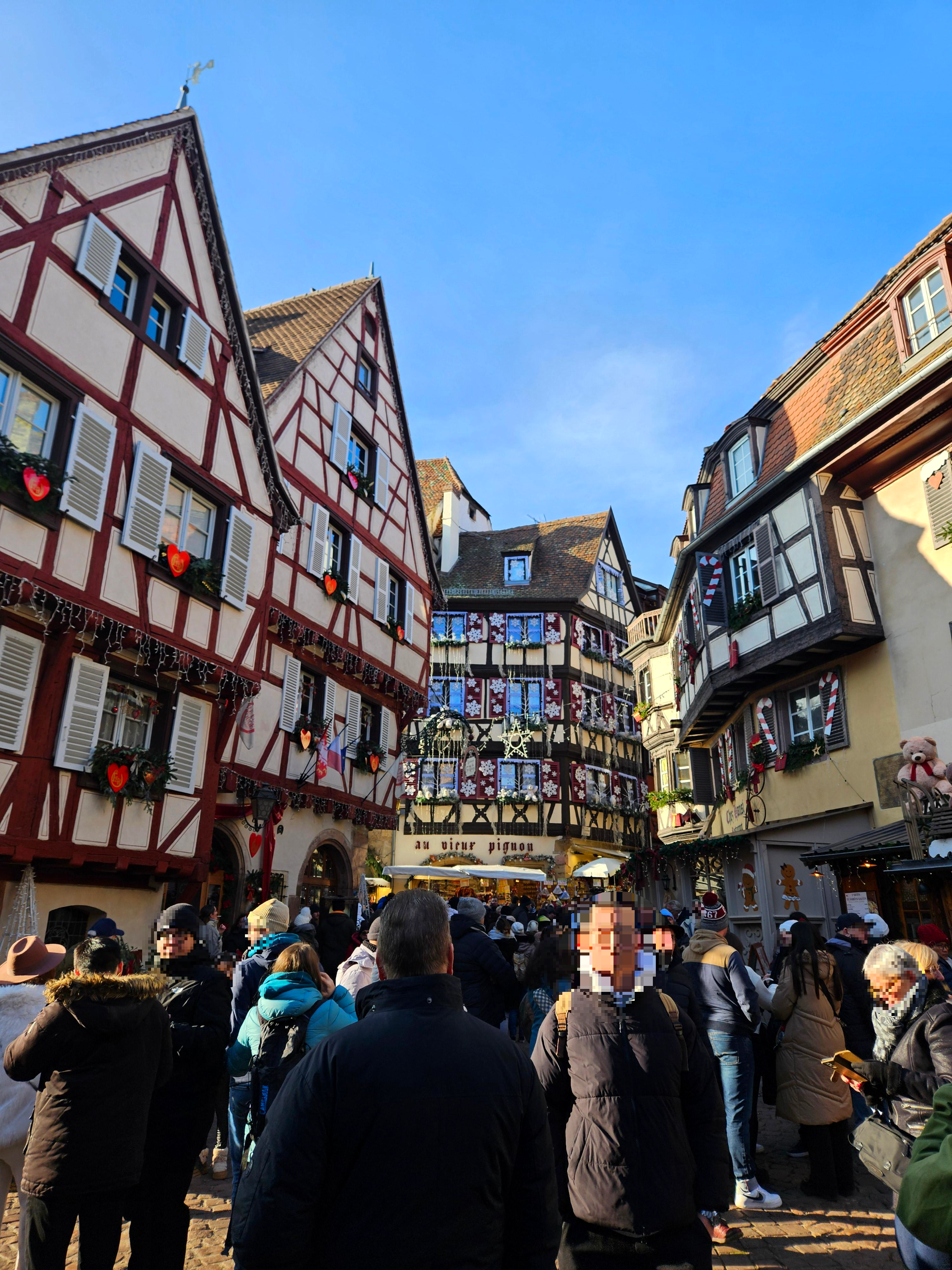 본격적으로 콜마르 올드타운에 들어가자 금세 수많은 사람에 휩쓸립니다. 그럼에도 콜마르 특유의 동화 같은 풍경이 눈앞에 펼쳐집니다. 스크린으로만 봤던 알록달록한 목조 건축물들과, 그 사이를 흘러가는 작은 베니스라는 뜻의 쁘띠 베니스, 그리고 대표적인 고딕양식의 성당인 생마르탱 성당까지. 파리와 같은 대도시에서 볼 수 없는 작은 도시만의 아기자기하면서도 화려한 풍경이 제가 왜 그렇게 콜마르에 가고 싶어 했는지 설명해 줍니다. 사실 콜마르에서 할 수 있는 것들이 많지는 않습니다. 특히 크리스마스 마켓이 열리는 시즌에는 훨씬 많은 사람들이 방문하는 마을이기에, 식당에서 밥을 먹는데도, 콜마르를 가로지르는 로슈강을 오가는 배를 타는데도 많은 시간을 기다려야 하니까요. 알자스 지방의 전통 음식들 대신, 한편에 마련된 크리스마스 마켓에서 대충 요기를 때워야 했고, 멈춰 서서 천천히 마을을 둘러보고 싶어도 수많은 인파에 의지와 상관없이 끊임없이 이동해야 했지만, 그래도 콜마르에 오기를 잘했다는 생각이 들었습니다.