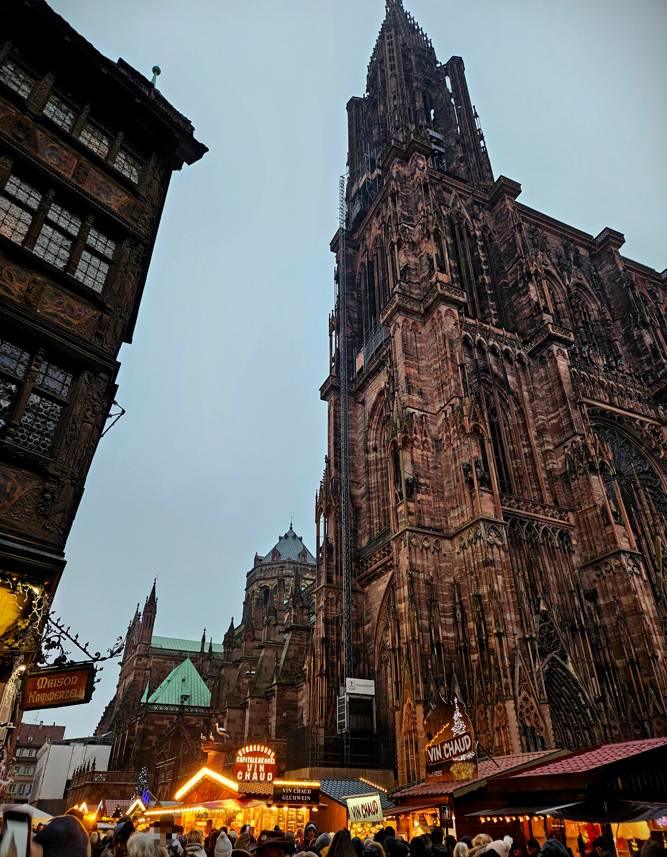 클레베르 광장을 지나 노트르담 성당으로 가는 골목은 빽빽한 크리스마스 장식과 더불어 빽빽한 사람들이 함께 공간을 메우고 있습니다. 자연스럽게 움직이는 흐름에 몸을 맡기다 보면 자연스럽게 노트르담 성당으로 향하게 됩니다. 높은 건물이 많지 않은 스트라스부르 구시가지에서 하늘 높게 솟아있는 노트르담 성당은 그야말로 압도적인 모습을 보여주는데요, 고딕양식의 정수를 보여주는 건물답게 그야말로 하늘을 찌를듯한 당당함을 보여주고 있습니다. 노트르담 성당 근처에도 수많은 샬레들이 자리 잡고 있는데요, 몸을 조금 덥히고 싶다면 뱅쇼를 한잔 마시는 것도 좋은 선택입니다.