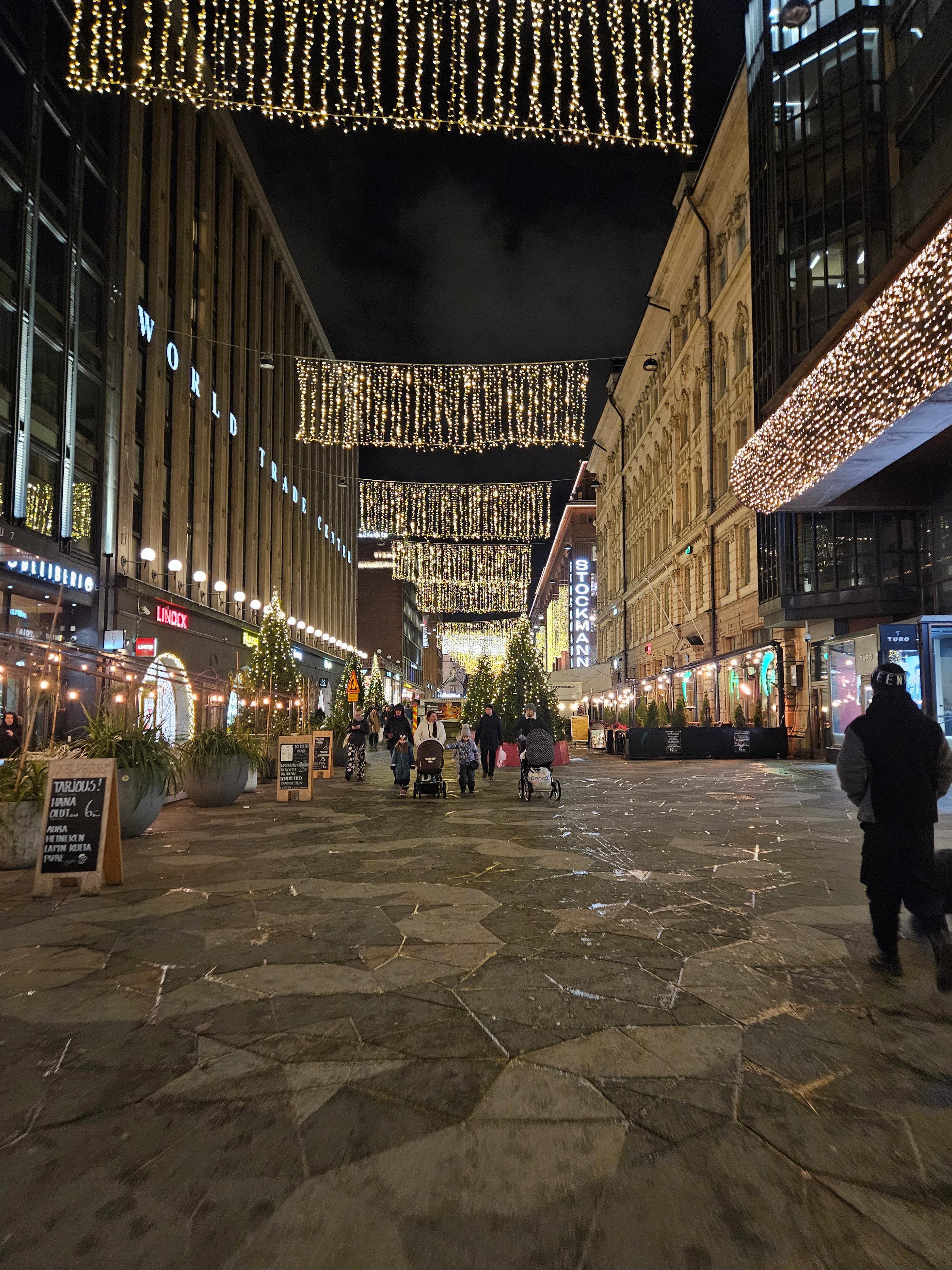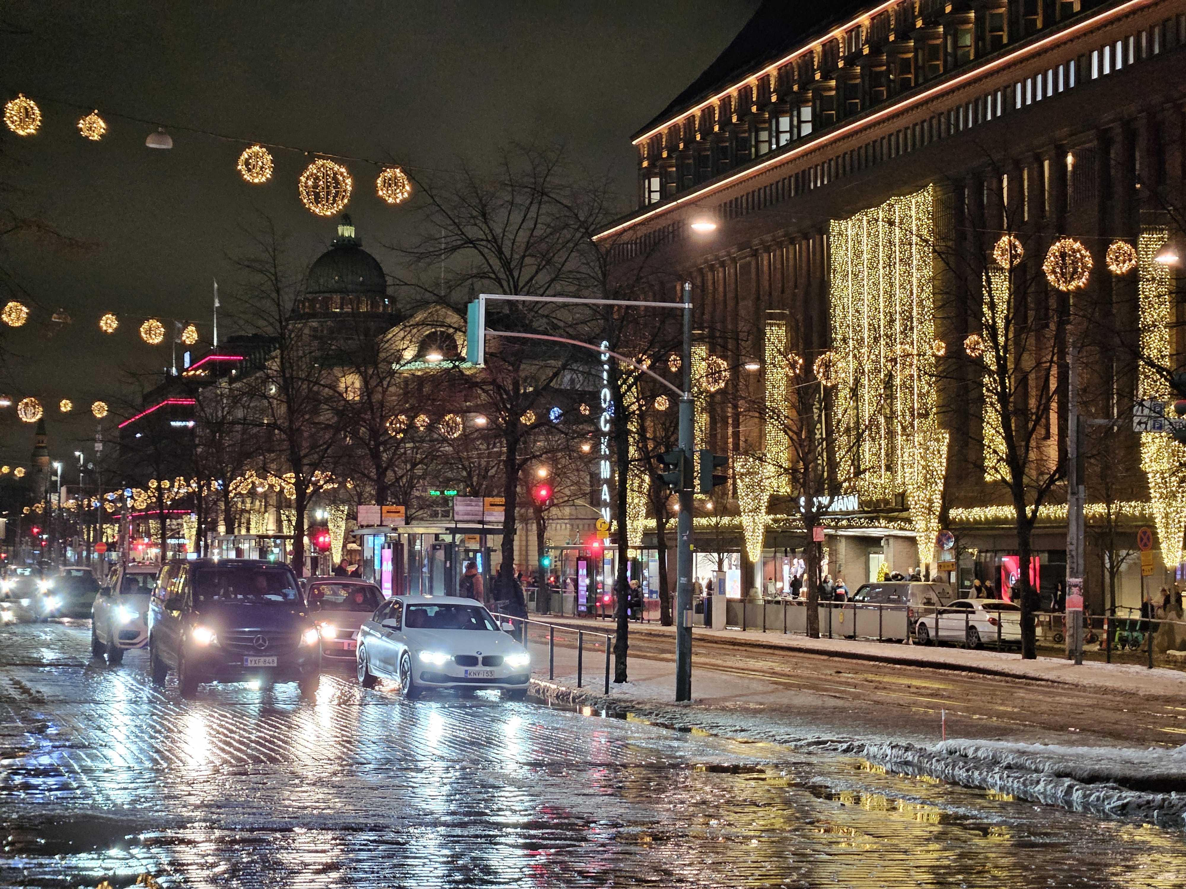 헬싱키는 핀란드의 다른 지역에 비하면 매우 남쪽에 위치하고 있습니다. (그럼에도 북위 60도에 위치하고 있는데 다른 대륙에 비하면 상당히 높은 편입니다. 당장 한국만 해도 38도 이남에 위치하고 있고, 겨울로 유명한 삿포로도 겨우 43도 정도입니다.) 덕분에 헬싱키도 겨울에는 9시가 넘어서 해가 뜨고 3시가 지나면 해가 질 정도로 낮이 짧아지기도 합니다. 이정도면 겨울나라의 수도라고 해도 부족함이 없습니다. 헬싱키에서 가장 눈에 띈 것은 거리 곳곳에 반짝이는 트리와 장식들이었습니다. 제가 헬싱키를 방문한 시기는 11월 말로 아직 본격적인 크리스마스 시즌도 시작되지 않았던 때였지만 (실제로 헬싱키 대성당 앞에 막 크리스마스 마켓을 만들고 있는 중이었습니다.) 충분히 겨울과 크리스마스 분위기를 느낄 수 있었습니다. 특히 스톡만 백화점에서 헬싱키 마켓광장으로 이어지는 길과 헬싱키 역 부근은 그야말로 부족한 햇빛이 아깝지 않을 정도로 밝은 수준이었습니다. 아마도 짧은 낮 시간과 긴 밤 덕분이지 않을까 싶습니다. 한번 장식을 설치하면 오후 네시부터 꽤 오랜 시간 불을 켤 수 있기에 충분히 장식을 즐길 수 있을뿐더러, 이렇게나마 짧은 낮의 아쉬움을 달래는 게 아닐까 하고요.