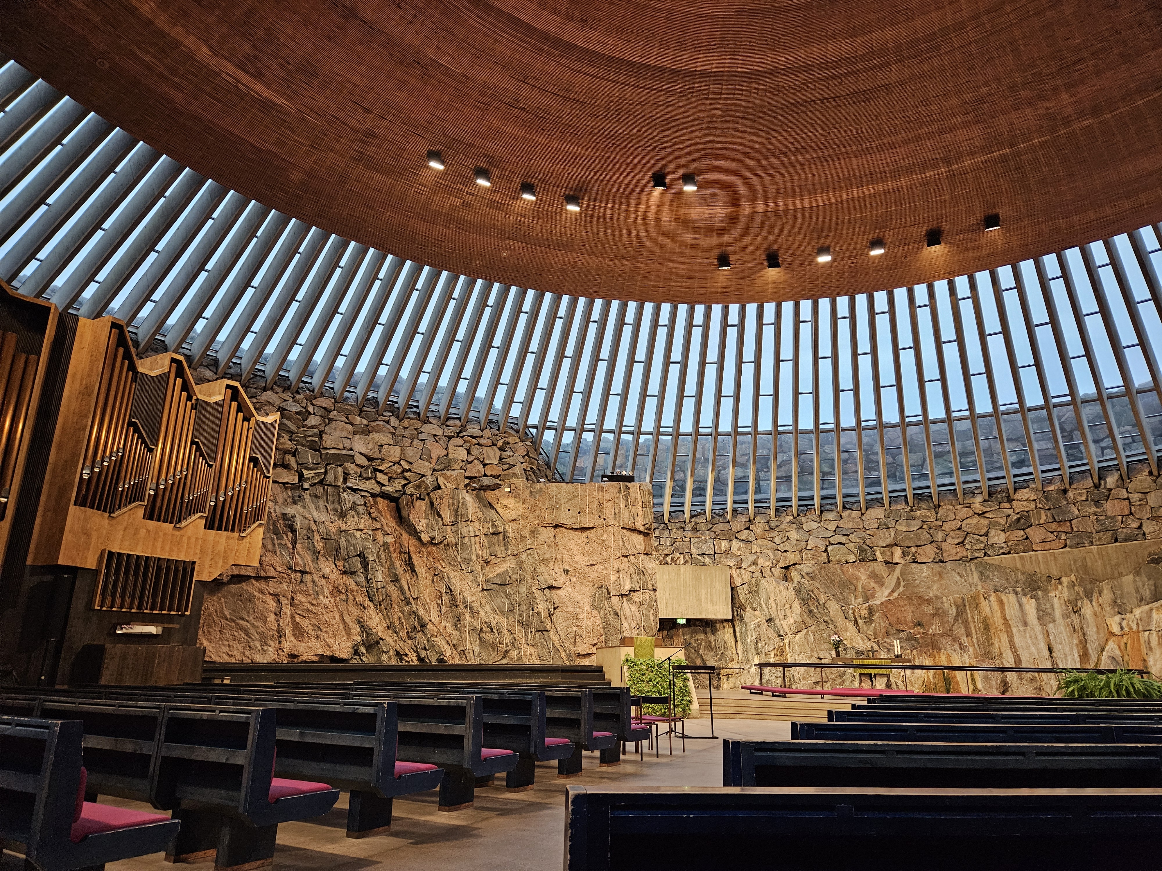 이런 크리스마스 느낌의 느낌표는 템펠리아우키오 교회였습니다. 암석을 파고 그곳에 세운 교회. 혹자는 이 교회를 디자인 한 수오말레이넨 형제 중 동생이 핀란드 국방성에 근무했었고, 그 때문에 지하요새에 익숙했기에 이런 교회에 대한 아이디어를 얻었다고 생각하기도 합니다. 제 생각은 이 생각과 비슷할수도, 약간은 다를 수도 있습니다. 추운 지역에서 바닥을 파서 그곳에 몸을 숨기면 약간의 지열과 더불어 바람을 막을 수 있기 때문에 따뜻하게 지낼 수 있습니다. 핀란드에서 이런 방식을 활용했는지는 모르겠지만, 템펠리아우키오 교회의 내부로 들어갔을 때 처음 들었던 느낌은 딱, 겨울 추위를 피해 땅 아래로 몸을 숨긴 느낌이었습니다. 아마도 이 건물을 디자인한 수오말레이넨 형제가, 추운 지방에서 익숙한 땅을 파는 ‘지하’라는 개념을 활용하지 않았을까 하고 추측만 할 뿐입니다.