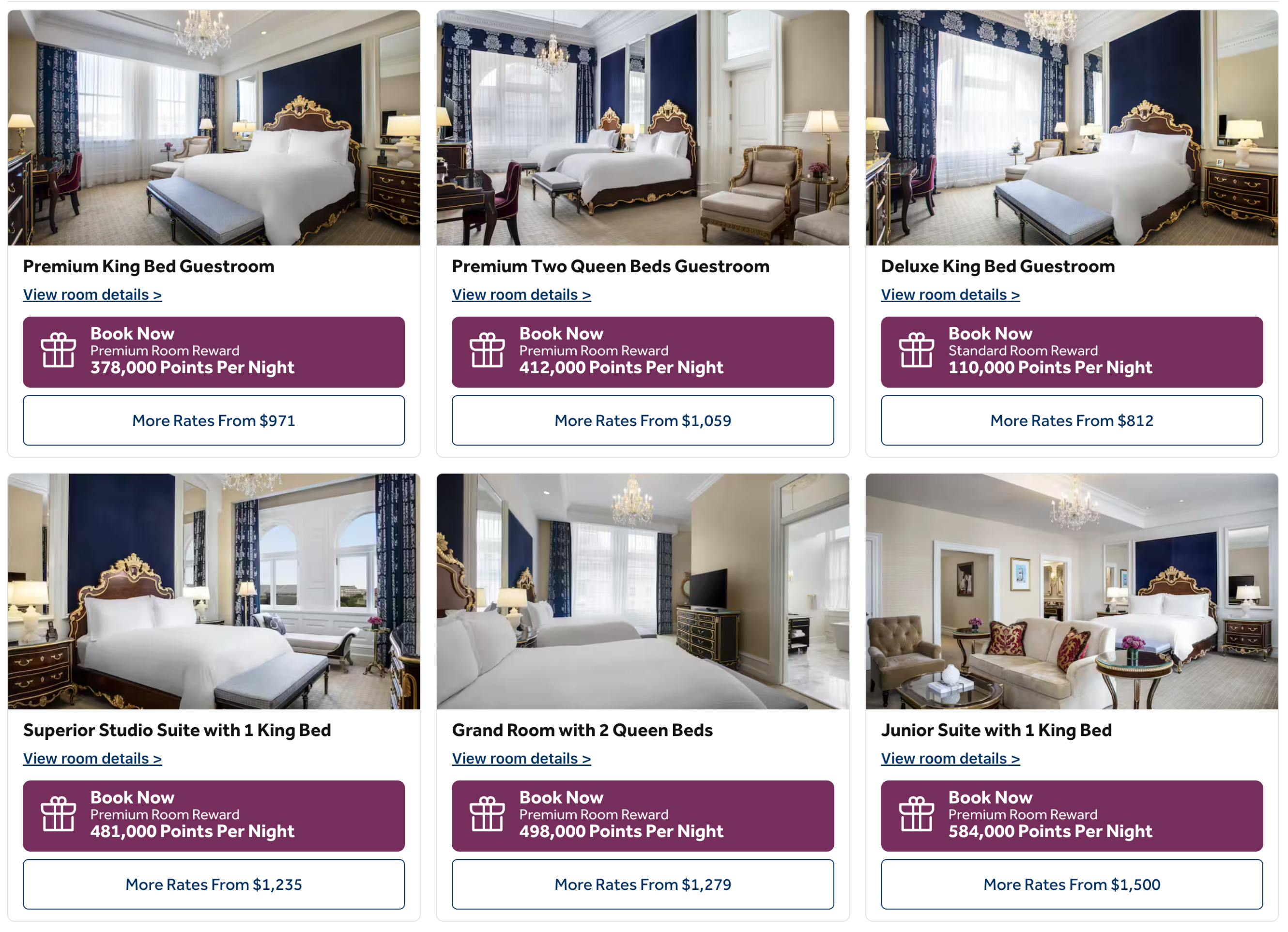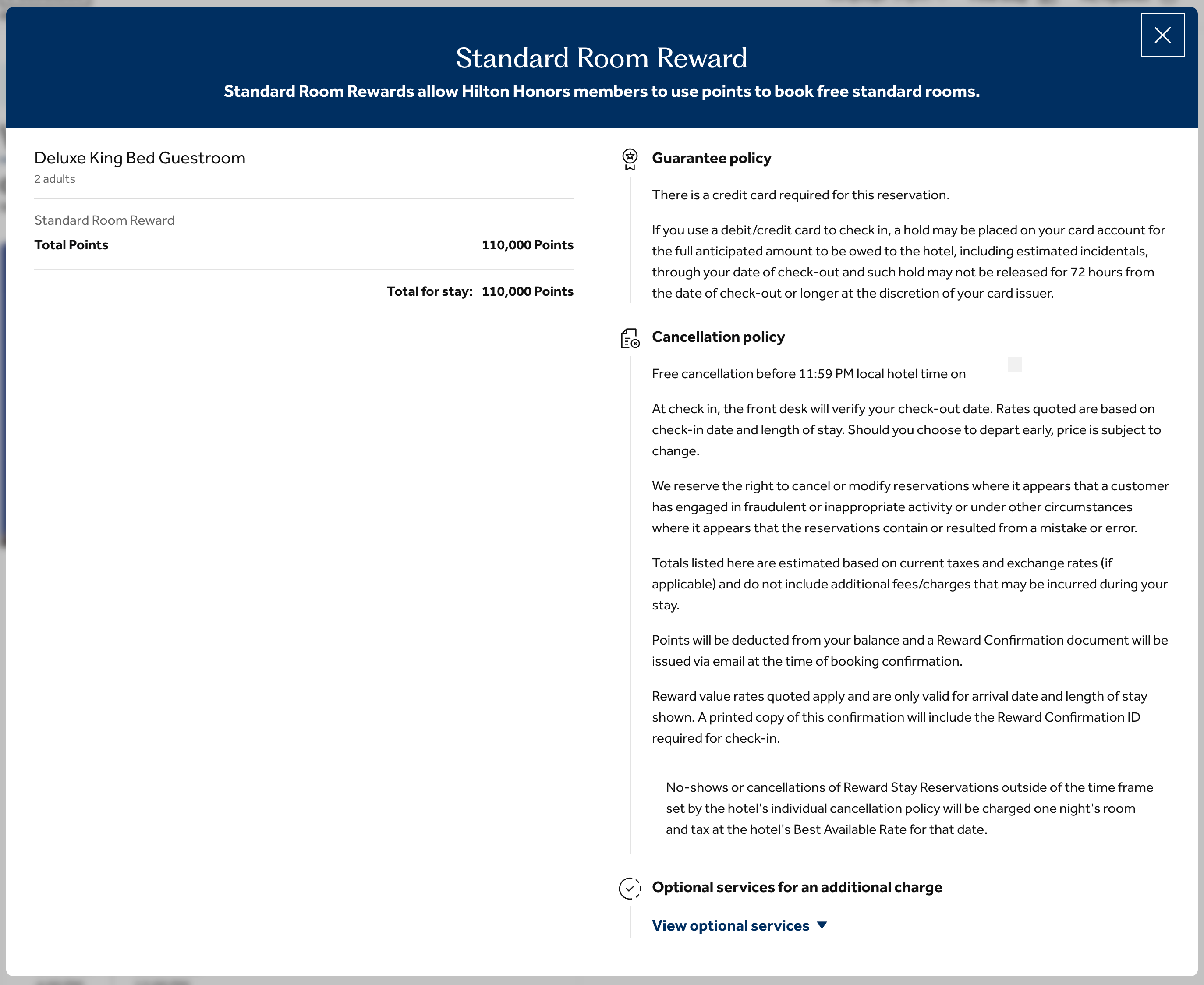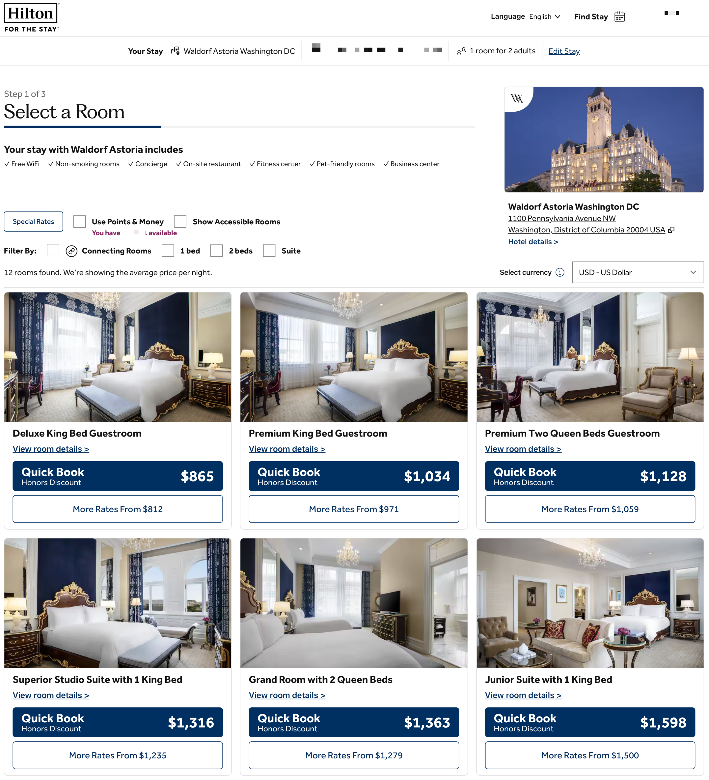 월도프 아스토리아 워싱턴 DC 예약 내역, image courtesy of Hilton 저는 이 호텔을 투숙 약 5달 전에 예약을 했습니다. 제가 예약하던 시점에는 디럭스 게스트 룸의 포인트 가격은 11만 포인트로 지금보다 1만 포인트 저렴했습니다. 저는 힐튼 숙박권을 이용해 예약을 했습니다. 힐튼 숙박권의 경우 Standard Room Reward가 가능한 방을 포인트 요구량과 상관 없이 예약할 수 있습니다. 따라서 Standard Room Reward 룸레이트가 가능하다면 포인트 가격이 2만 포인트이던, 18만 포인트이던 상관없이 무조건 예약이 가능합니다. 따라서 힐튼 숙박권을 이용한다면 포인트 가격이 비싼 방을 예약하는 게 이득이라고 할 수 있습니다.