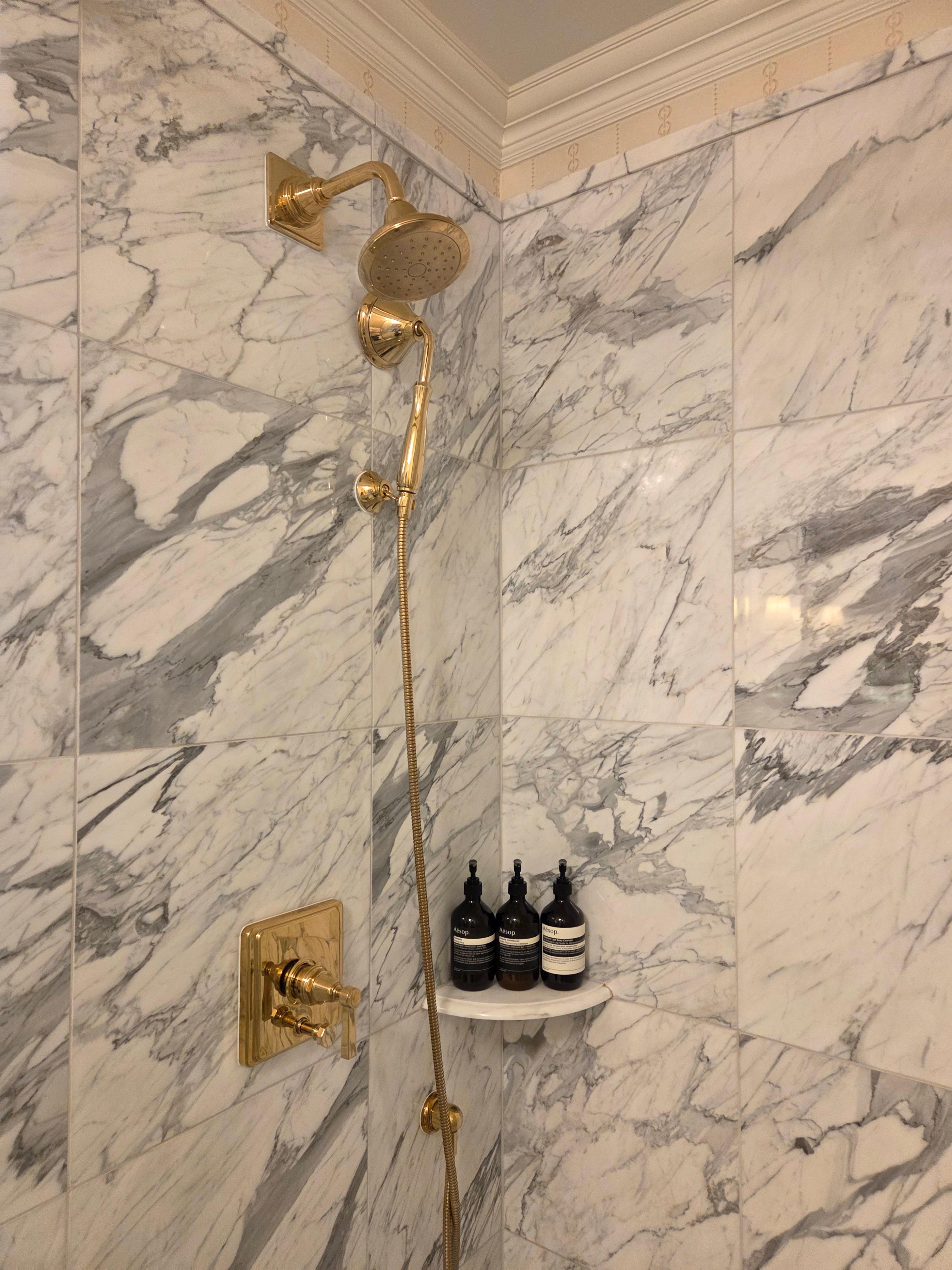 월도프 아스토리아 워싱턴 DC 디럭스 킹 베드룸 화장실 화장실은 어두운 대리석과 무늬가 선명한 대리석, 흰색과 골드톤을 사용해 상대적으로 톤 다운된 느낌을 주는 침실에 비해 화려한 인테리어를 자랑했습니다. 세면대는 2개가 있어서 2명이 동시에 양치를 하기에는 편했지만 변기가 세면대 바로 뒤 오픈된 공간에 위치하고 있어 2명이 동시에 화장실을 사용하기에는 조금 어려워 보였습니다. 샤워 부스는 타일 대신 대리석으로 마감되어 고급스러웠고 수압과 온수 모두 너무 잘 나와서 즐거운 샤워를 즐길 수 있었습니다.