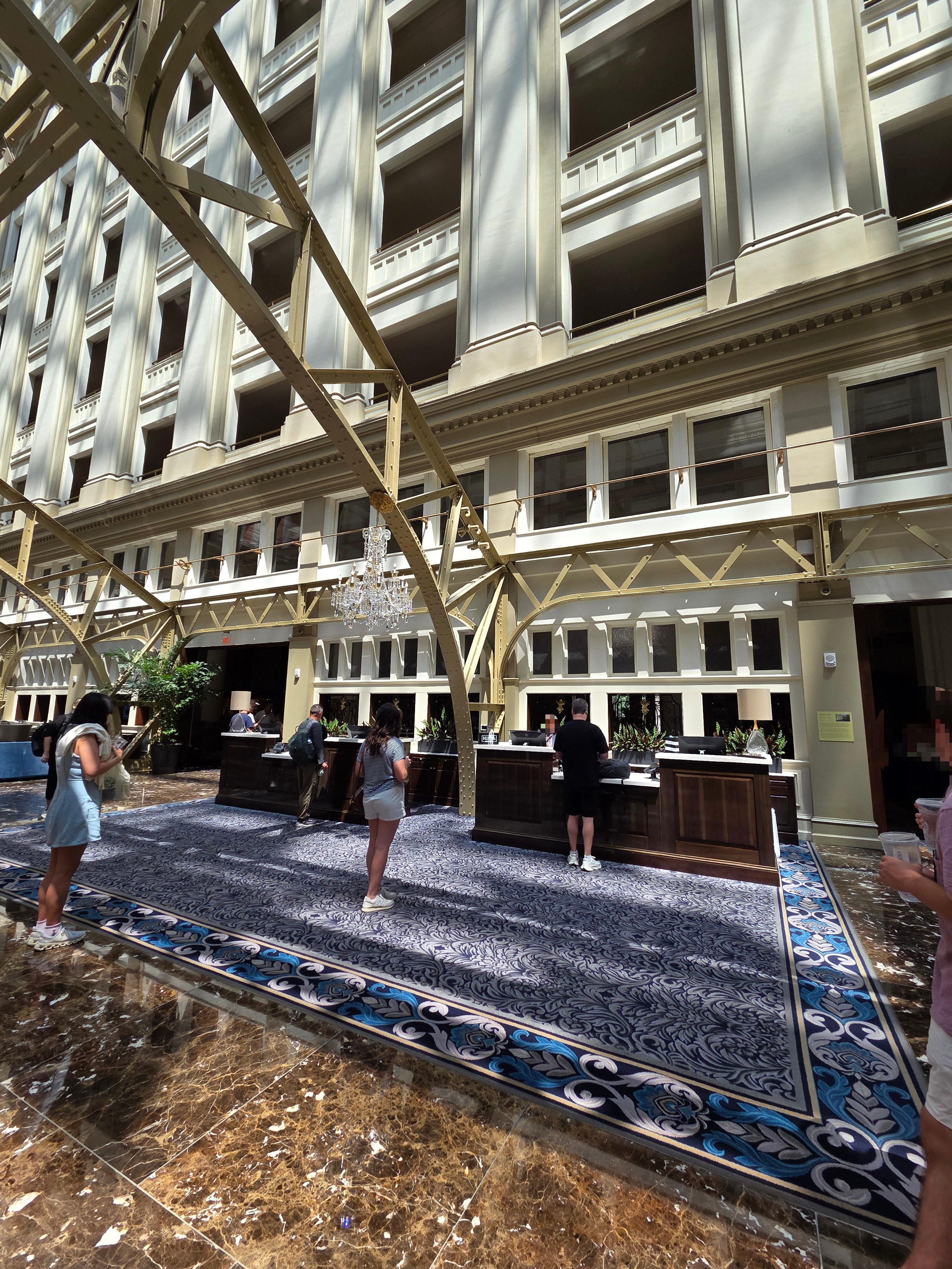 월도프 아스토리아 워싱턴 DC 외관 월도프 아스토리아 워싱턴 DC의 건물은 과거 1900년대 초반 우체국으로 이용되던 건물을 리모델링 한 건물입니다. 2016년에 레노베이션을 마친 후 트럼프 인터내셔널 호텔로 최초 개장을 했고, 2022년부터 힐튼의 월도프 아스토리아 브랜드로 운영되고 있습니다. 1899년에 준공된 건물답게 고풍스러운 외관이 인상적인 월도프 아스토리아 워싱턴 DC는 당시 워싱턴 DC에는 거의 없었던 철골 구조로 지어진 건물이었고, 최신식이었던 전기 엘리베이터가 설치되어 당시에는 현대 건축의 상징이라고 불리기도 했습니다. 준공 후 많은 리노베이션을 거쳤지만, 여전히 미국 국가 사적지로 등록되어 있는 만큼, 제가 꼭 한번 투숙하고 싶었던 호텔이기도 했습니다.